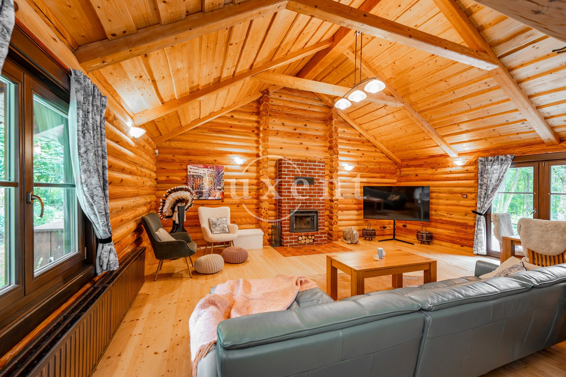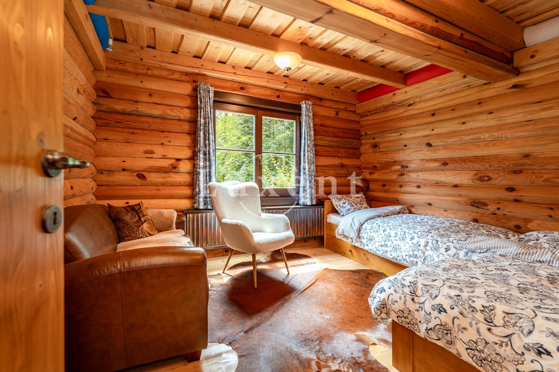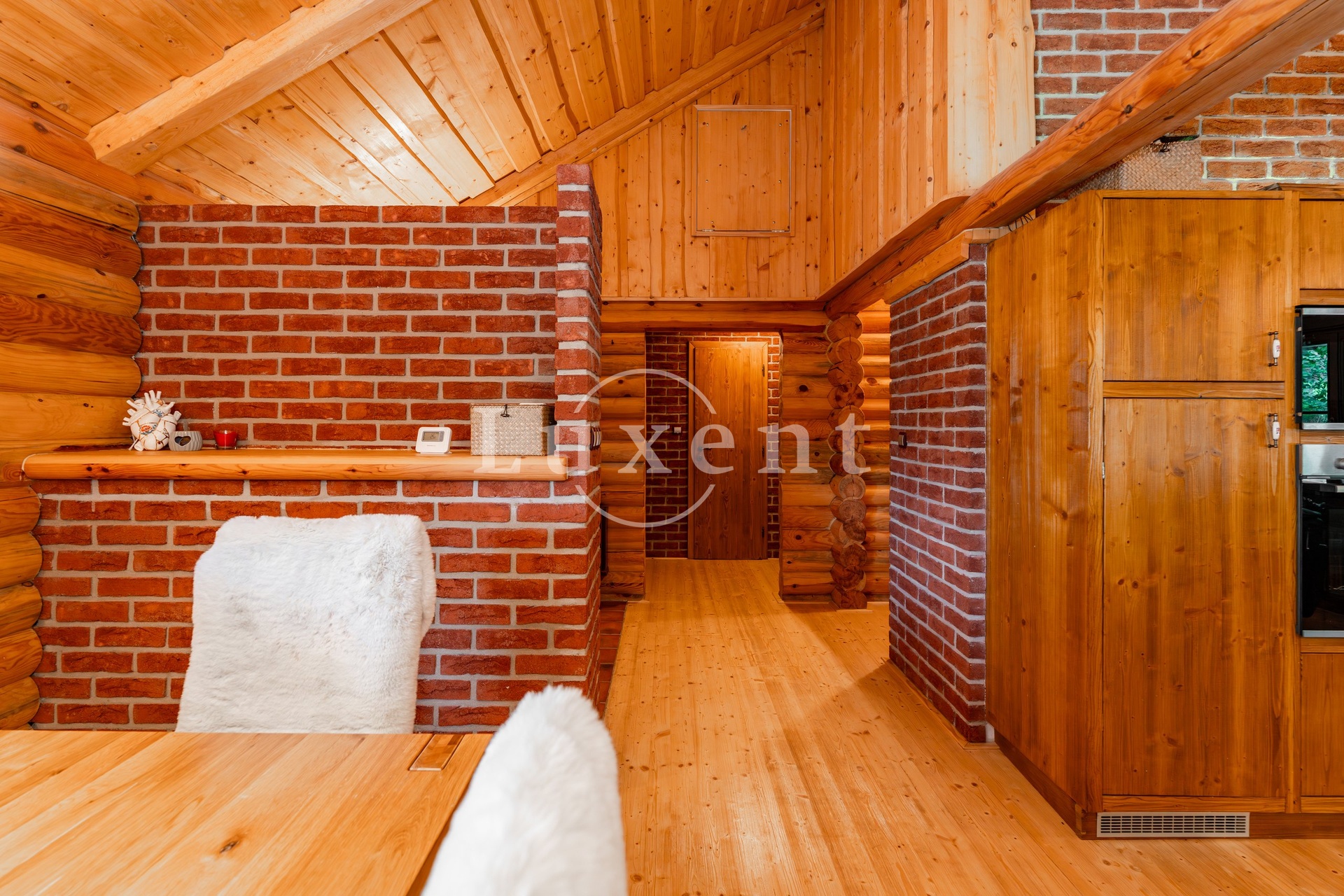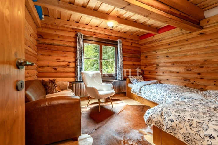 The interior of the cabin is practically organized. There is a hall with entrances to all rooms: to two separate bedrooms, a bathroom with bath and shower, to a separate toilet, utility room and above all to a generous living room with fireplace and equipped kitchen. This space is divided into a dining area with access to the terrace and a quiet relaxation area with a cozy sitting area by the fireplace. The log cabin is bright, above the bedroom area it has a loft for storing things.
