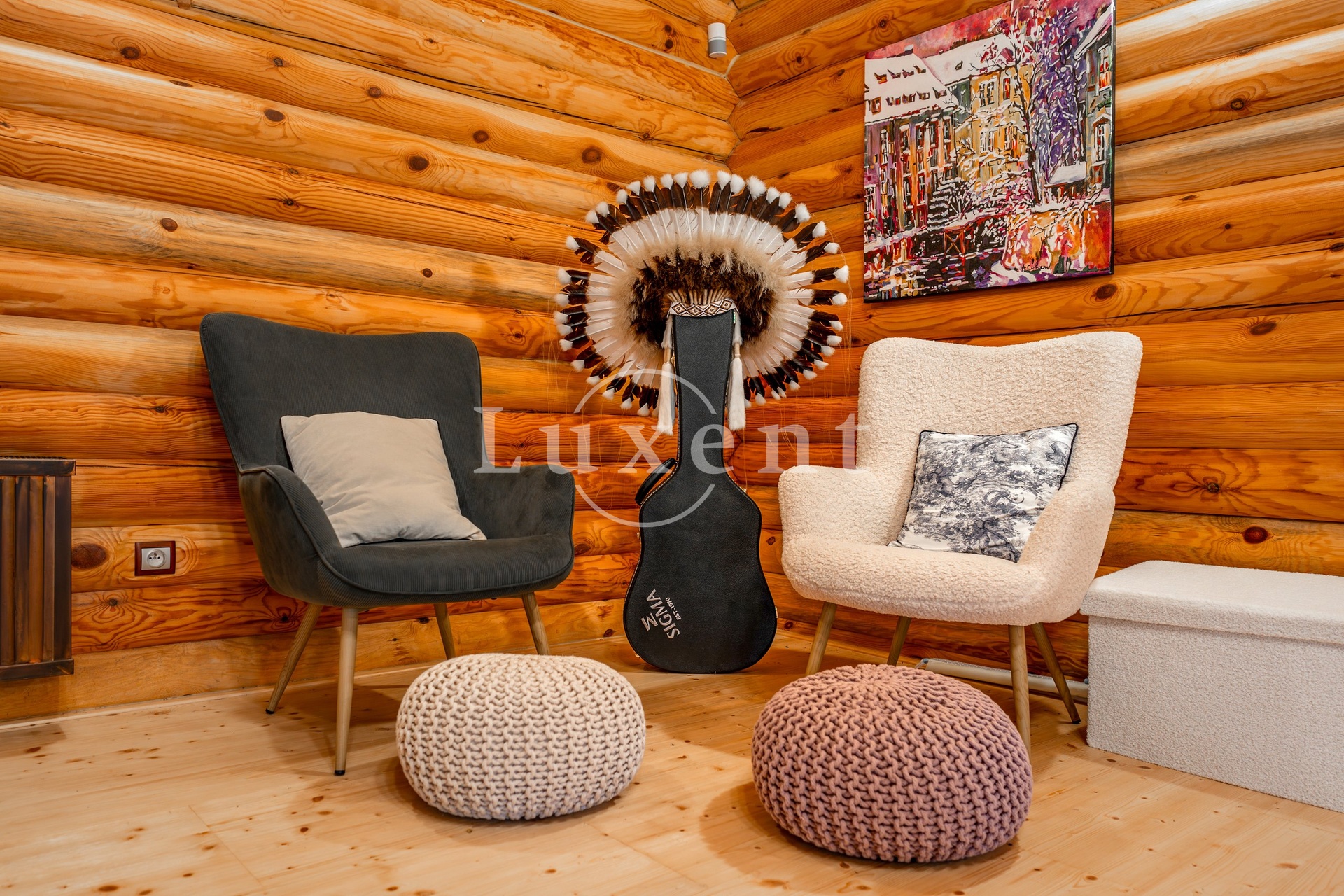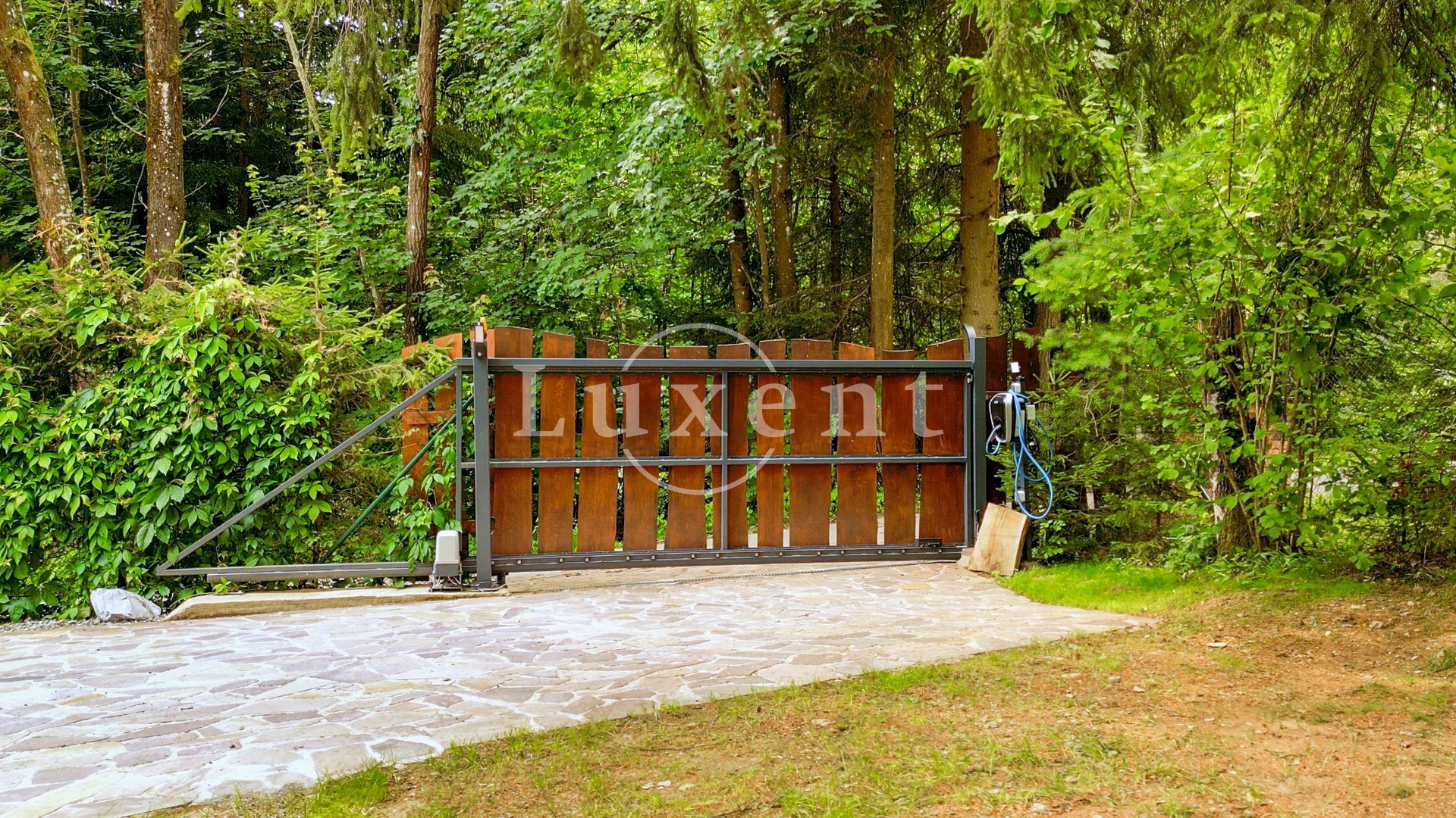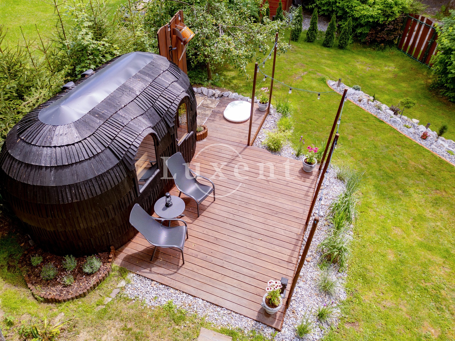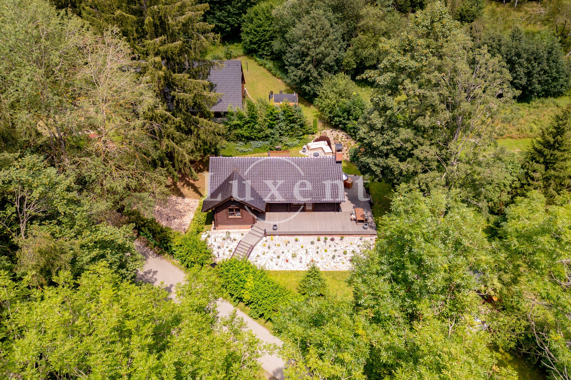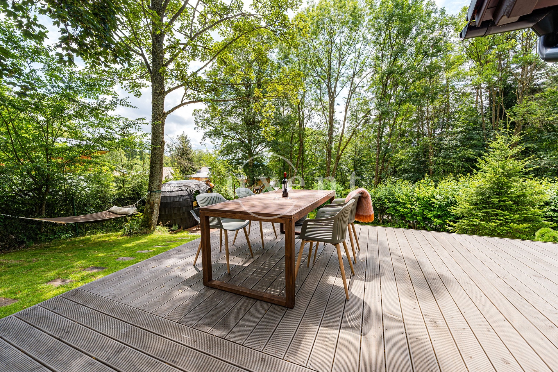 The log cabin was built in 2010, and is registered as a family recreation facility. It is situated in the middle of the plot in an elevated position, which gives it a noble character and a view of the very pleasant green surroundings. The well-thought-out, professionally established and maintained garden with rare plants and mature trees offers a number of corners with their own atmosphere - especially the terraces around the house with seating for outdoor dining, a top-quality hot tub, a shelter under the trees with a hammock or a designer sauna with seating, a cooling pond and a rustic shower. In the intimate area of the garden behind the house, there is a stone terrace with seating, a grill and a fully equipped outdoor kitchen.