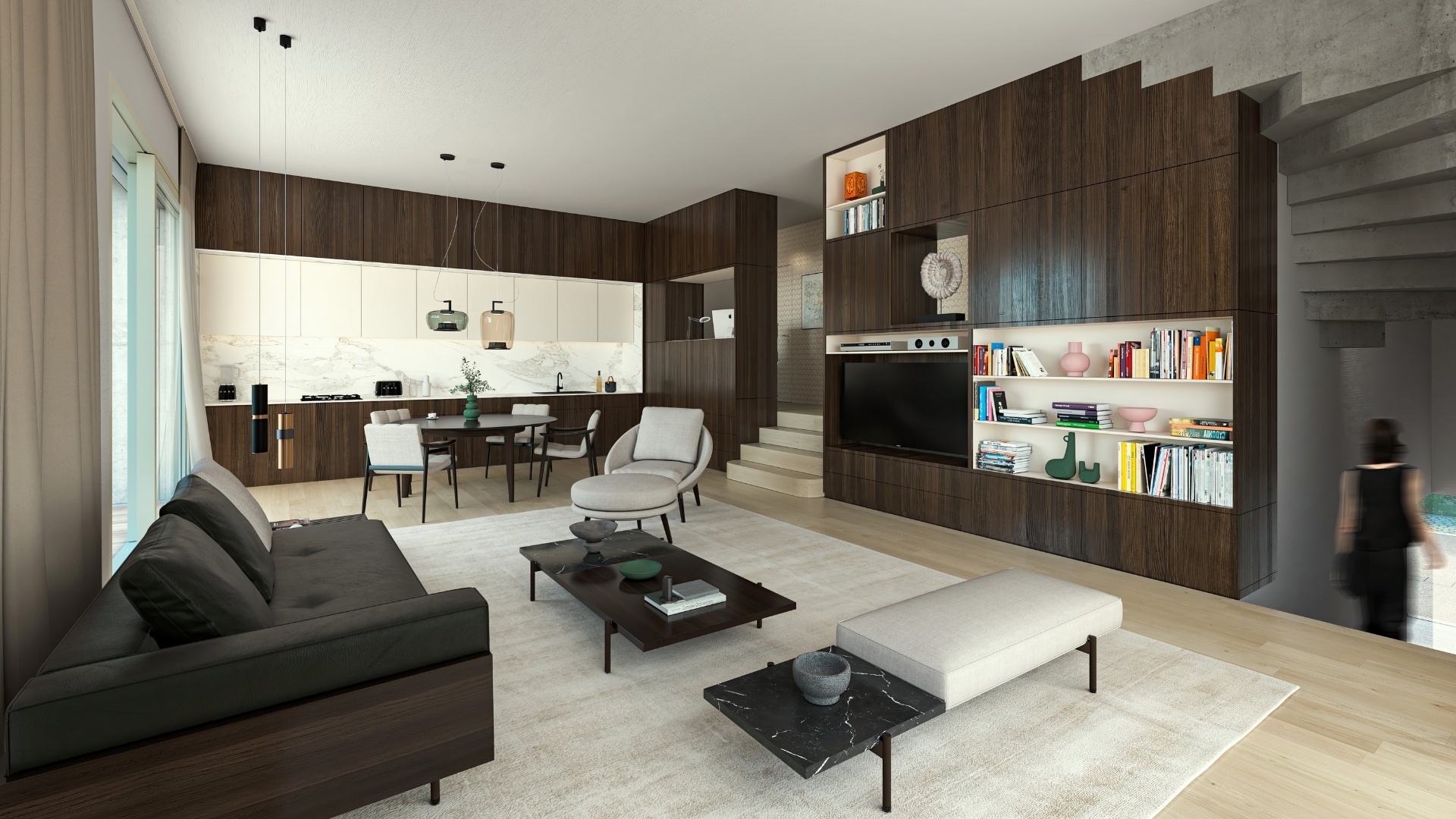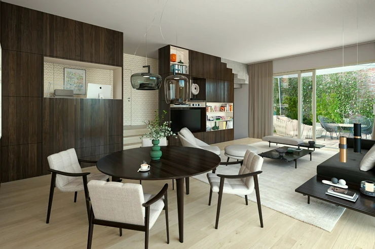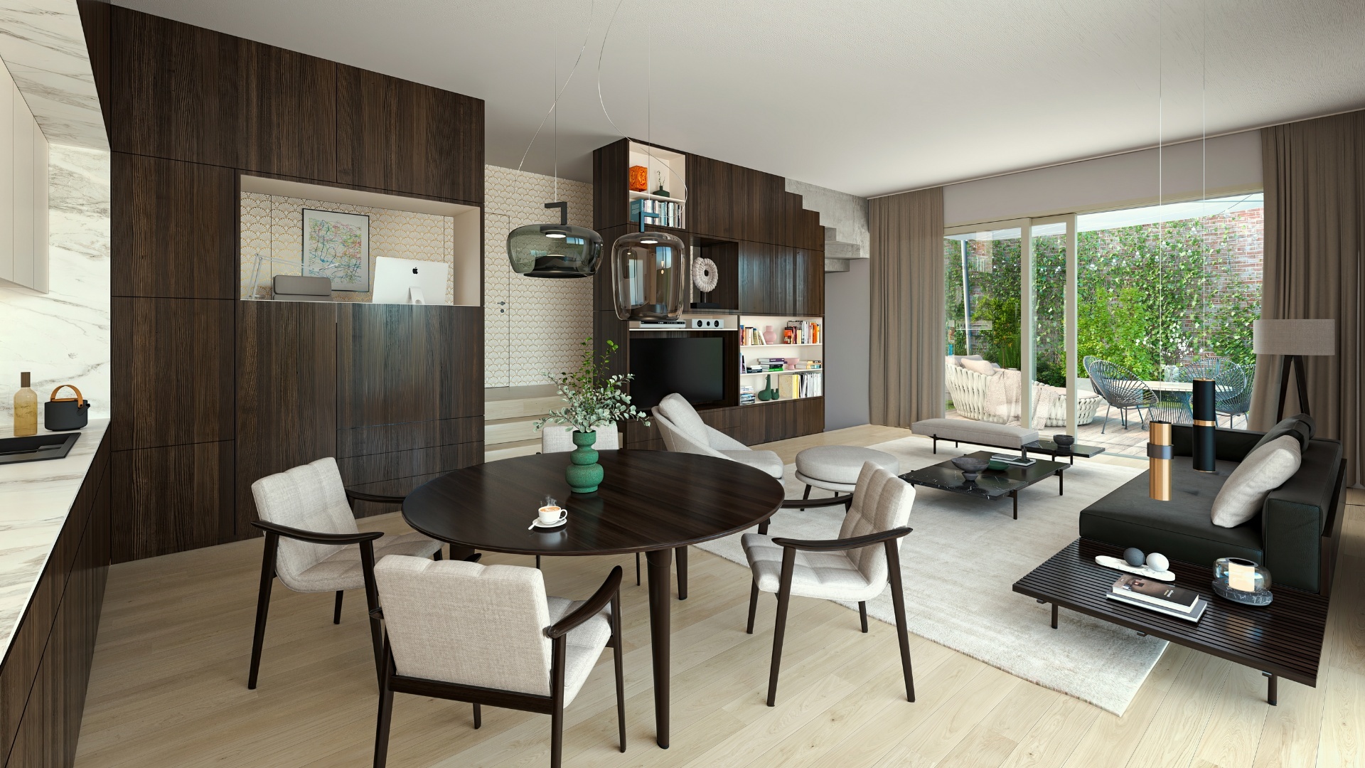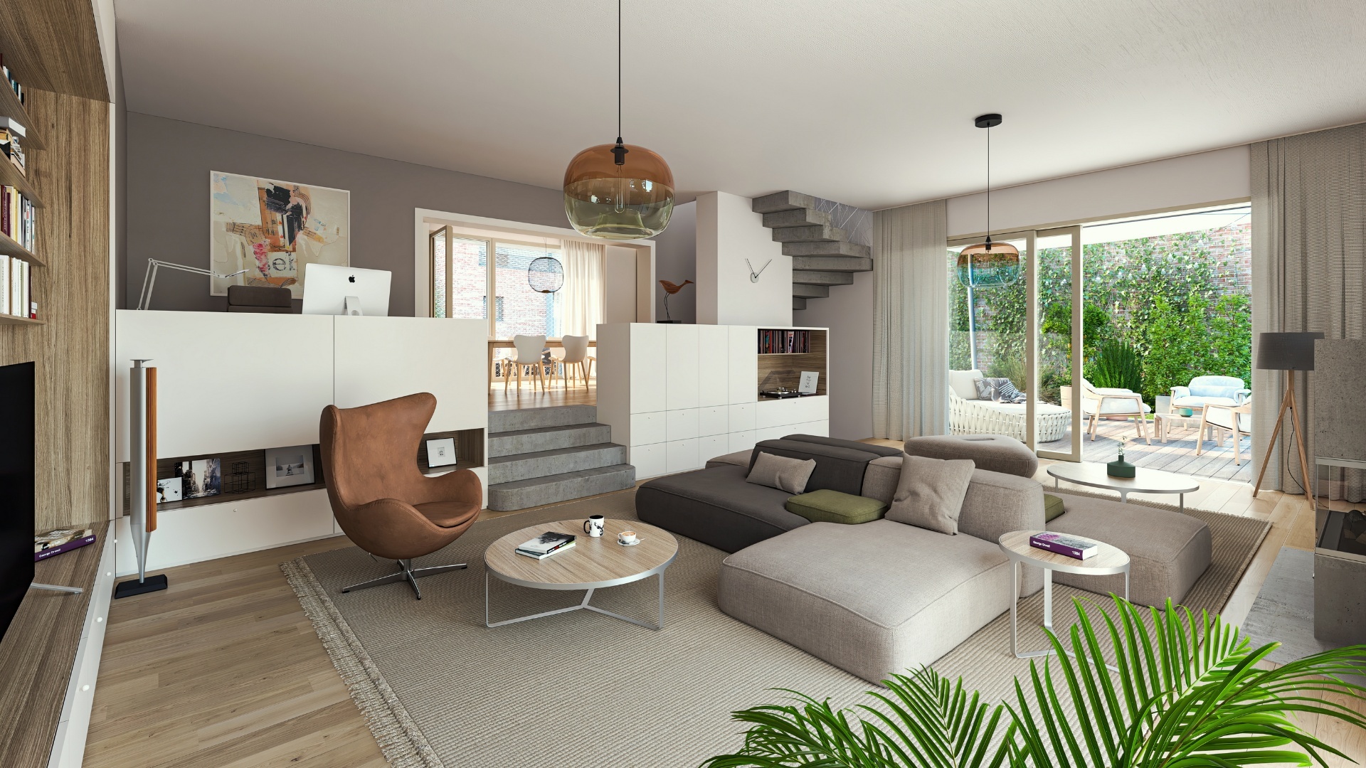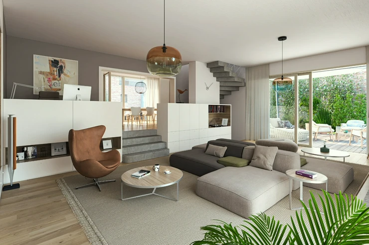 The garden, located approximately 2 m above street level, is accessible not only from the house, but also from the front garden, via an outdoor staircase directly from the street, and in some cases through a gate at the rear of the garden. The positioning of the house and terrace will ensure plenty of privacy and space for your time spent in the garden, which will be enhanced by both the existing mature foliage and, where appropriate, foliage added following a client change recommended by our garden architect.