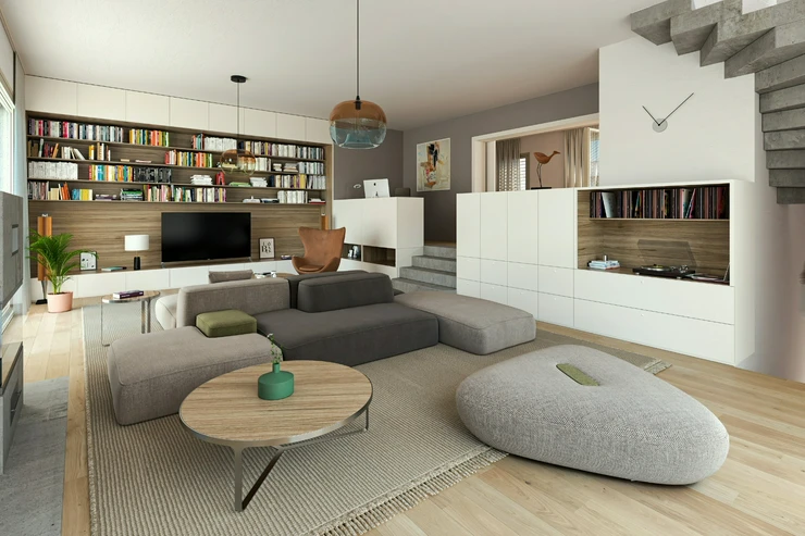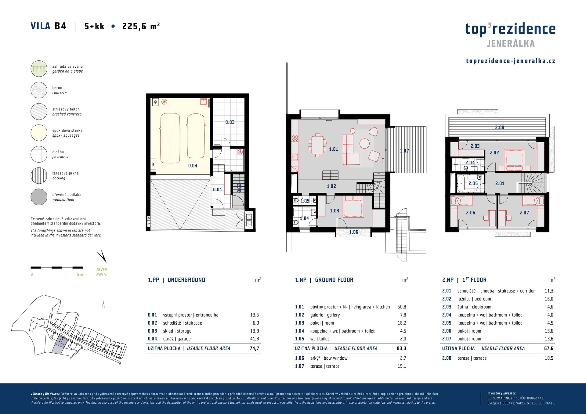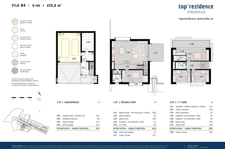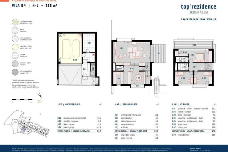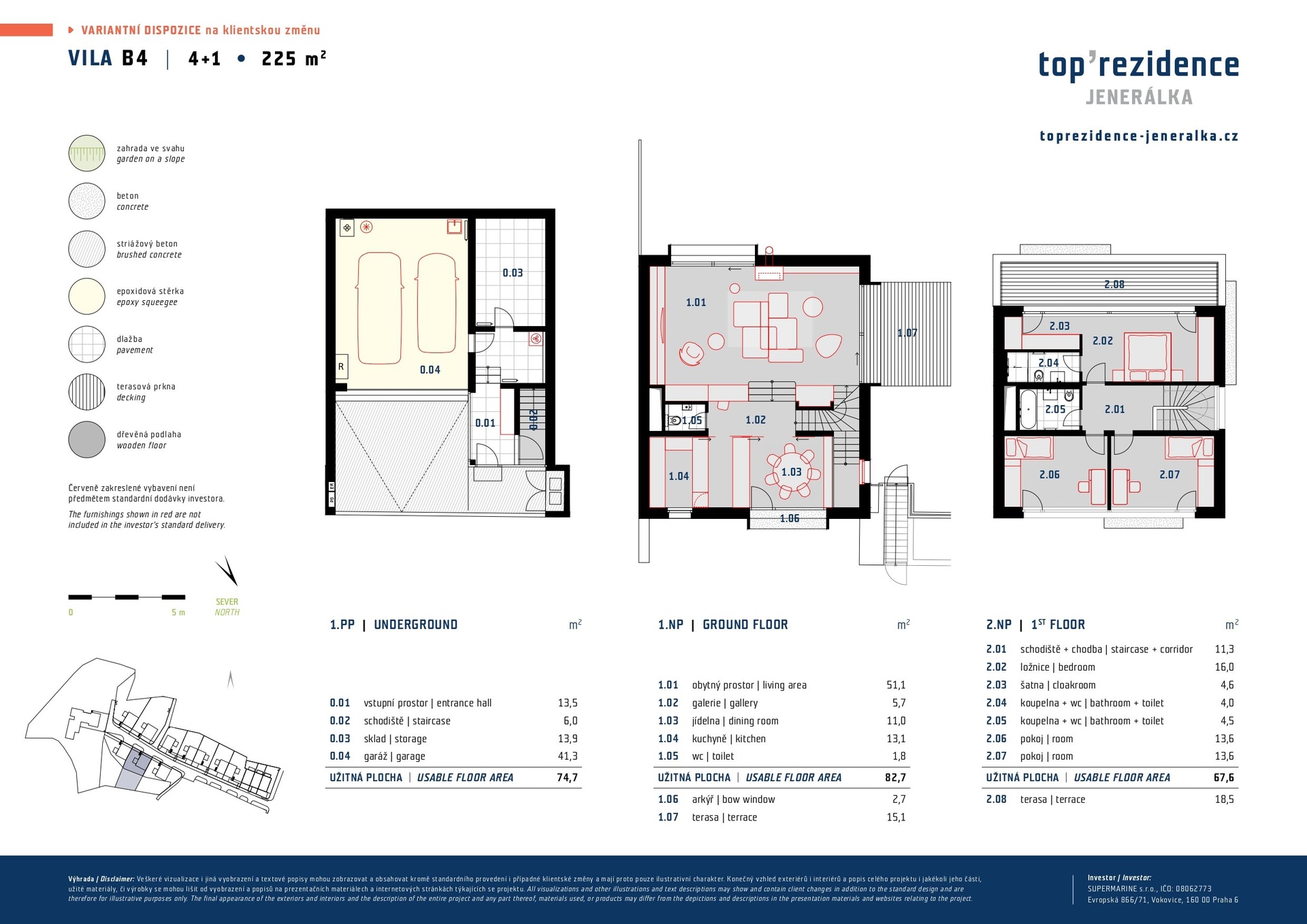 In the standard layout of 5+kk, the villa type B on the 1st floor offers an airy living room with a clear height of 3.4 m with a kitchenette, exit to the terrace and garden. Through the raised gallery you can continue to the guest room with bathroom, or to the 2. floor, where there is a master bedroom with bathroom and two more rooms with shared bathroom and terrace. On the 1st floor there is a spectacular glazed entrance area, the technical background of the house and another room that can serve as a storage room, workshop, or for example a sauna or wine cellar. On this floor there is also a double garage, which is large enough for two cars, a motorbike, bicycles or other sports equipment. The clear height of 2.5 m (door height 2.3 m) is also sufficient for parking SUVs.