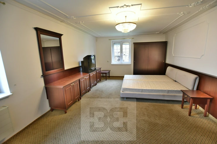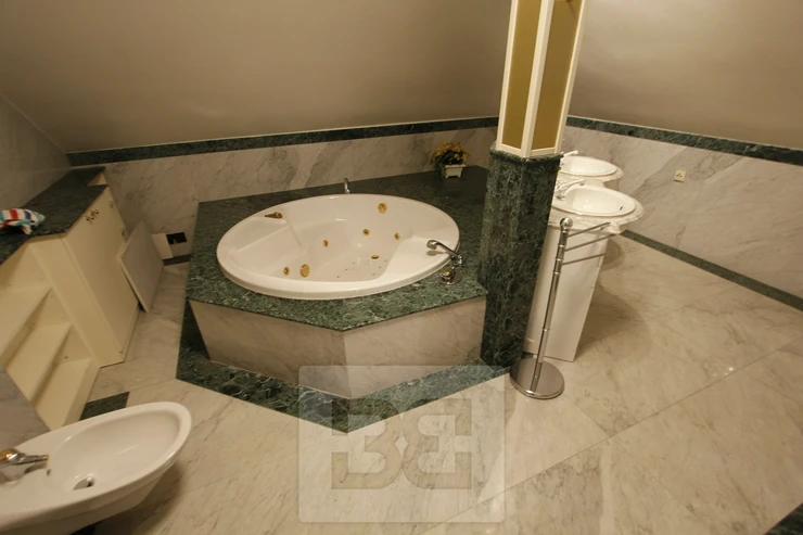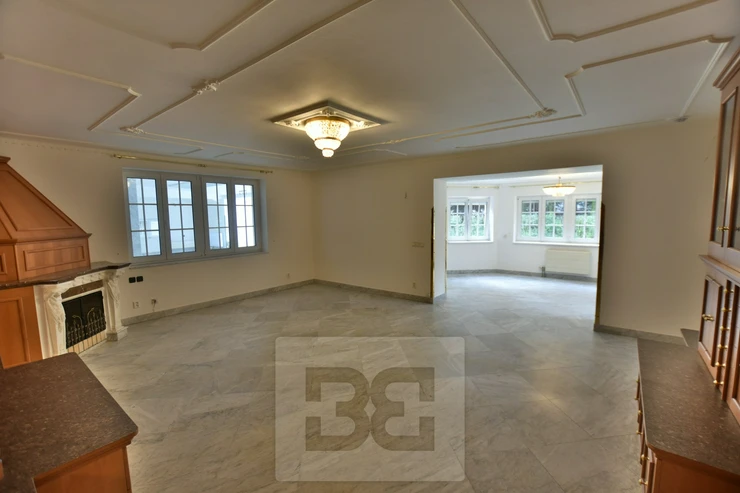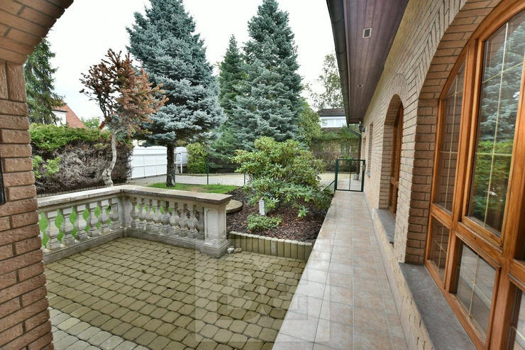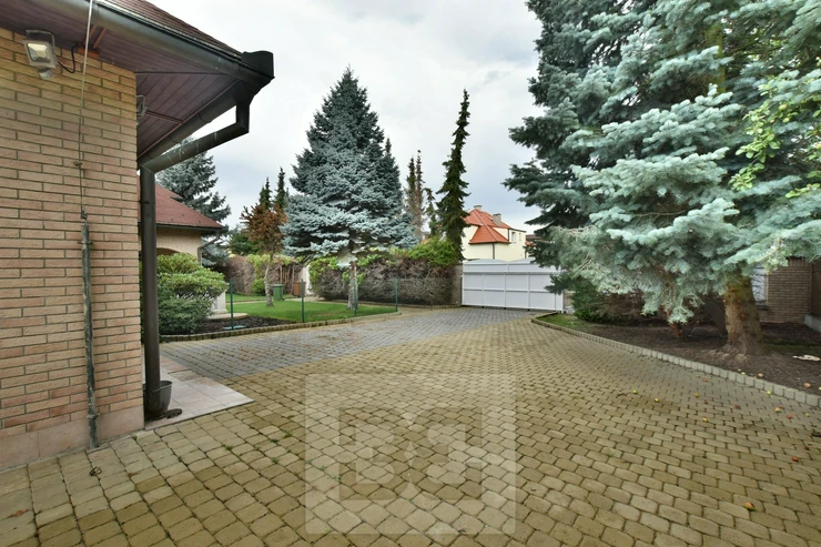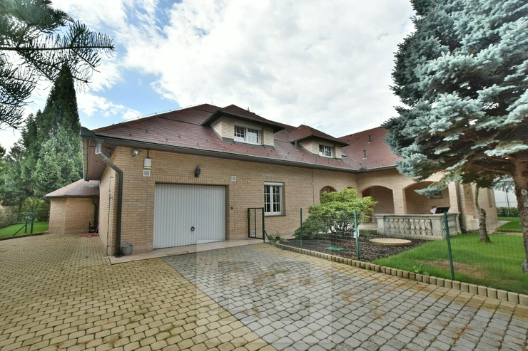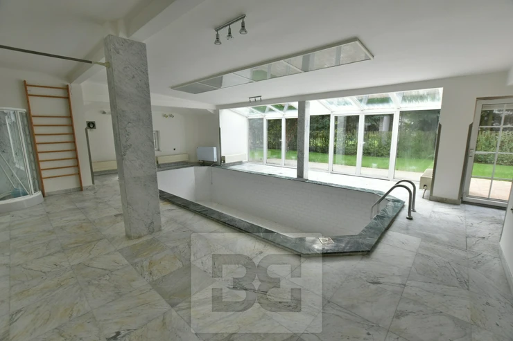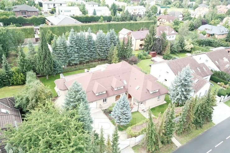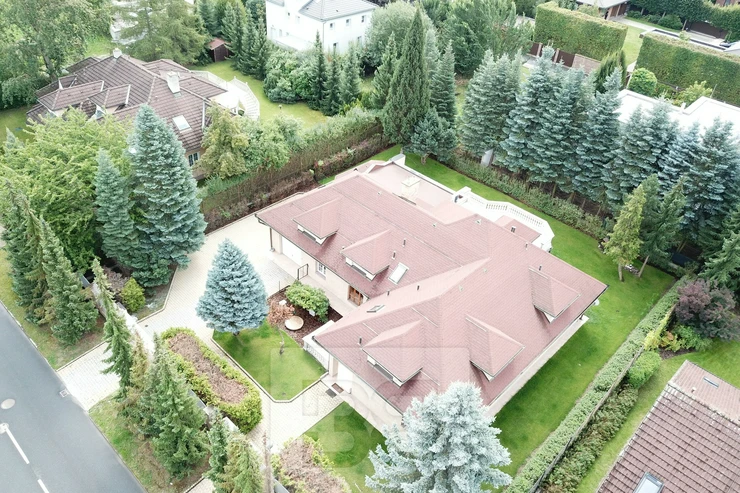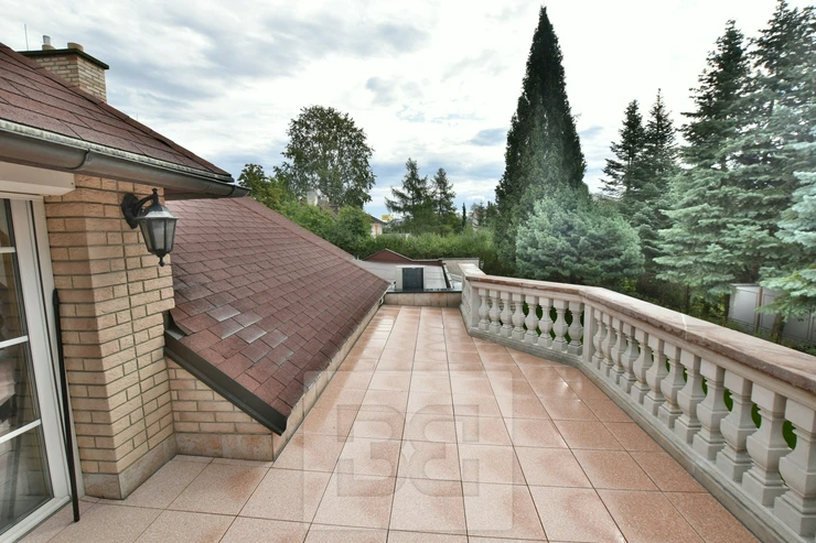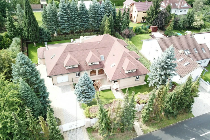 Providing with the exclusive representation from the owner it is a pleasure to introduce you 5BED family house with large garden in Průhonice, Ricanska street. The exterior of the house is completely lined with stone looking façade, plastic windows are white and brown colour and have outdoor blinds. The house is equipped with a terrace of 27m2 with a view of the garden on the second floor. On the first floor there is a hall with bar and dining room connected with living room with fireplace, kitchenette, wooden staircase kitchen, garage, pantry, bathroom with toilet, swimming pool with fitness and glass porch. On the second floor there is a bedroom with a bathroom equipped with a shower and a whirlpool. The room has also a sauna. Furthermore, there is a bedroom with terrace, kitchen, pantry, two other rooms, bathroom and toilet. We will be happy to send you list with all rooms/measurements. The interior of the house is especially equipped with glass decorated chandeliers. Living room and other rooms have decorated ceiling. There are trees and low grass in the garden. PENB sheet isn’t done yet, based on the consumtion is stated C.