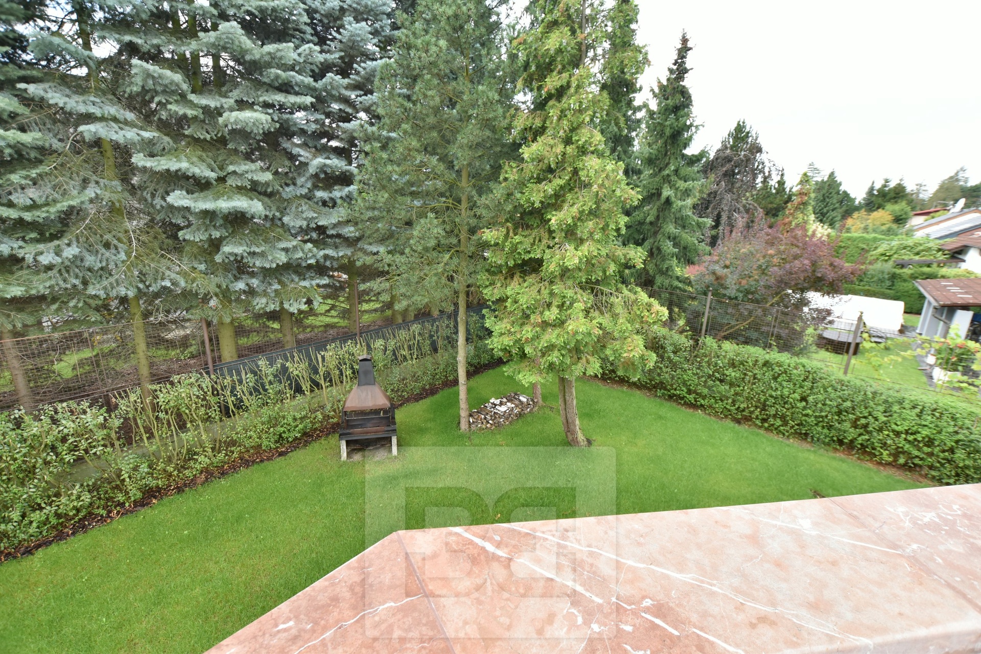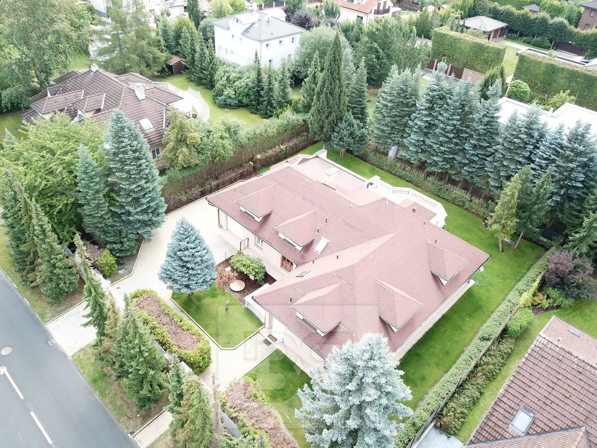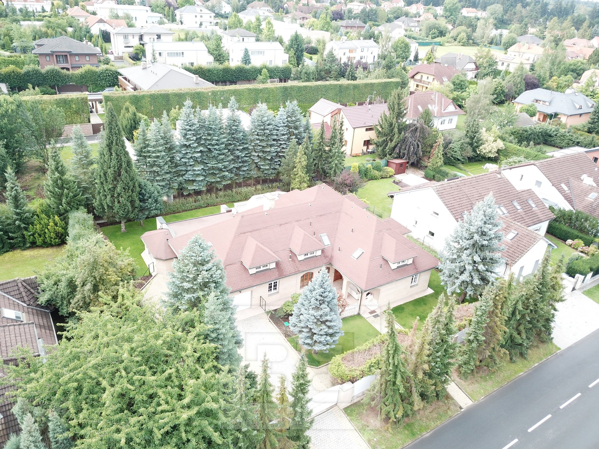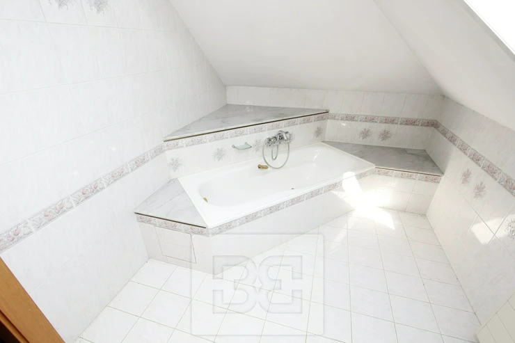 Providing with the exclusive representation from the owner it is a pleasure to introduce you 5BED family house with large garden in Průhonice, Ricanska street. The exterior of the house is completely lined with stone looking façade, plastic windows are white and brown colour and have outdoor blinds. The house is equipped with a terrace of 27m2 with a view of the garden on the second floor. On the first floor there is a hall with bar and dining room connected with living room with fireplace, kitchenette, wooden staircase kitchen, garage, pantry, bathroom with toilet, swimming pool with fitness and glass porch. On the second floor there is a bedroom with a bathroom equipped with a shower and a whirlpool. The room has also a sauna. Furthermore, there is a bedroom with terrace, kitchen, pantry, two other rooms, bathroom and toilet. We will be happy to send you list with all rooms/measurements. The interior of the house is especially equipped with glass decorated chandeliers. Living room and other rooms have decorated ceiling. There are trees and low grass in the garden. PENB sheet isn’t done yet, based on the consumtion is stated C.