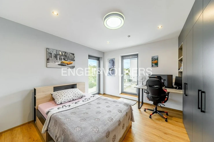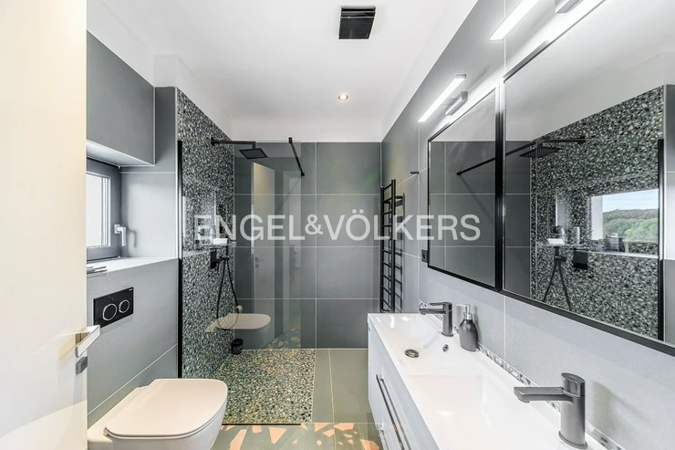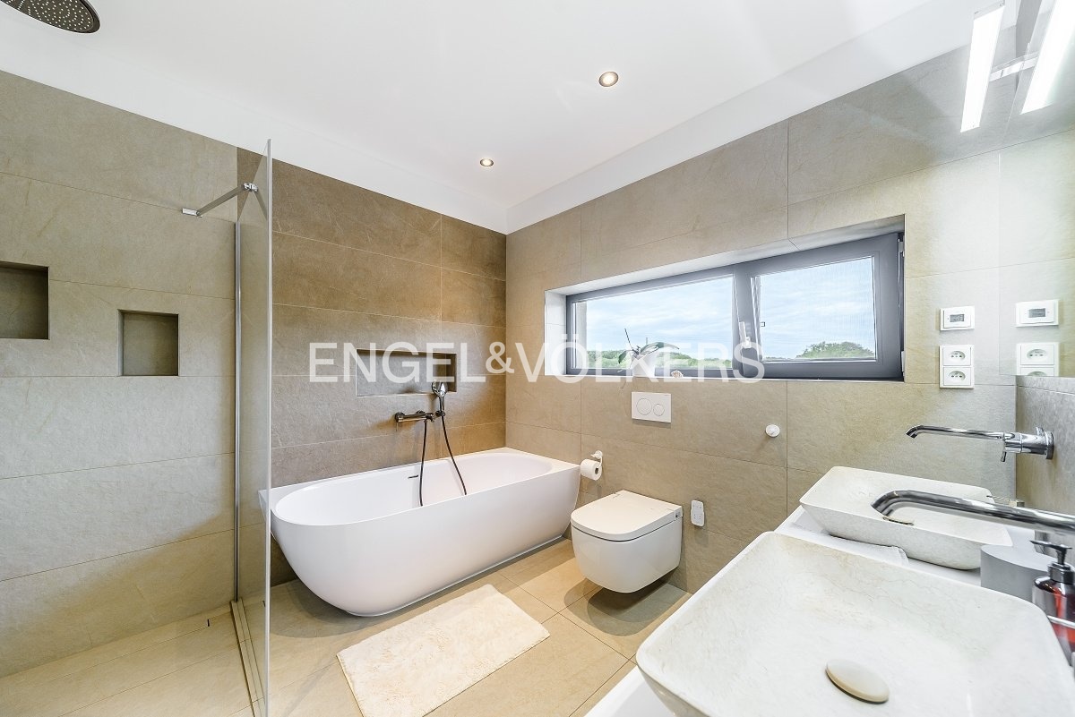 In addition to the well-designed layout and quality materials such as vinyl flooring, tiles, aluminium windows with triple glazing and external blinds, the villa also boasts modern technology. Heating is provided by a gas condensing boiler with underfloor heating, which contributes significantly to the economical operation and comfort throughout the house. All built-in furniture has been custom-made, ensuring its high quality and functionality.