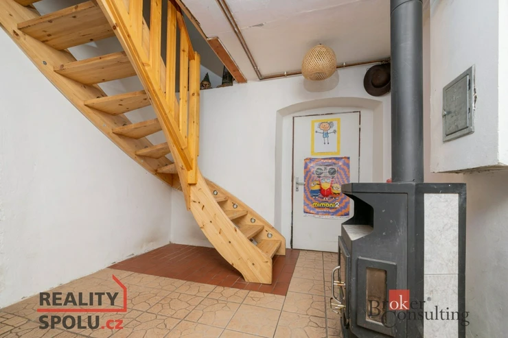 V přízemí se nachází středová chodba s dřevěným schodištěm do patra. Na levé straně je prostorná kuchyň, za kterou je umístěna koupelna s WC. Na pravé straně najdete obývací pokoj.