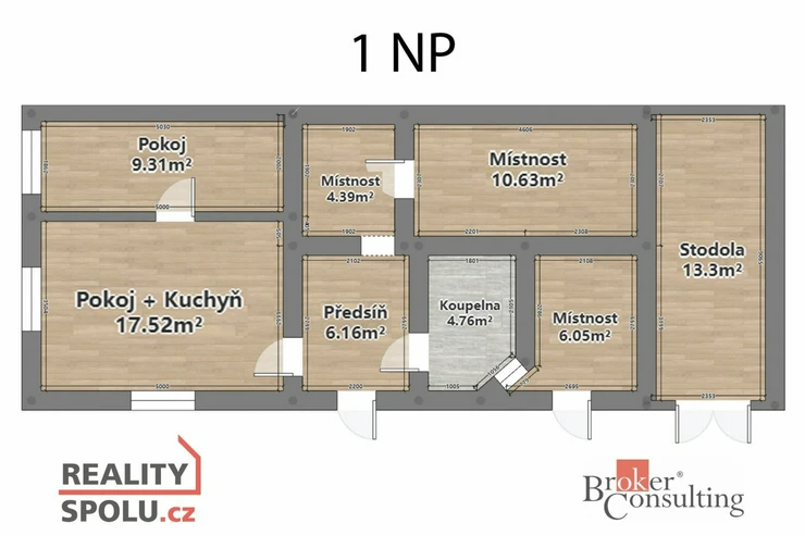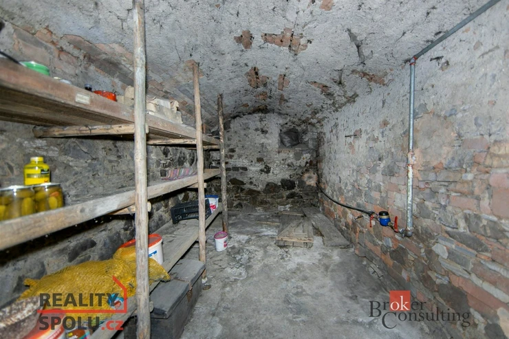 Přízemí domu se skládá z dvou pokojů, koupelny, chodby, technické místnosti a sklepa.