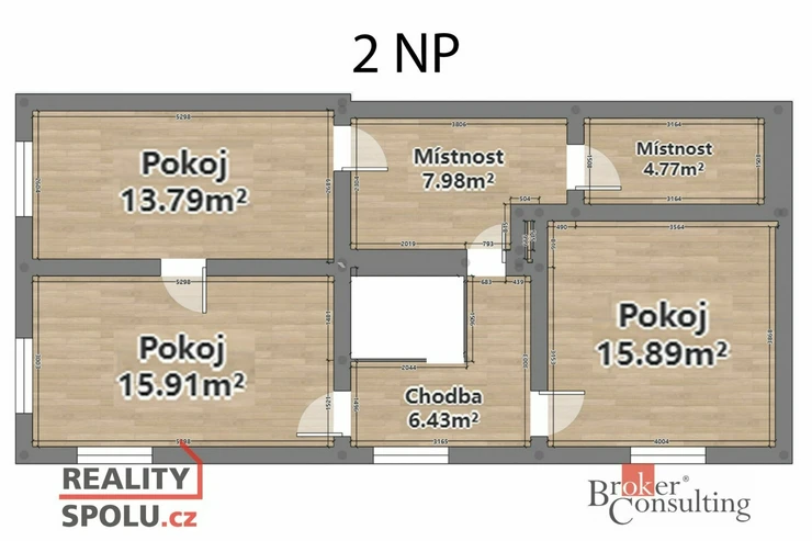 V druhém patře najdeme 3x pokoj, kuchyň komoru a chodbu.