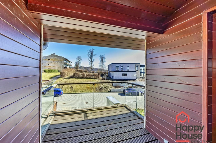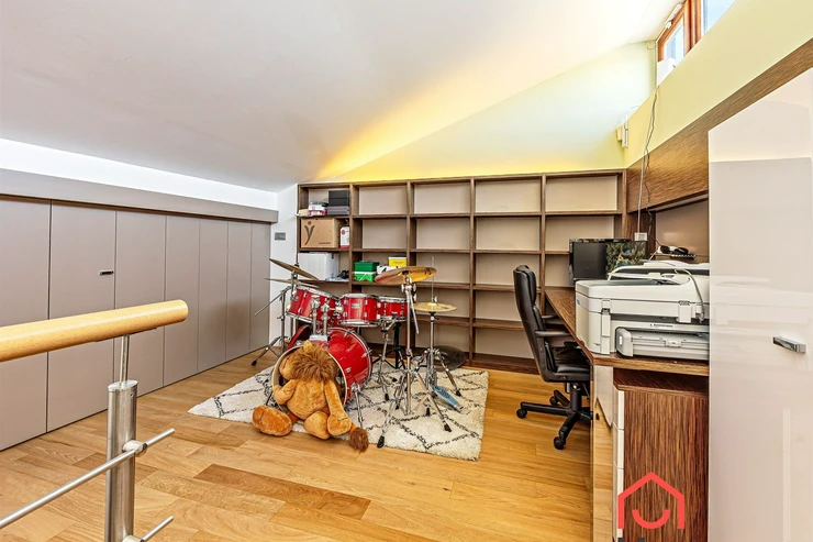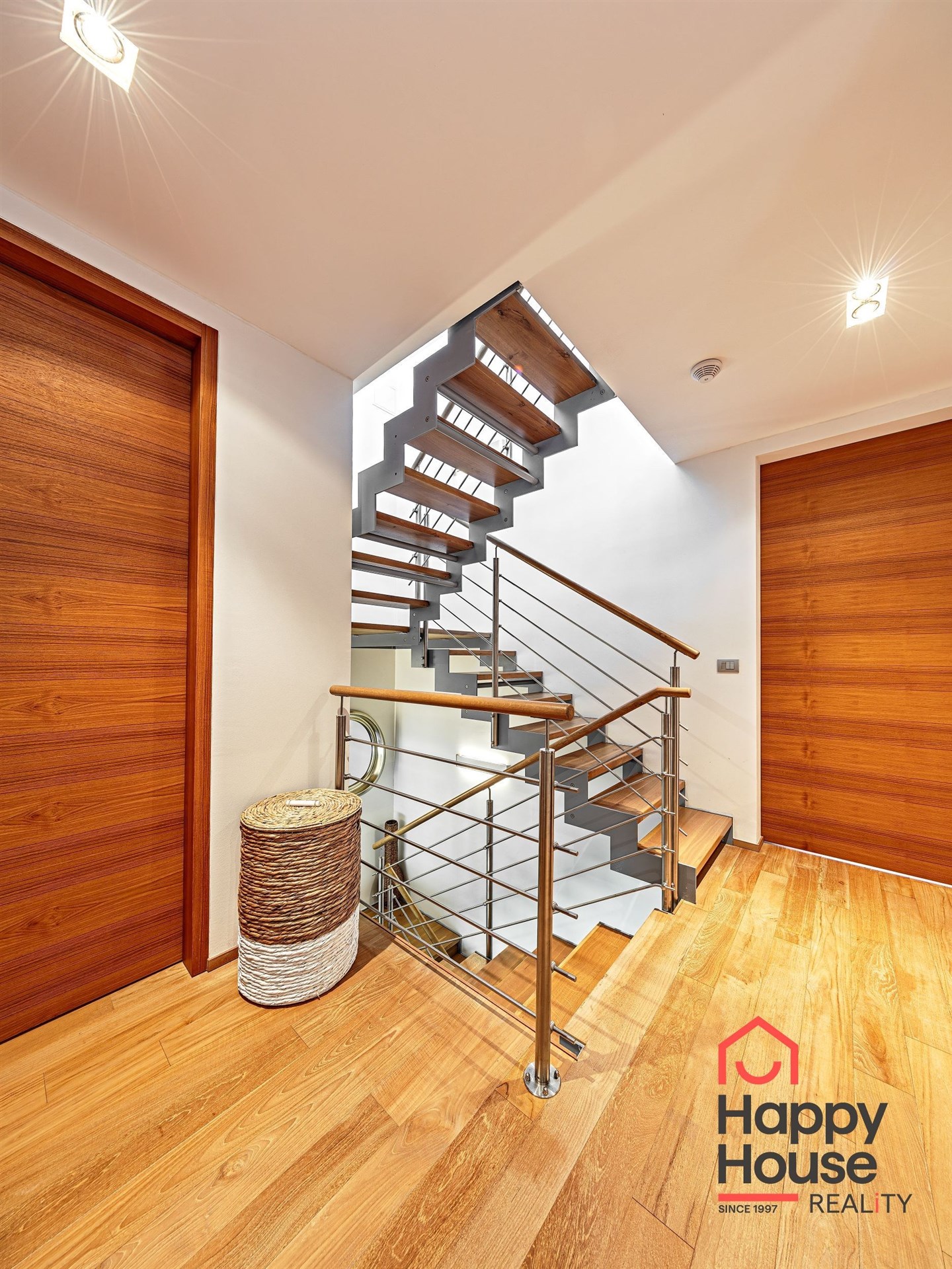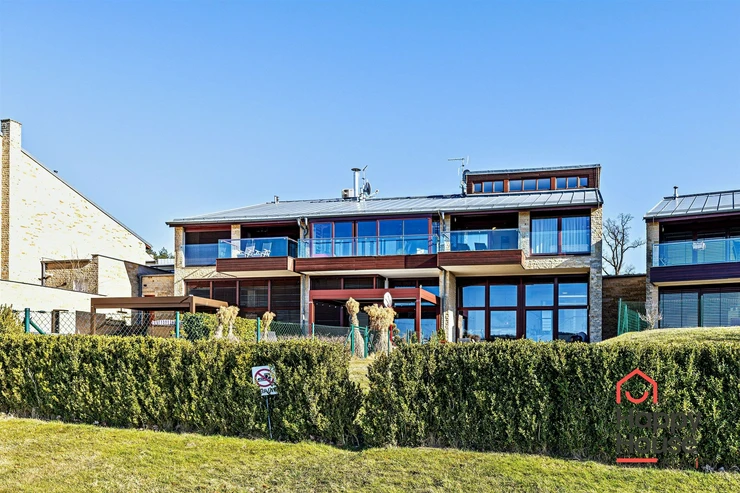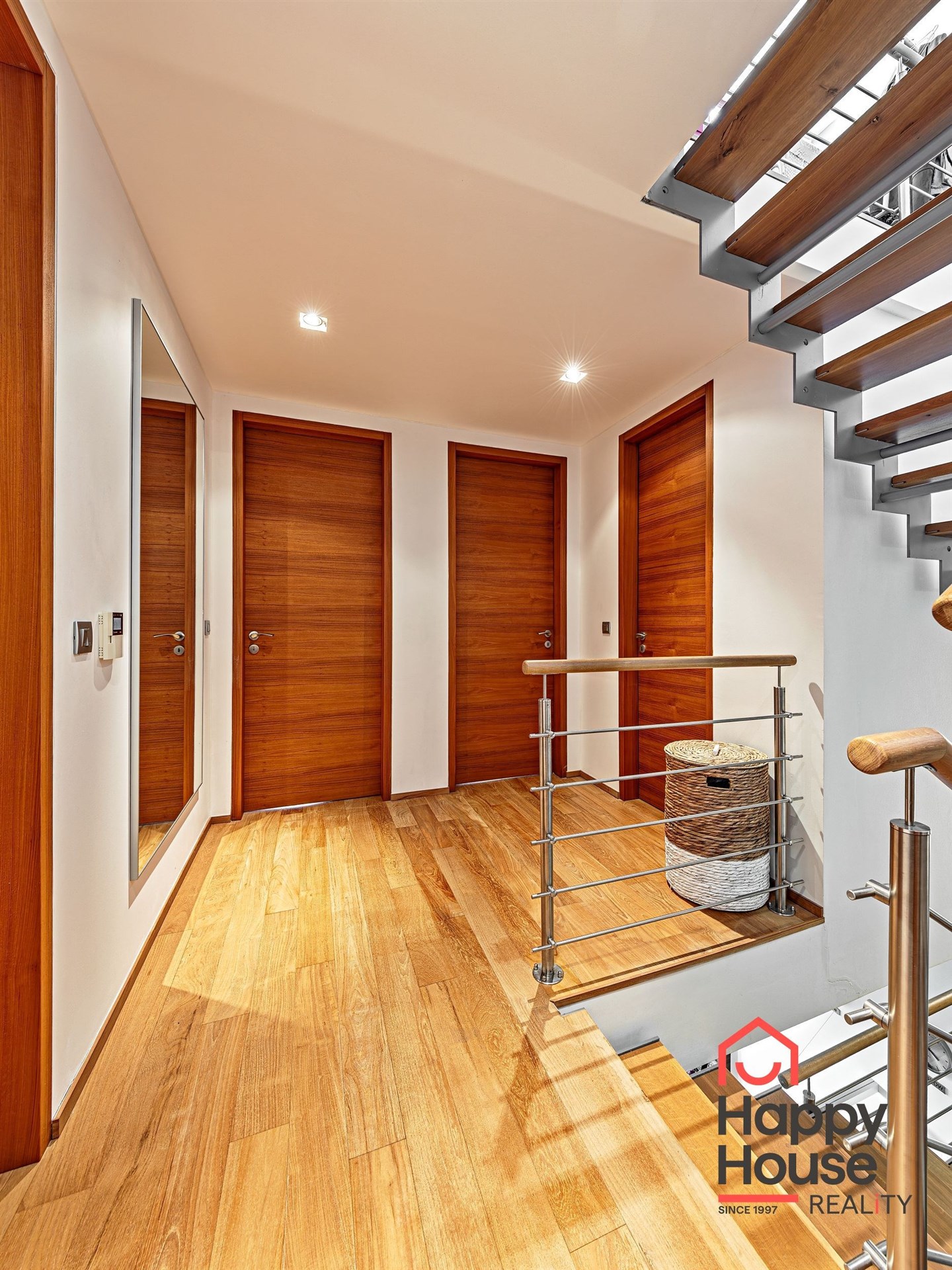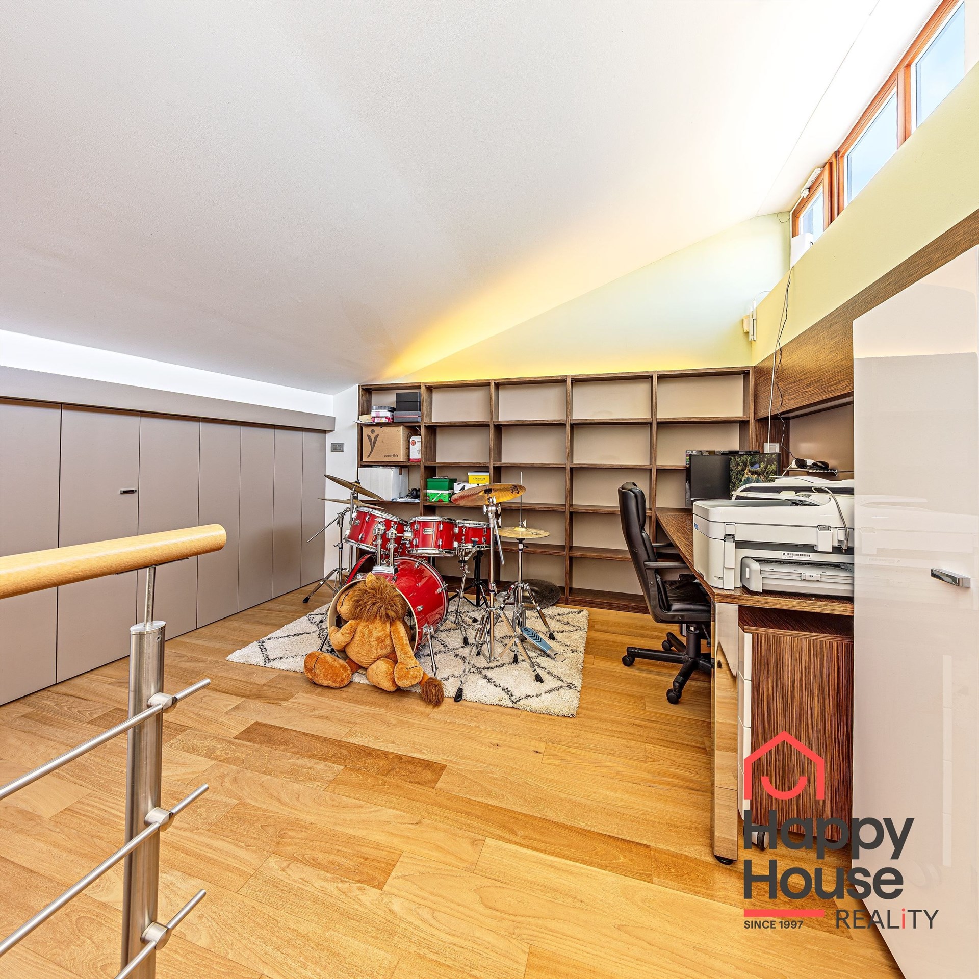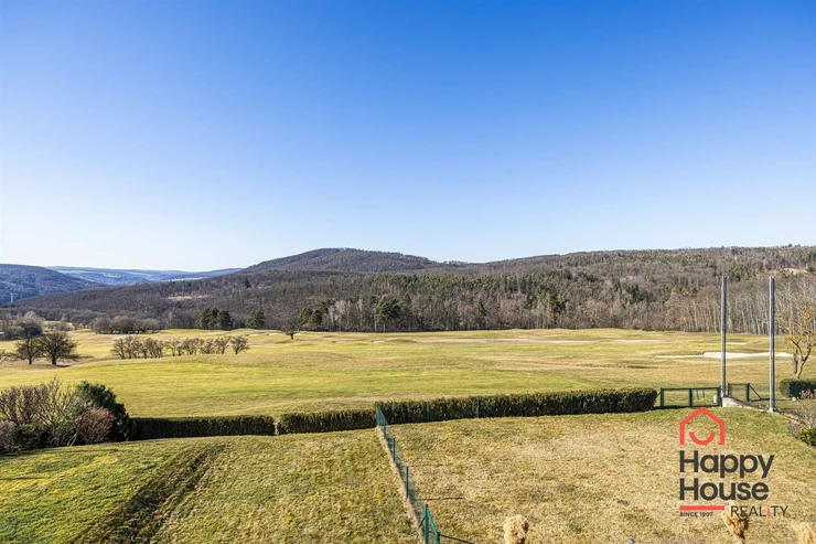 We offer for sale a terraced four-bedroom family house, including a garage and garden, located in the quiet and exclusive area of the Závodí golf resort near the Beroun Golf Club. The house was built approximately 15 years ago and is situated on a plot of 280 sqm. The built-up area is 107 sqm, with a courtyard in front of the house measuring 37 sqm, and also includes a share of a common courtyard area of 377 sqm (1/8 share). The garden behind the house is 184 sqm and offers views of the surrounding countryside. On the ground floor, there is an entrance hall, guest bedroom and a garage; downstairs leads to a spacious living room with a kitchenette, staircase, and direct access to the terrace and garden, and a separate toilet. The first floor features a bedroom, two children's rooms with access to a partially covered balcony, two bathrooms, and a second partially covered balcony. The top floor contains an open-plan office on a gallery and a walk-in closet. One bathroom has a bathtub, two sinks, a toilet, and a heating ladder. The other bathroom has a shower, sink, toilet, heating ladder, washing machine, and dryer. The kitchen is fully equipped - electric and microwave ovens, dishwasher, fridge with freezer, and extractor hood. Ample storage space is provided by built-in wardrobes. Tiling is laid in the ground floor, bathrooms, and toilet, floating flooring in the upper floors, walk-in closet, gallery, and bedroom, and carpets in the rooms. Heating is provided by a gas boiler. Parking is available both in the garage and on two parking spaces on the property in front of the house. The house is located at the end of a dead-end asphalt road with a barrier, entry is allowed only for residents, ensuring peace and security. The property offers beautiful views to the northwest and southeast, directly by the golf course - ideal for lovers of nature, sports, and privacy. No energy label is available - class G is listed.