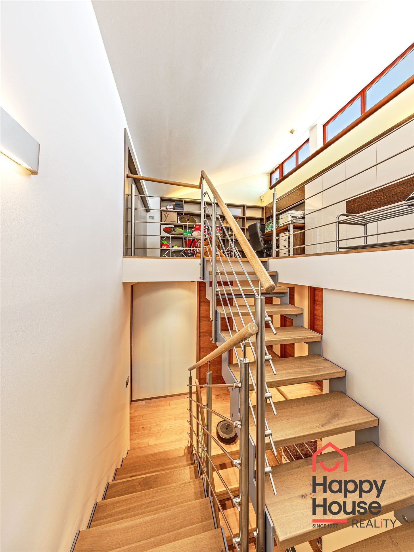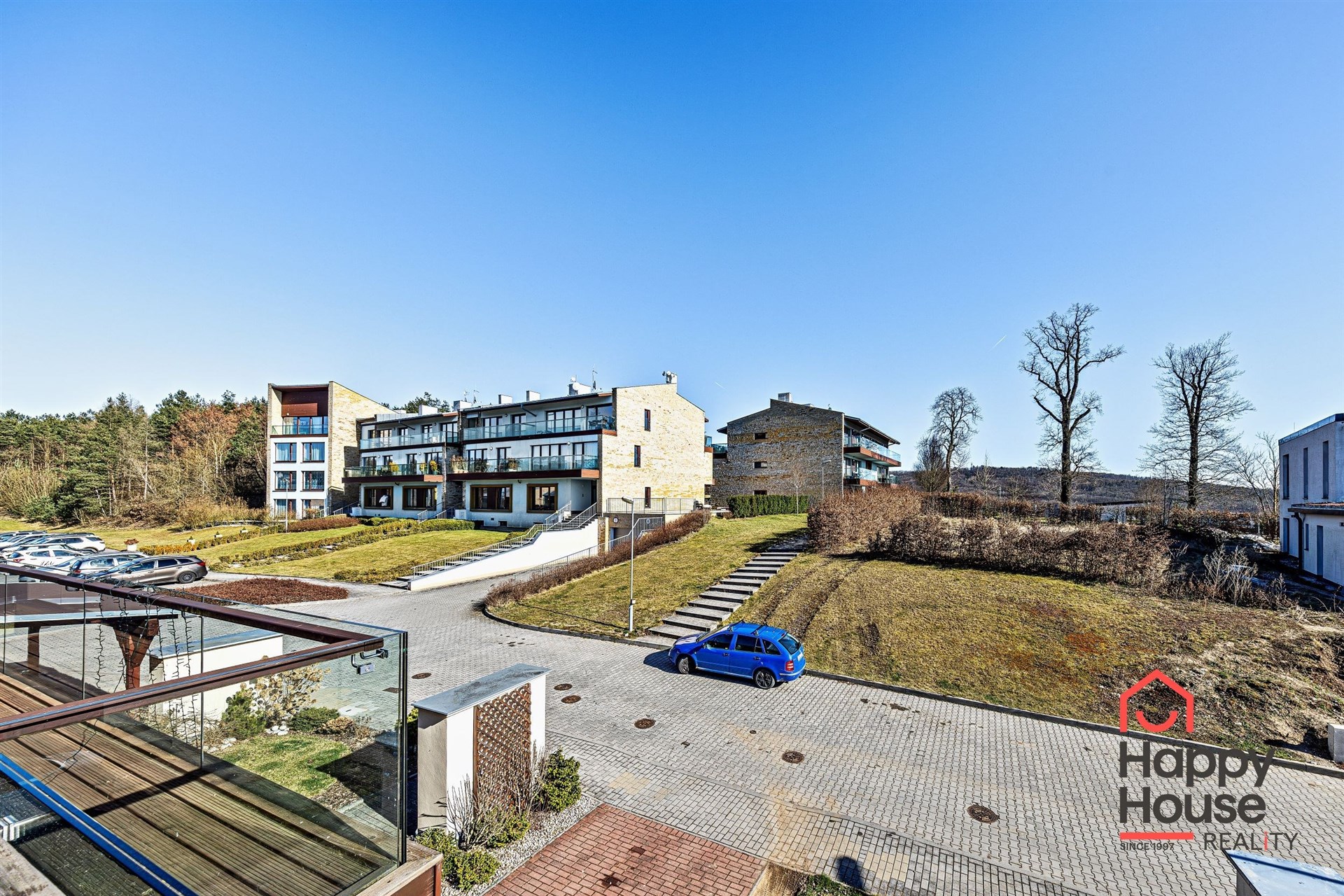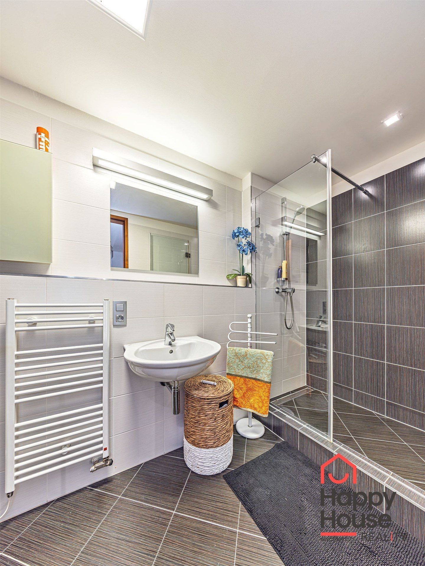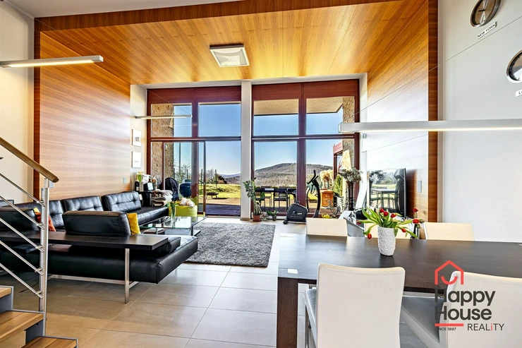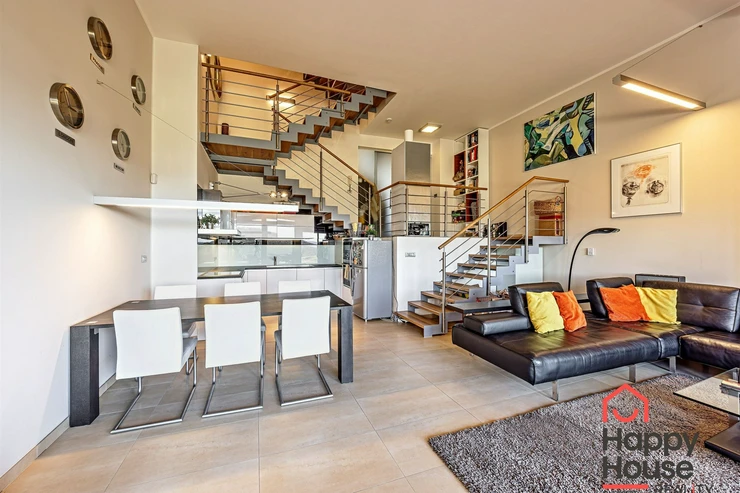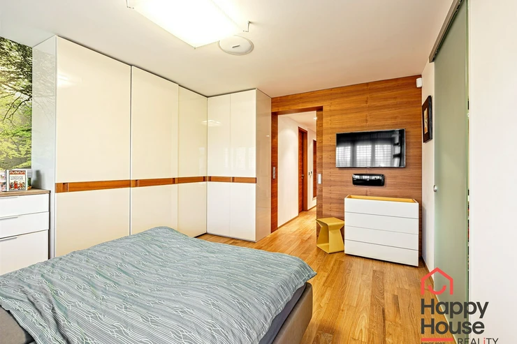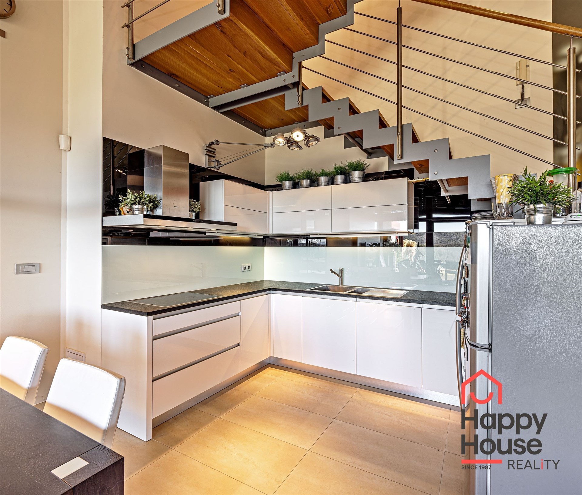 We offer for sale a terraced four-bedroom family house, including a garage and garden, located in the quiet and exclusive area of the Závodí golf resort near the Beroun Golf Club. The house was built approximately 15 years ago and is situated on a plot of 280 sqm. The built-up area is 107 sqm, with a courtyard in front of the house measuring 37 sqm, and also includes a share of a common courtyard area of 377 sqm (1/8 share). The garden behind the house is 184 sqm and offers views of the surrounding countryside. On the ground floor, there is an entrance hall, guest bedroom and a garage; downstairs leads to a spacious living room with a kitchenette, staircase, and direct access to the terrace and garden, and a separate toilet. The first floor features a bedroom, two children's rooms with access to a partially covered balcony, two bathrooms, and a second partially covered balcony. The top floor contains an open-plan office on a gallery and a walk-in closet. One bathroom has a bathtub, two sinks, a toilet, and a heating ladder. The other bathroom has a shower, sink, toilet, heating ladder, washing machine, and dryer. The kitchen is fully equipped - electric and microwave ovens, dishwasher, fridge with freezer, and extractor hood. Ample storage space is provided by built-in wardrobes. Tiling is laid in the ground floor, bathrooms, and toilet, floating flooring in the upper floors, walk-in closet, gallery, and bedroom, and carpets in the rooms. Heating is provided by a gas boiler. Parking is available both in the garage and on two parking spaces on the property in front of the house. The house is located at the end of a dead-end asphalt road with a barrier, entry is allowed only for residents, ensuring peace and security. The property offers beautiful views to the northwest and southeast, directly by the golf course - ideal for lovers of nature, sports, and privacy. No energy label is available - class G is listed.
