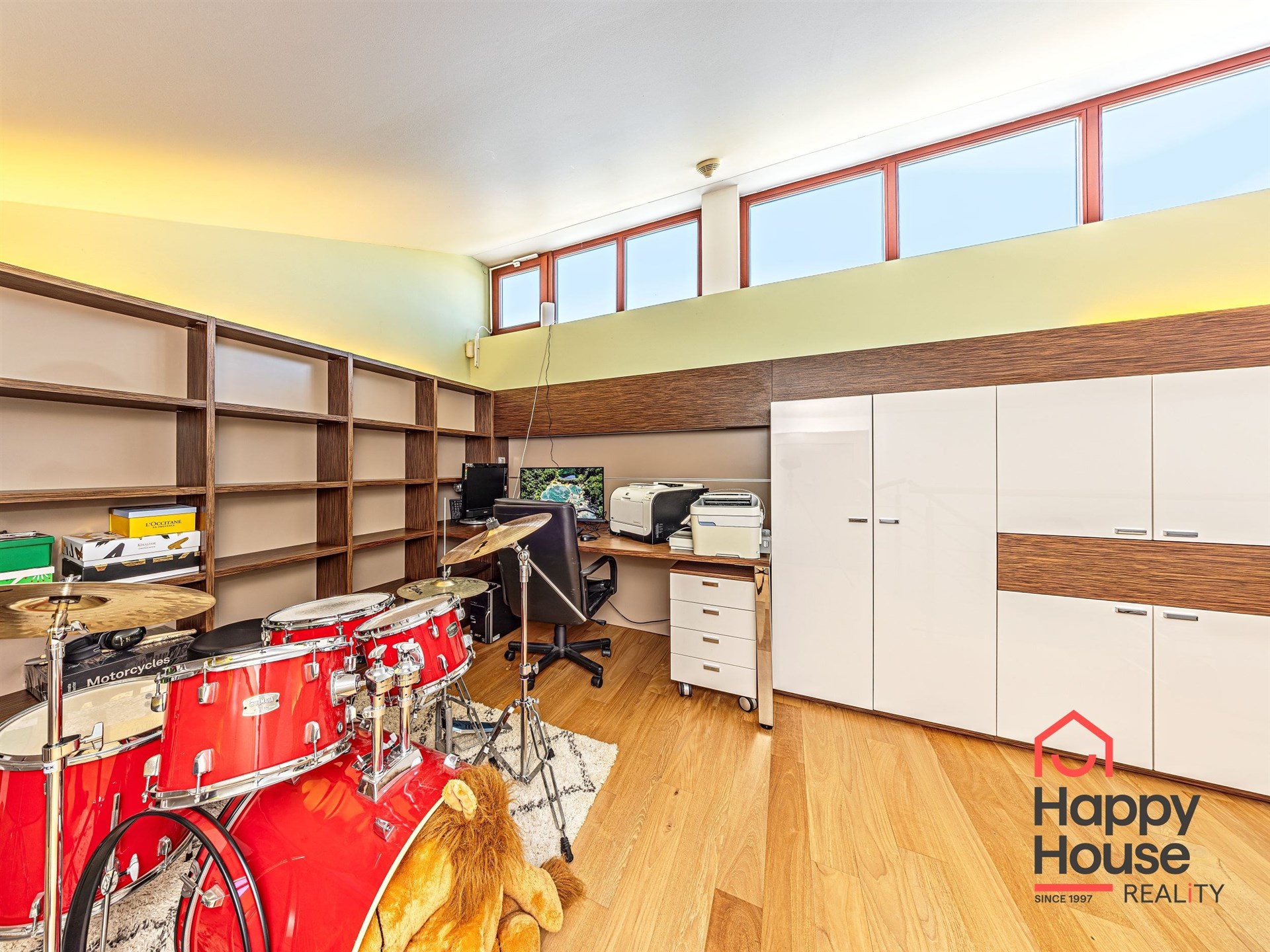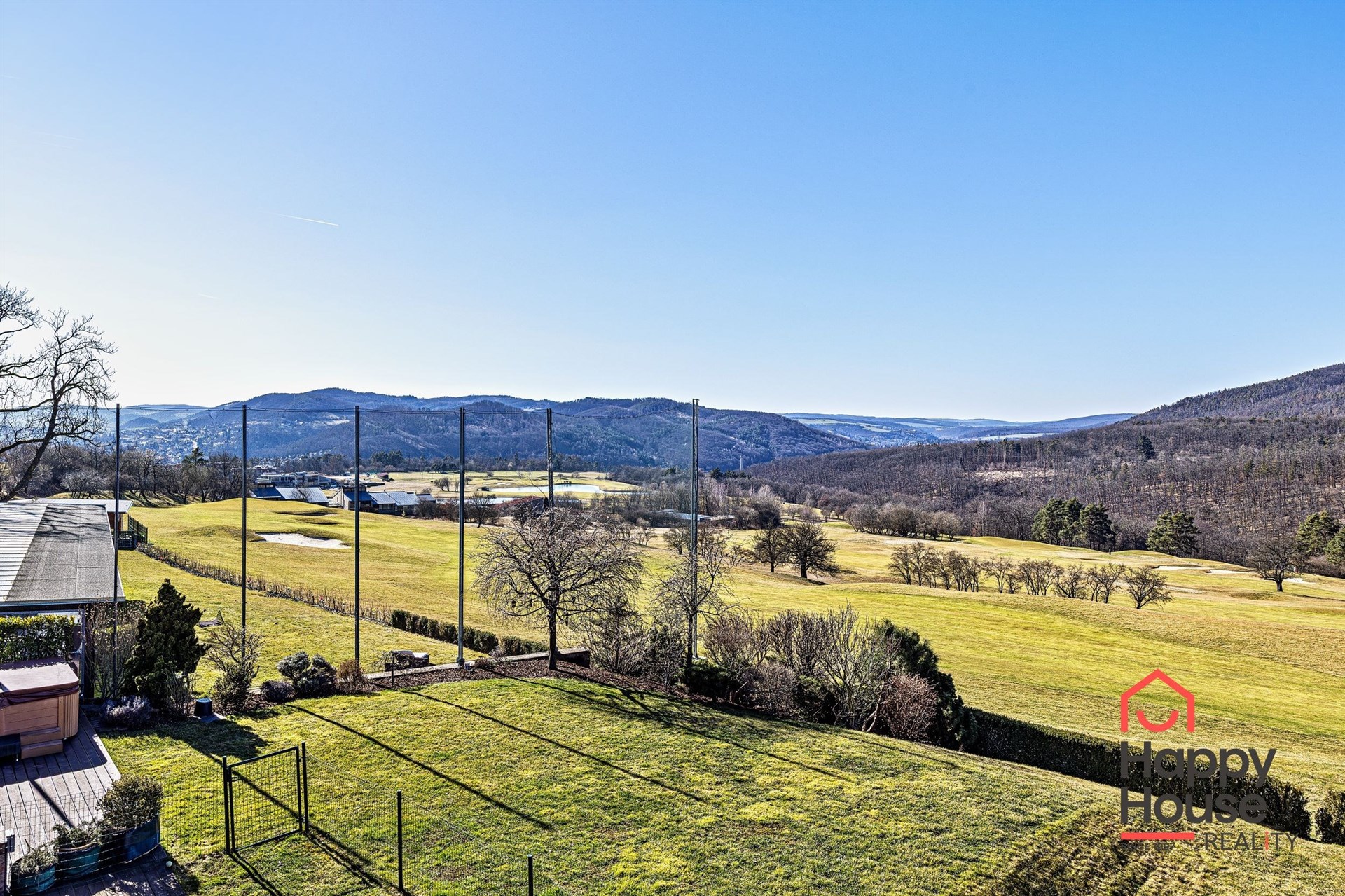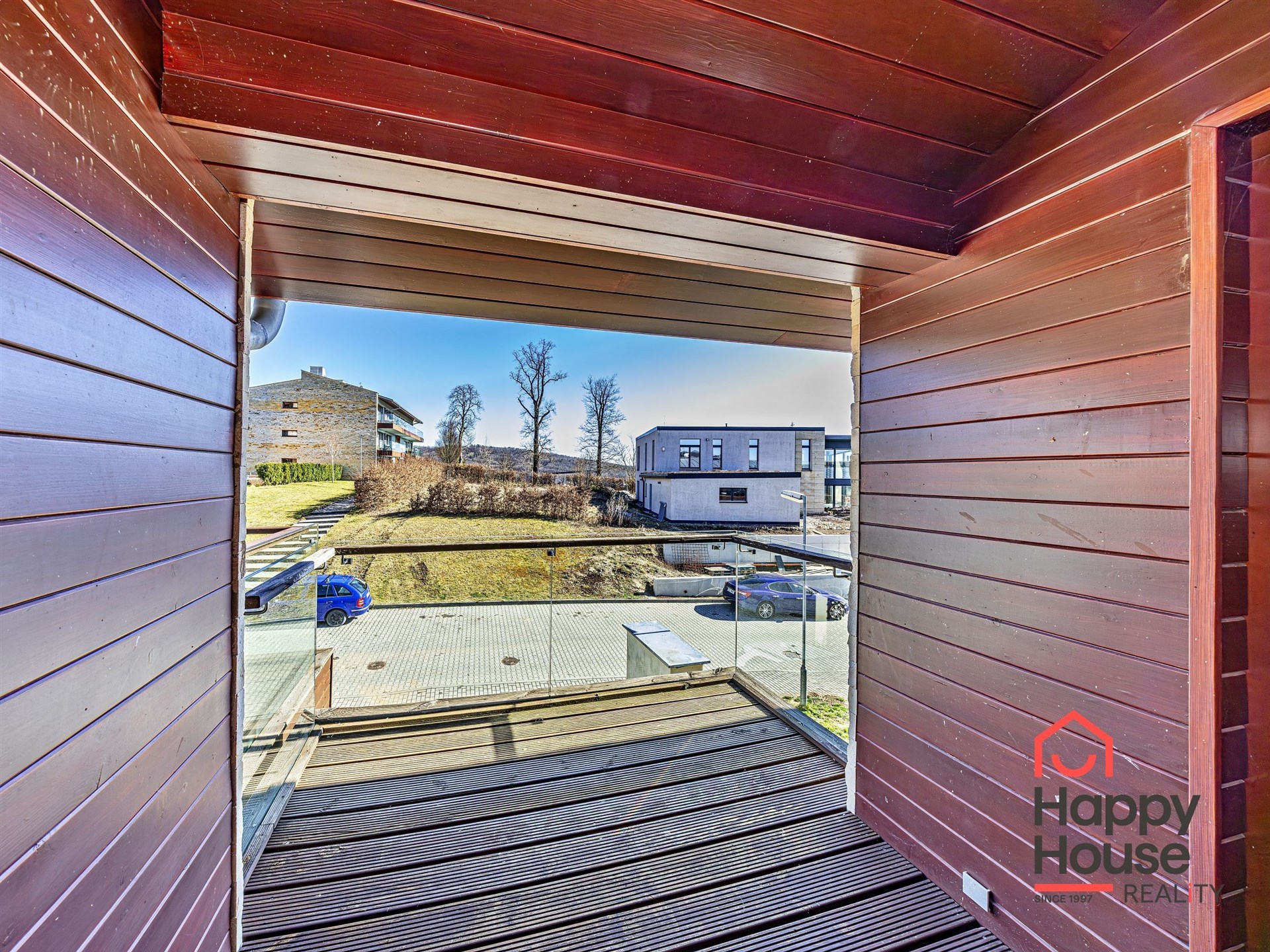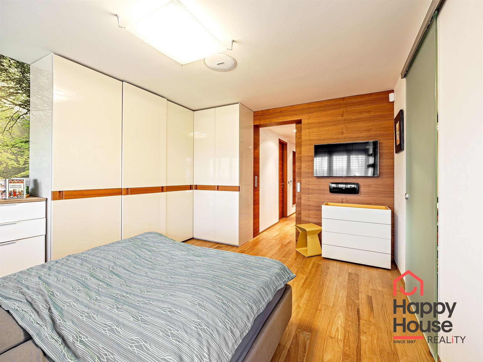 We offer for sale a terraced four-bedroom family house, including a garage and garden, located in the quiet and exclusive area of the Závodí golf resort near the Beroun Golf Club. The house was built approximately 15 years ago and is situated on a plot of 280 sqm. The built-up area is 107 sqm, with a courtyard in front of the house measuring 37 sqm, and also includes a share of a common courtyard area of 377 sqm (1/8 share). The garden behind the house is 184 sqm and offers views of the surrounding countryside. On the ground floor, there is an entrance hall, guest bedroom and a garage; downstairs leads to a spacious living room with a kitchenette, staircase, and direct access to the terrace and garden, and a separate toilet. The first floor features a bedroom, two children's rooms with access to a partially covered balcony, two bathrooms, and a second partially covered balcony. The top floor contains an open-plan office on a gallery and a walk-in closet. One bathroom has a bathtub, two sinks, a toilet, and a heating ladder. The other bathroom has a shower, sink, toilet, heating ladder, washing machine, and dryer. The kitchen is fully equipped - electric and microwave ovens, dishwasher, fridge with freezer, and extractor hood. Ample storage space is provided by built-in wardrobes. Tiling is laid in the ground floor, bathrooms, and toilet, floating flooring in the upper floors, walk-in closet, gallery, and bedroom, and carpets in the rooms. Heating is provided by a gas boiler. Parking is available both in the garage and on two parking spaces on the property in front of the house. The house is located at the end of a dead-end asphalt road with a barrier, entry is allowed only for residents, ensuring peace and security. The property offers beautiful views to the northwest and southeast, directly by the golf course - ideal for lovers of nature, sports, and privacy. No energy label is available - class G is listed.