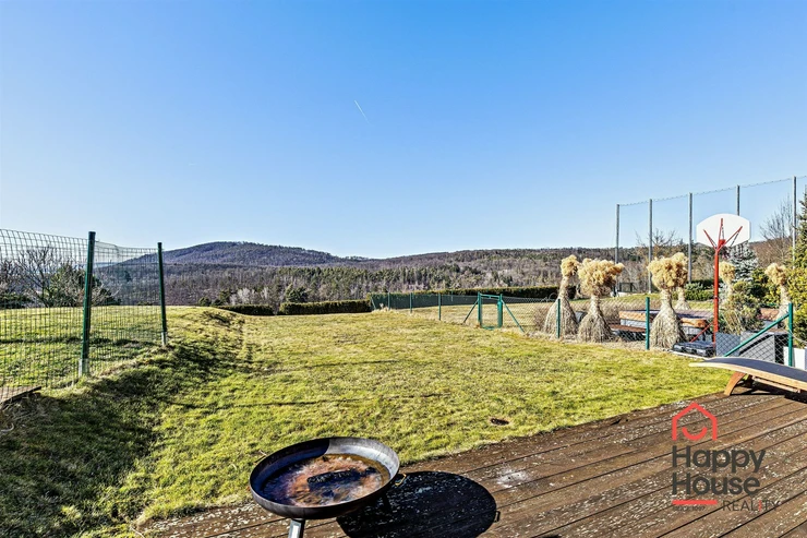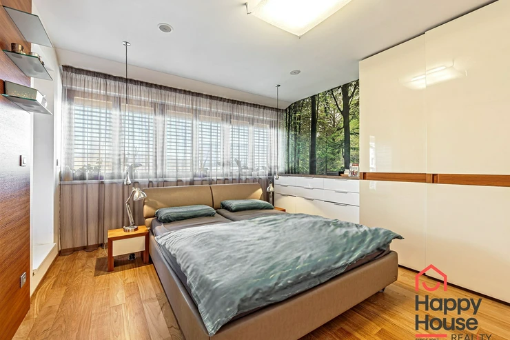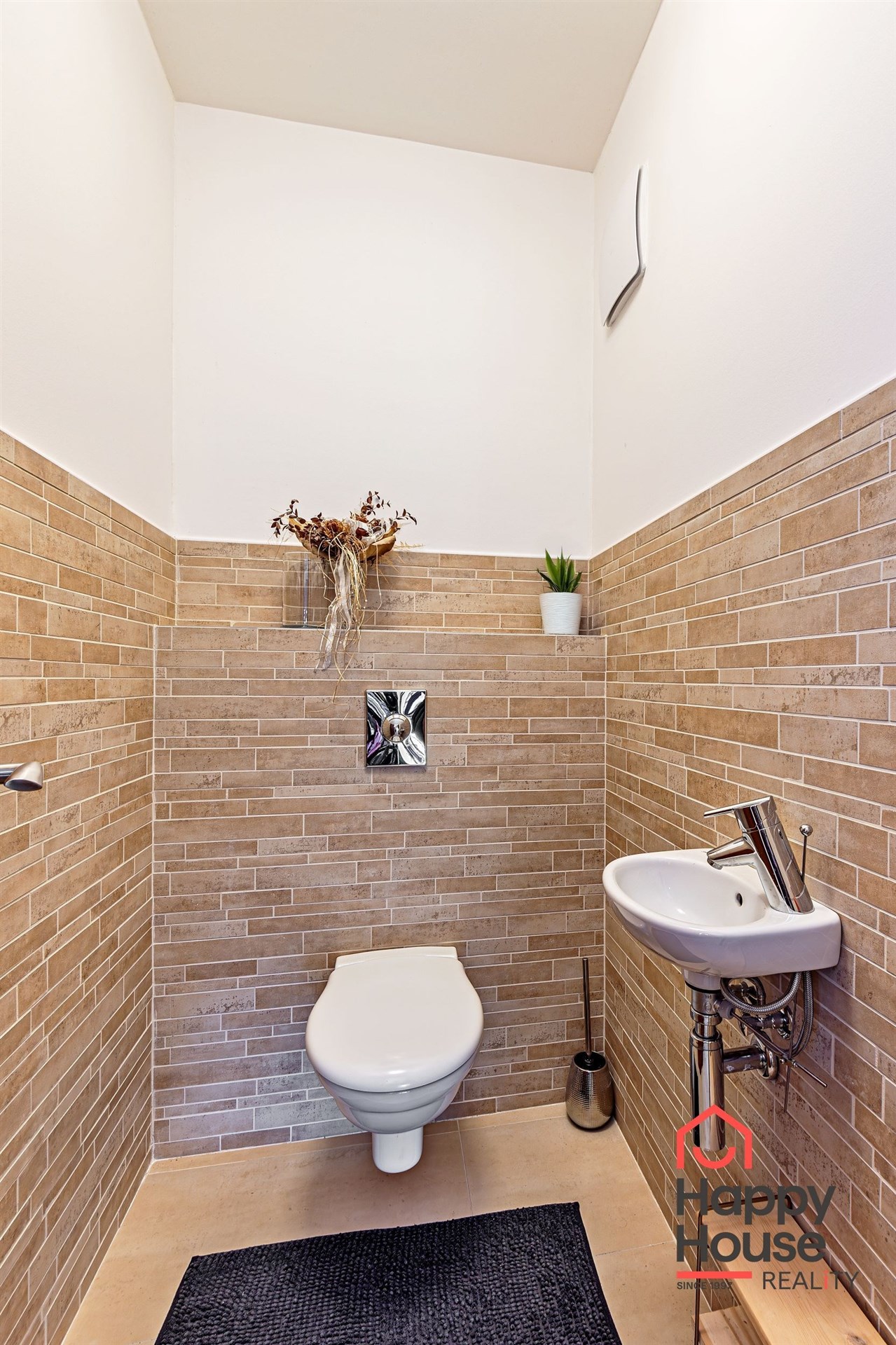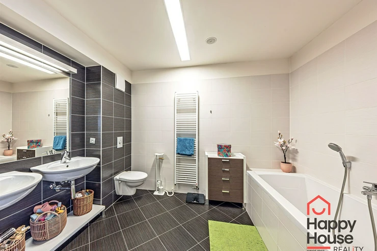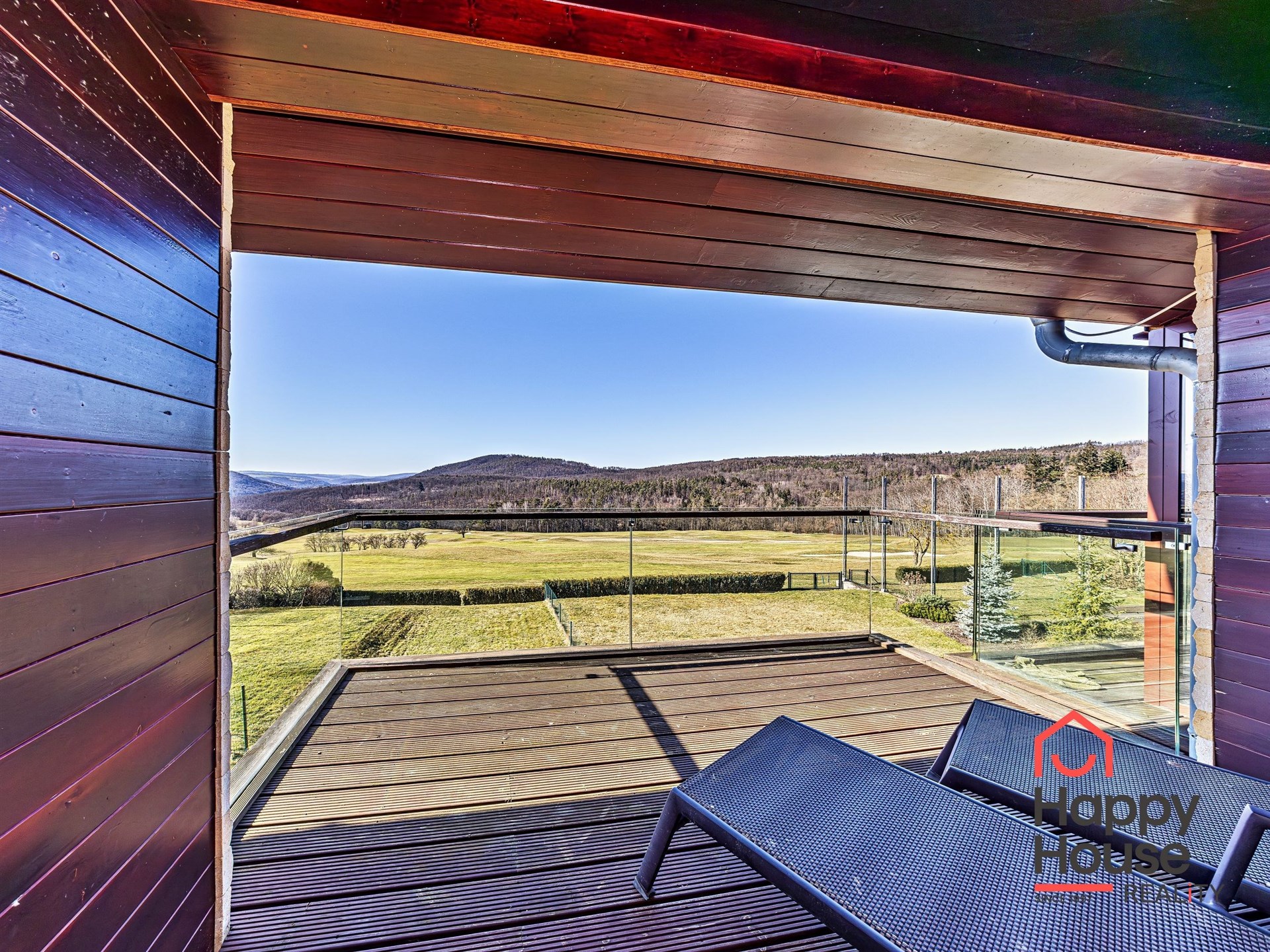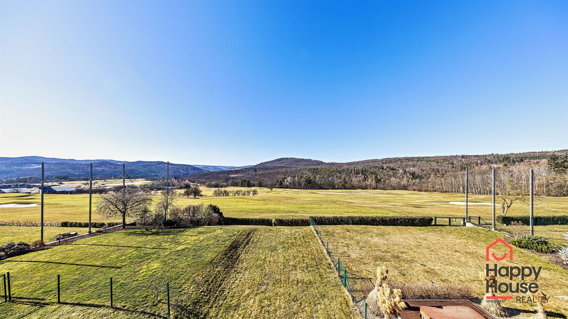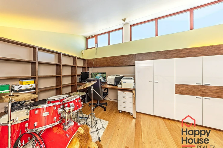We offer for sale a terraced four-bedroom family house, including a garage and garden, located in the quiet and exclusive area of the Závodí golf resort near the Beroun Golf Club. The house was built approximately 15 years ago and is situated on a plot of 280 sqm. The built-up area is 107 sqm, with a courtyard in front of the house measuring 37 sqm, and also includes a share of a common courtyard area of 377 sqm (1/8 share). The garden behind the house is 184 sqm and offers views of the surrounding countryside. On the ground floor, there is an entrance hall, guest bedroom and a garage; downstairs leads to a spacious living room with a kitchenette, staircase, and direct access to the terrace and garden, and a separate toilet. The first floor features a bedroom, two children's rooms with access to a partially covered balcony, two bathrooms, and a second partially covered balcony. The top floor contains an open-plan office on a gallery and a walk-in closet. One bathroom has a bathtub, two sinks, a toilet, and a heating ladder. The other bathroom has a shower, sink, toilet, heating ladder, washing machine, and dryer. The kitchen is fully equipped - electric and microwave ovens, dishwasher, fridge with freezer, and extractor hood. Ample storage space is provided by built-in wardrobes. Tiling is laid in the ground floor, bathrooms, and toilet, floating flooring in the upper floors, walk-in closet, gallery, and bedroom, and carpets in the rooms. Heating is provided by a gas boiler. Parking is available both in the garage and on two parking spaces on the property in front of the house. The house is located at the end of a dead-end asphalt road with a barrier, entry is allowed only for residents, ensuring peace and security. The property offers beautiful views to the northwest and southeast, directly by the golf course - ideal for lovers of nature, sports, and privacy. No energy label is available - class G is listed.
