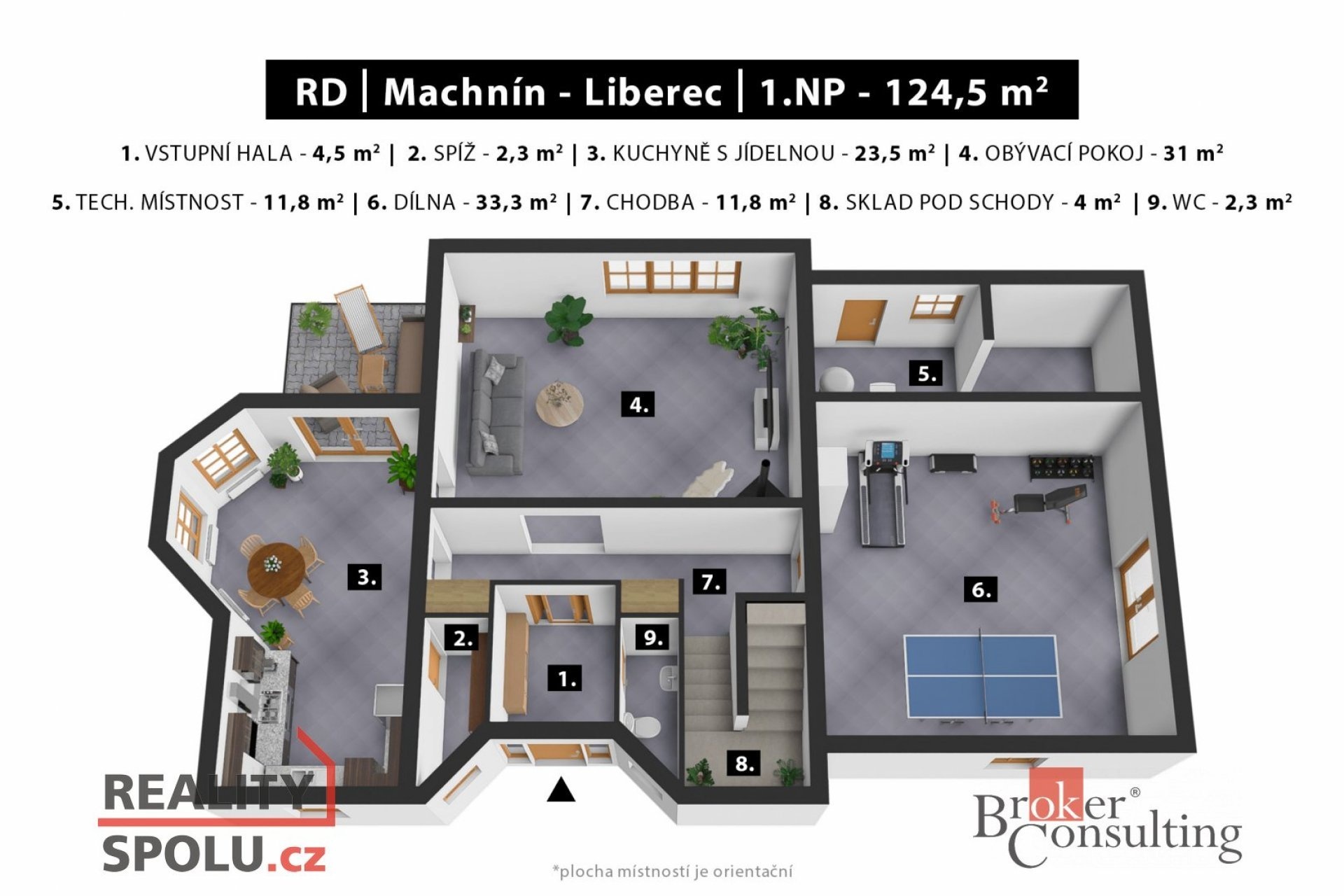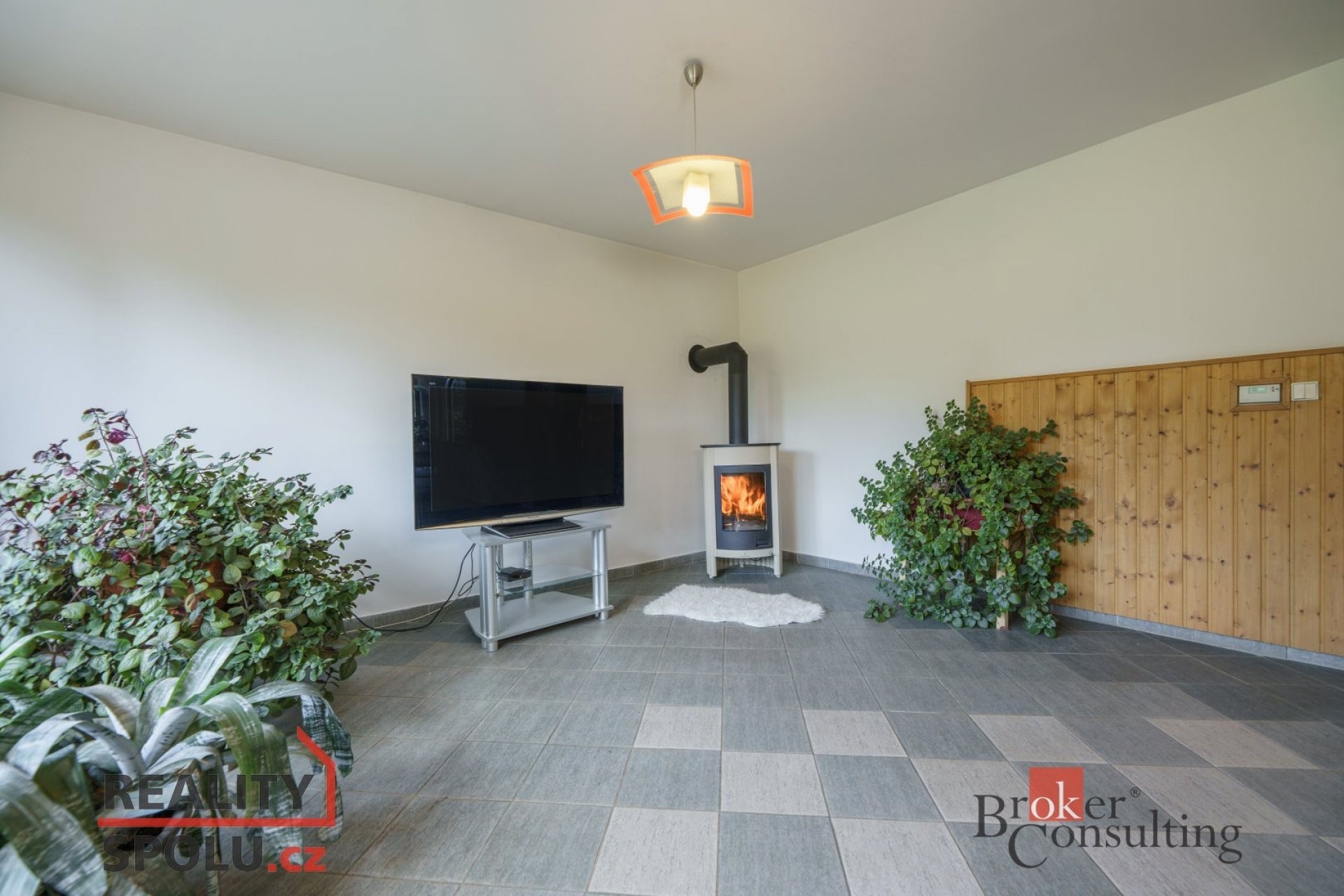 V přízemí najdeme prostorný obývací pokoj s krbovými kamny napojený na jídelnu s kuchyňským koutem, která přímo navazuje na venkovní terasu. Dále je zde umístěna velká dílna či prostor pro tělocvičnu s francouzskými okny a východem do zahrady. Zároveň je zde připravena místnost pro samostatnou toaletu.