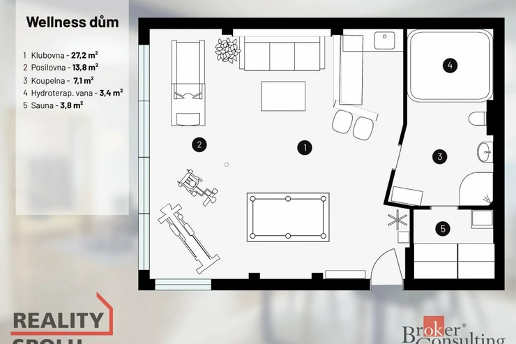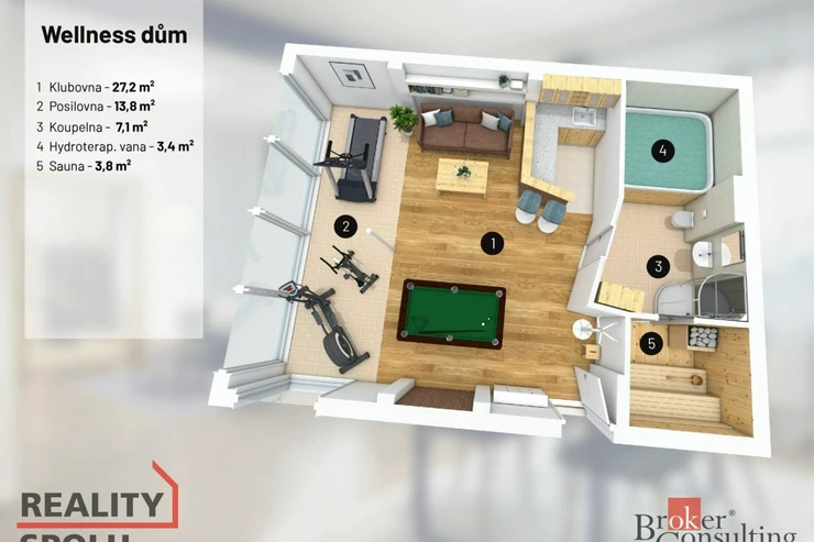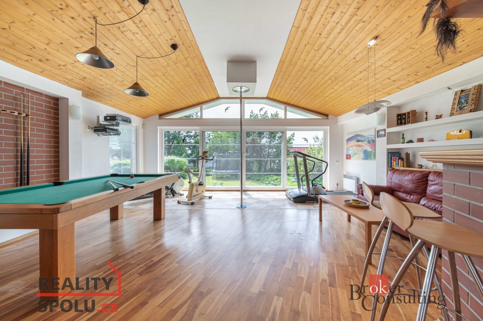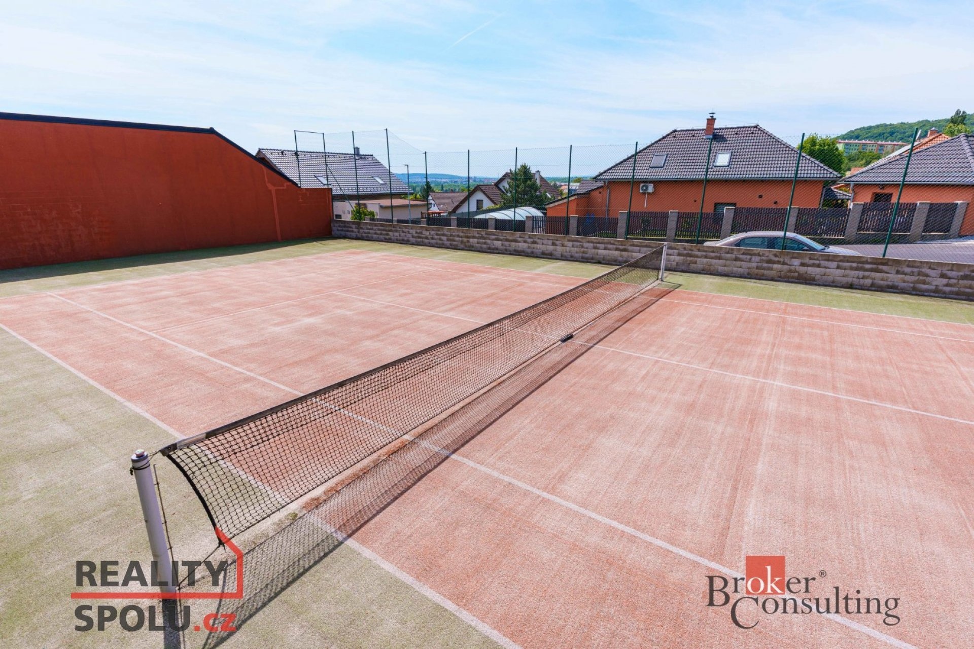 Součástí je také Welness dům, ve kterém je vířivka, sauna, billiard, tělocvična, elektrické rolety a dokonce i výčepní set. Dále také kurt s umělým povrchem (možnost využít i jako víceúčelové hřiště). Vedle tenisového kurtu se nachází 2 velké garáže, do kterých se vejde až 8 aut. Obě garáže disponují vodovodní přípojkou a třífázovou elektřinou (400 V), což přináší nadstandardní komfort zejména pro uživatele elektromobilů. Vedle garáží je další zahrada s ohništěm a vlastní vodárnou, která poskytuje vlastní zdroj užitkové vody pro automatické zavlažování zahrady a zároveň může sloužit jako vinný sklípek.