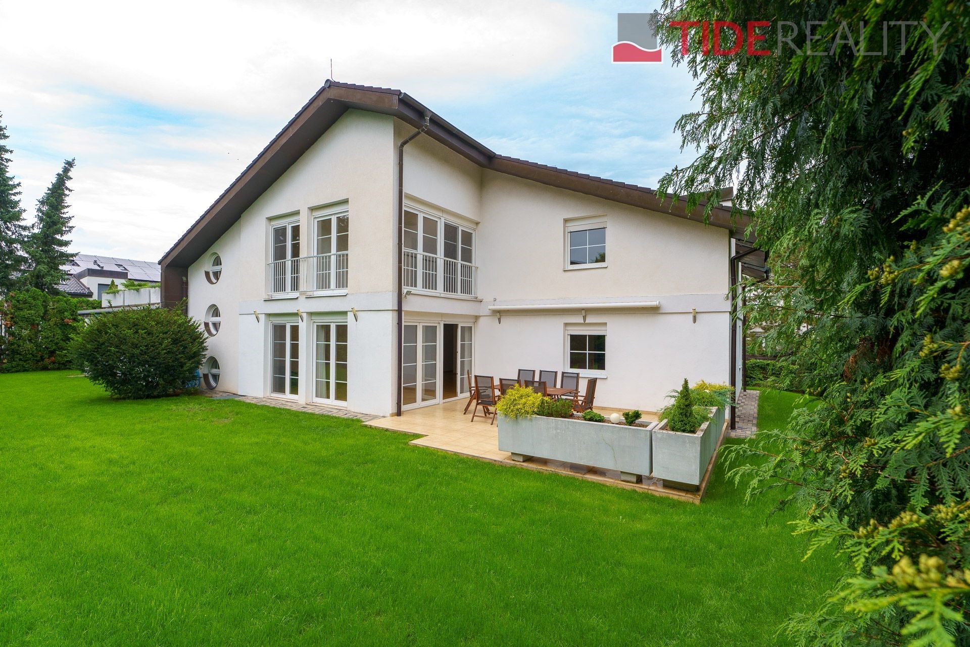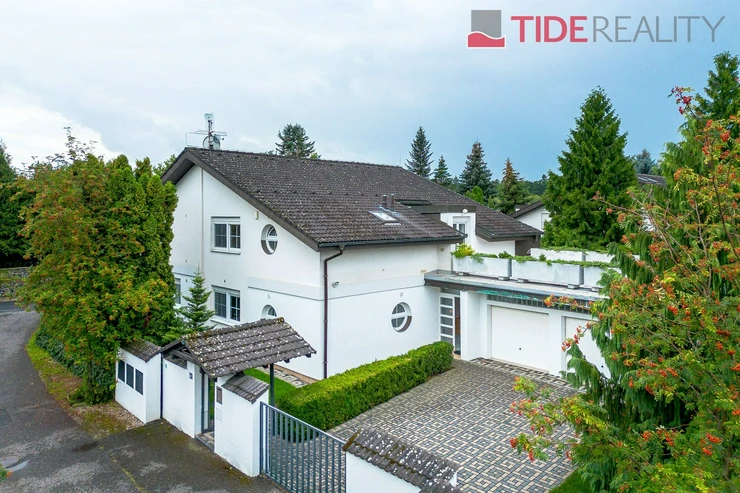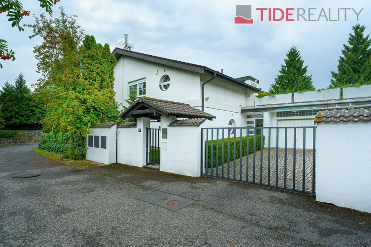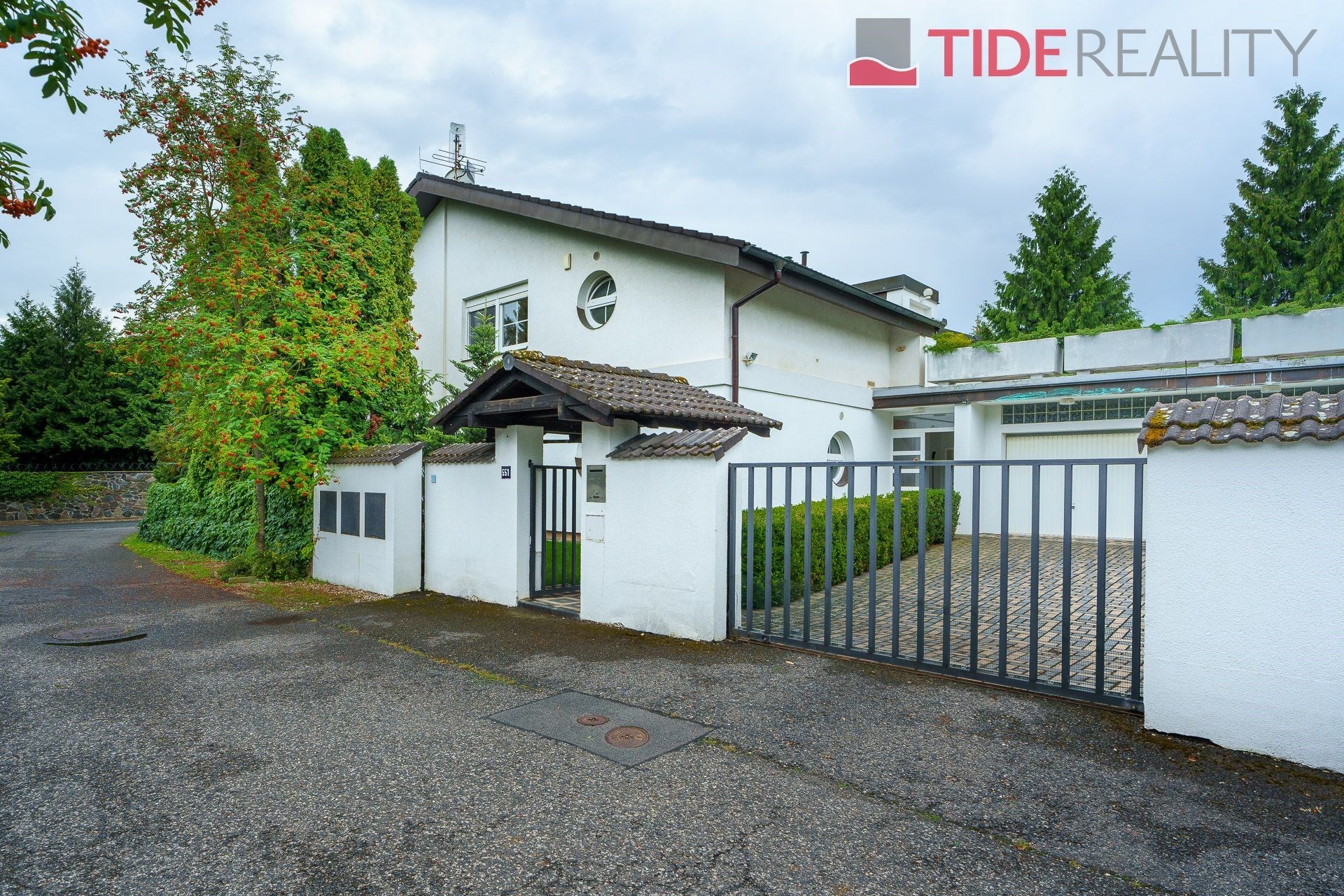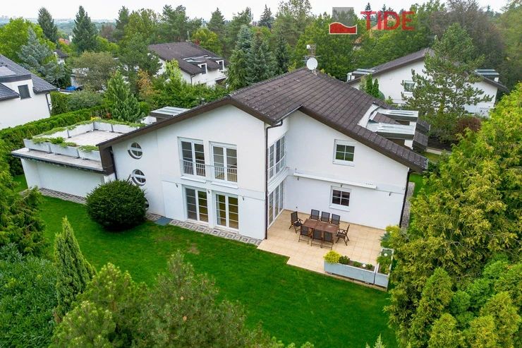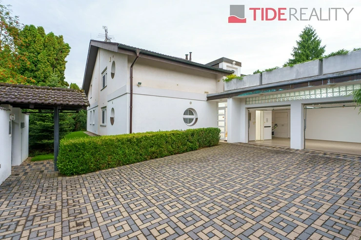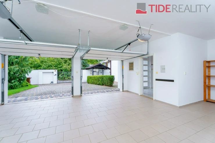 We offer for sale a very spacious villa, in the beautiful and unique location of Průhonice - next to Průhonice Park. The house, surrounded by mature greenery ensuring complete privacy, can be used for multi-generational living due to its size and layout. The house, with a built-up area of 283m2 and a carefully maintained mature garden of 717m2, has a total usable area of 416m2, which is spread over three floors. The first basement level (1.PP) consists of a storage space of 60m2, the first floor (1.NP, 197m2) has a two-car garage with a direct connection to the house, and mainly a generously designed living room connected to a high-quality and fully equipped kitchen covering a total area of 72m2 with a southwest-facing terrace and garden access, plus 2 spacious rooms, 2 bathrooms, a separate toilet, and a boiler room (gas) for this floor.