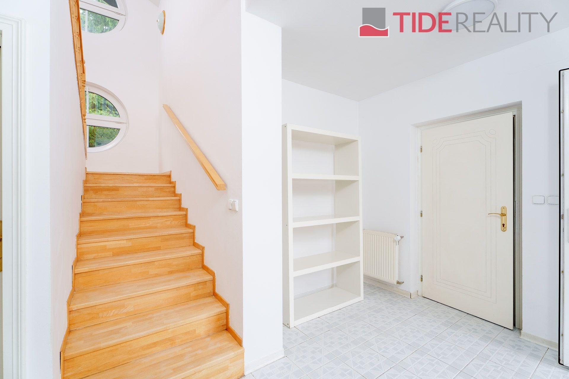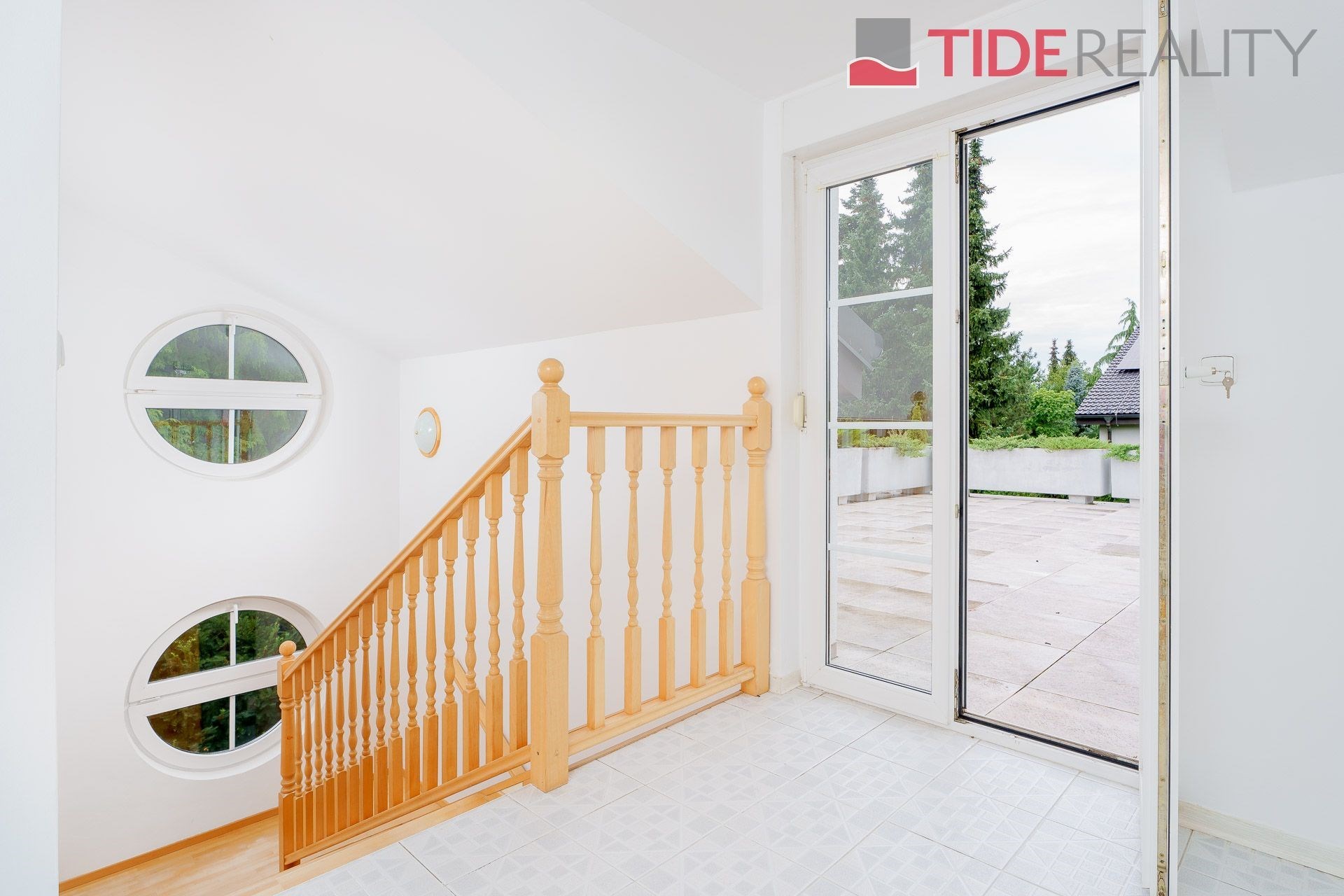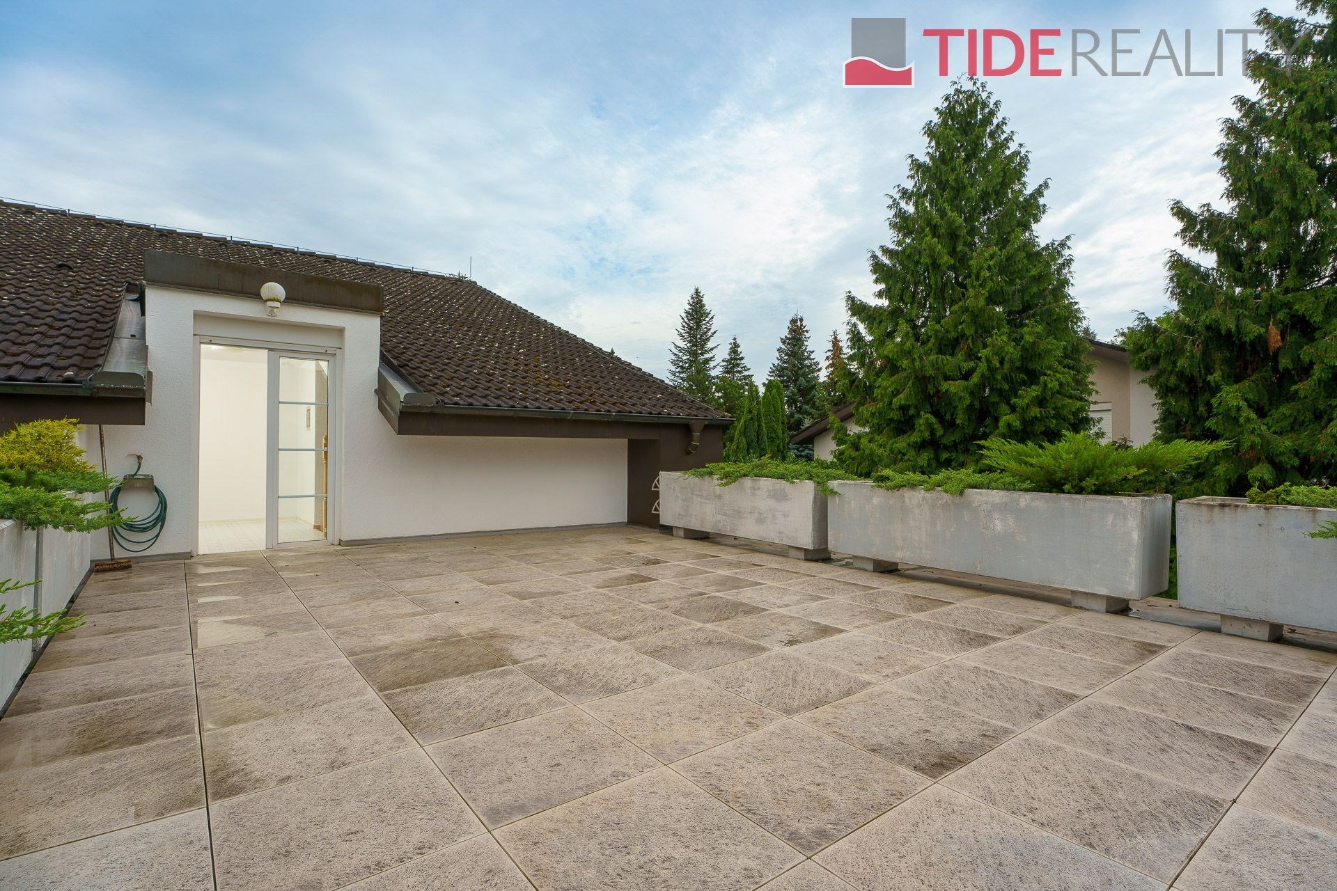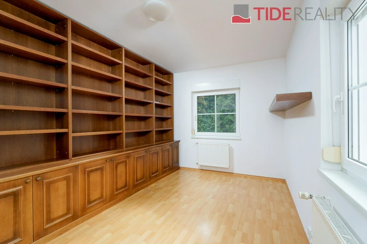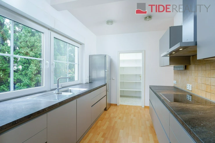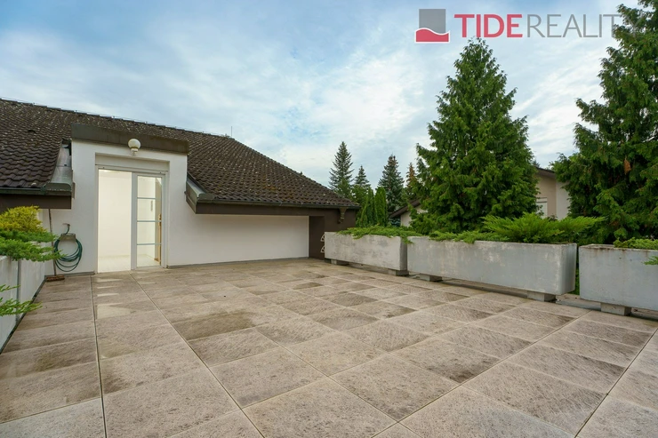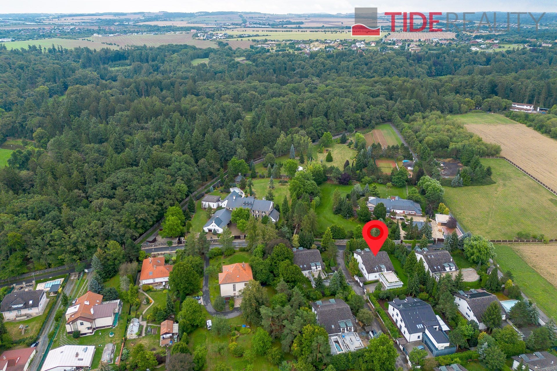 We offer for sale a very spacious villa, in the beautiful and unique location of Průhonice - next to Průhonice Park. The house, surrounded by mature greenery ensuring complete privacy, can be used for multi-generational living due to its size and layout. The house, with a built-up area of 283m2 and a carefully maintained mature garden of 717m2, has a total usable area of 416m2, which is spread over three floors. The first basement level (1.PP) consists of a storage space of 60m2, the first floor (1.NP, 197m2) has a two-car garage with a direct connection to the house, and mainly a generously designed living room connected to a high-quality and fully equipped kitchen covering a total area of 72m2 with a southwest-facing terrace and garden access, plus 2 spacious rooms, 2 bathrooms, a separate toilet, and a boiler room (gas) for this floor.