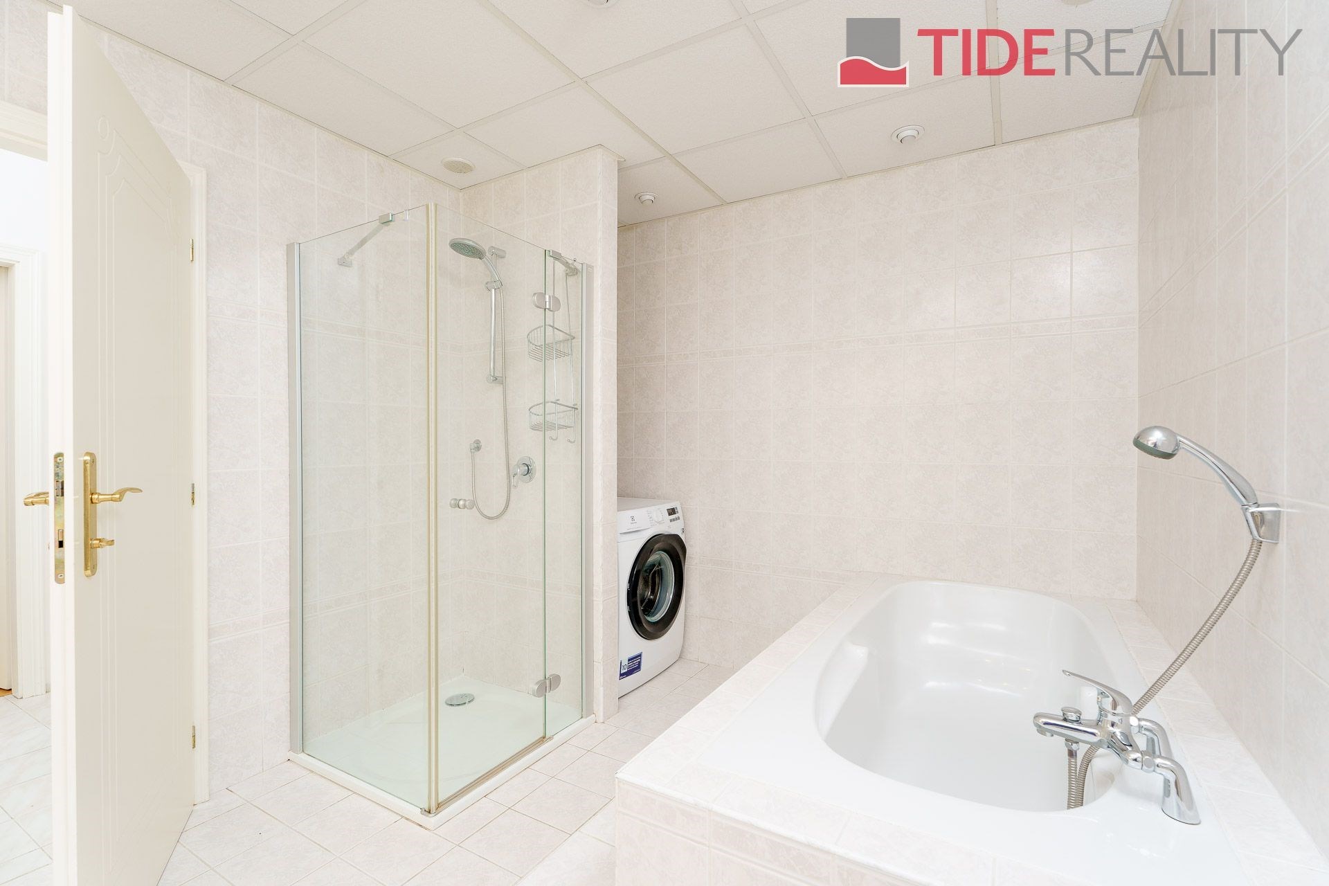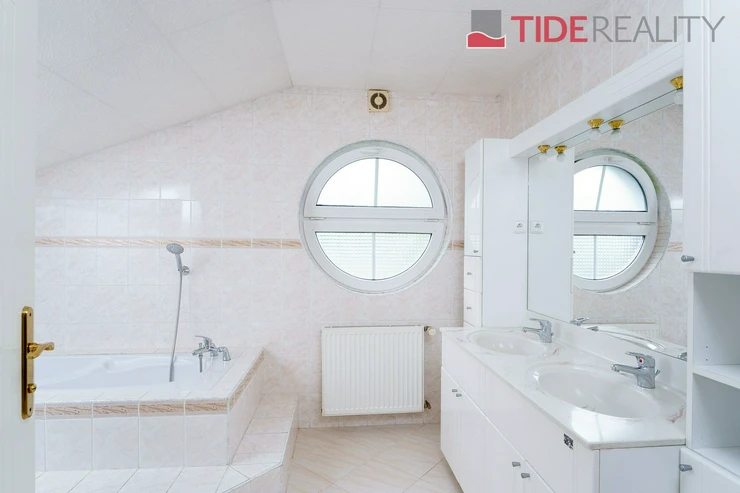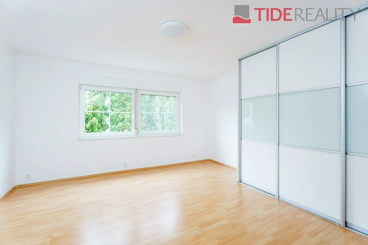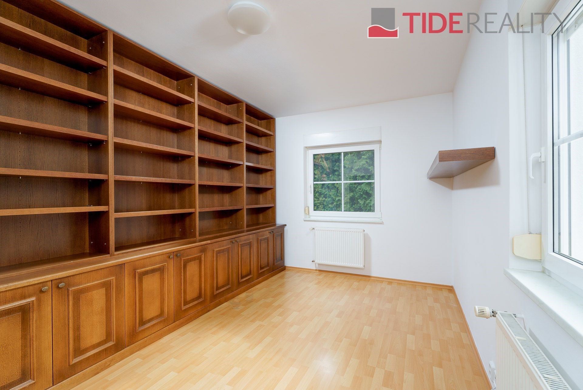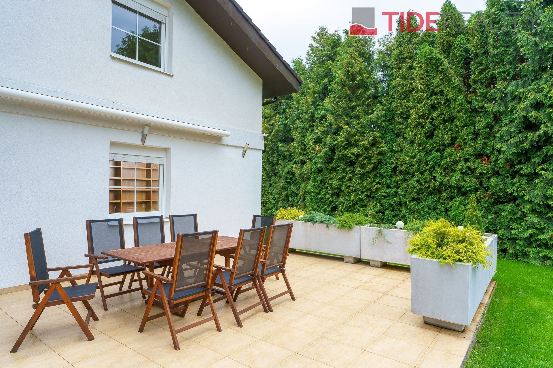We offer for sale a very spacious villa, in the beautiful and unique location of Průhonice - next to Průhonice Park. The house, surrounded by mature greenery ensuring complete privacy, can be used for multi-generational living due to its size and layout. The house, with a built-up area of 283m2 and a carefully maintained mature garden of 717m2, has a total usable area of 416m2, which is spread over three floors. The first basement level (1.PP) consists of a storage space of 60m2, the first floor (1.NP, 197m2) has a two-car garage with a direct connection to the house, and mainly a generously designed living room connected to a high-quality and fully equipped kitchen covering a total area of 72m2 with a southwest-facing terrace and garden access, plus 2 spacious rooms, 2 bathrooms, a separate toilet, and a boiler room (gas) for this floor.