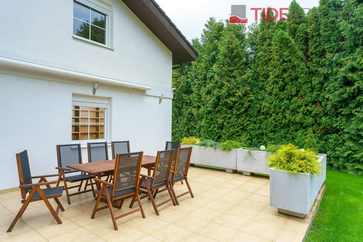 The whole house has floating floors combined with ceramic tiles, floor heating throughout the entire 1.NP combined with radiators, plastic windows with external roller blinds, a home security system, controlled irrigation of the garden, and a mobile electric pergola over the terrace.