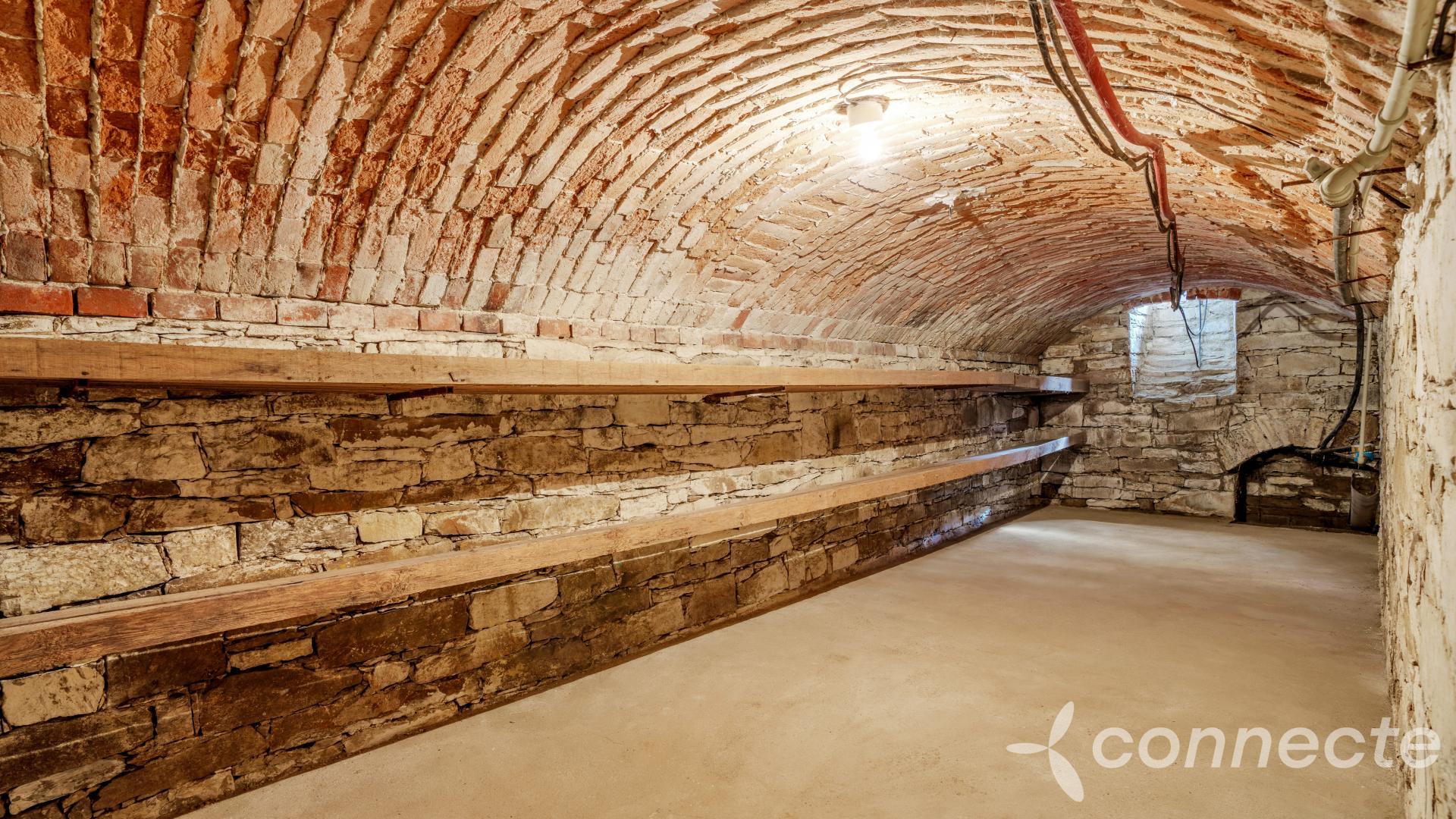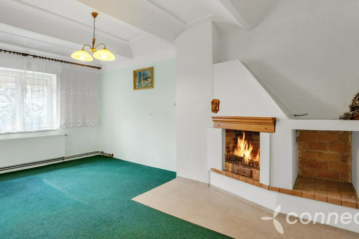 Another room, 25 m2, has a built-in, fully functional fireplace, with tasteful tiling in front to protect the floor. The 17 m2 kitchen leads into another room of 18 m2 and also to a beautiful, vaulted, dry cellar with its own spring. All living areas have windows facing the garden and exterior roller shutters.