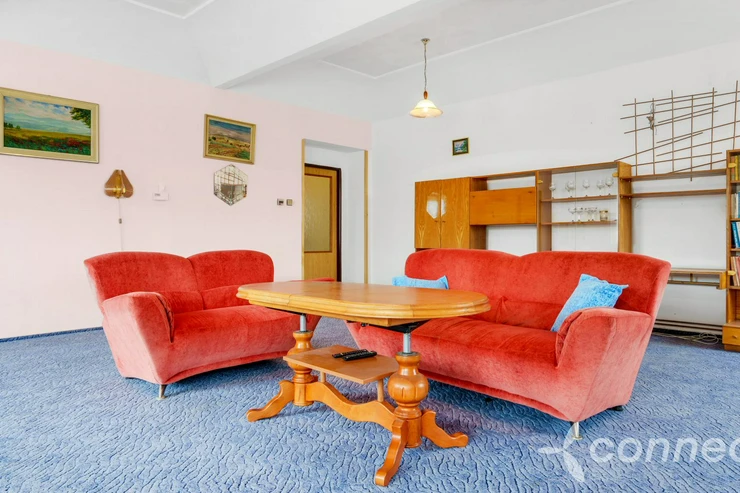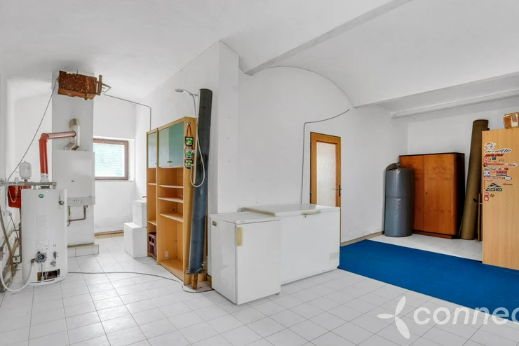 The hallway continues to the toilet, a 7 m2 bathroom, and the attic. From the bathroom, there is access to a large boiler room with a gas boiler, water heater, storage space, and freezer. An adjacent room with a toilet offers the possibility of conversion into a separate 1+1 apartment with a front entranceideal, for example, for a caretaker or company facilities.