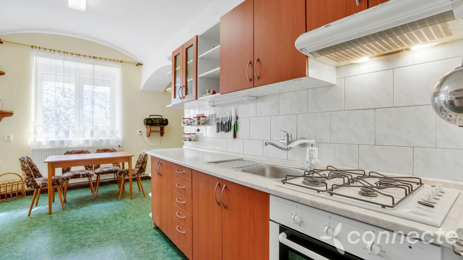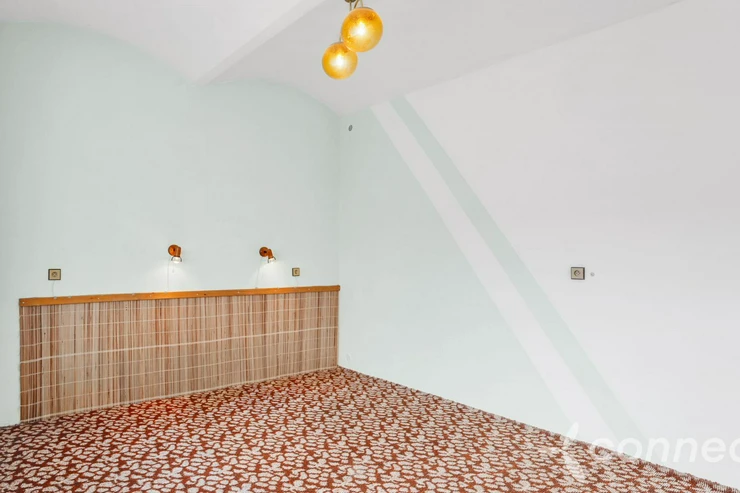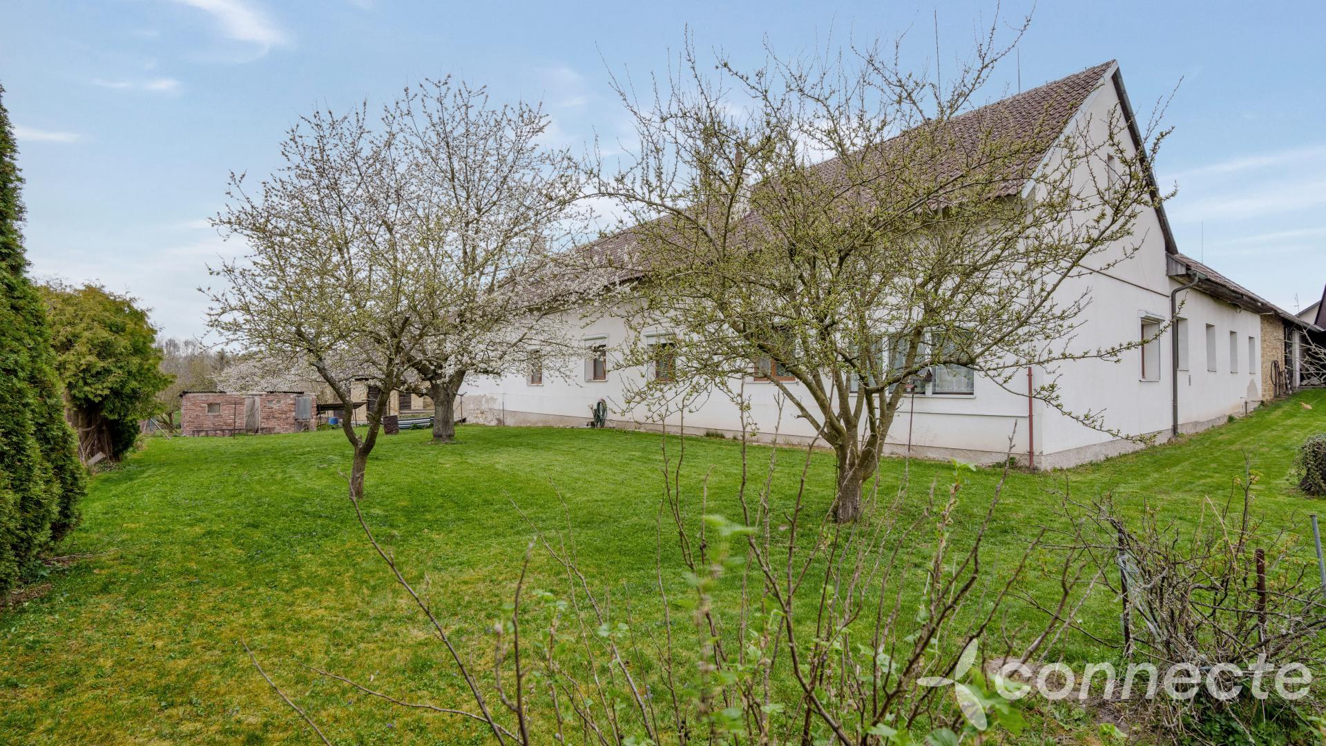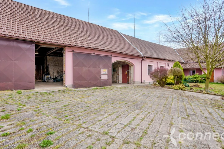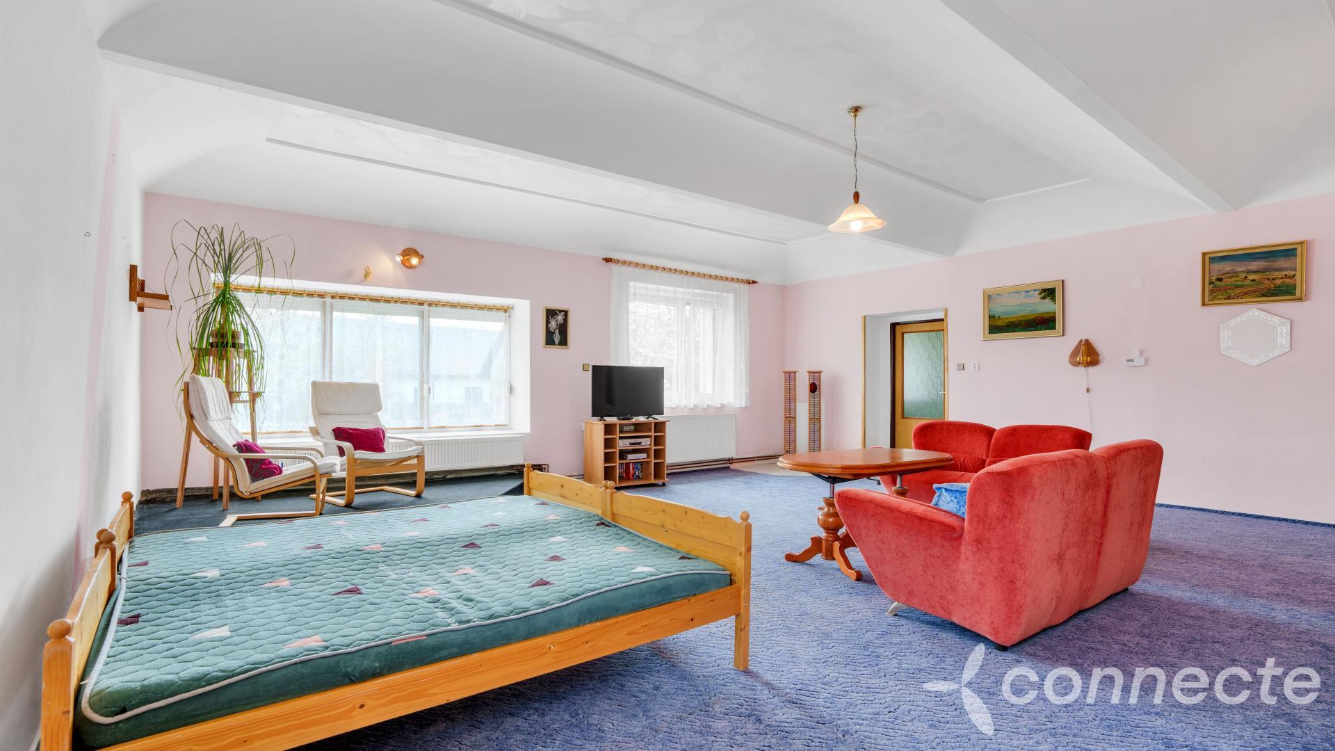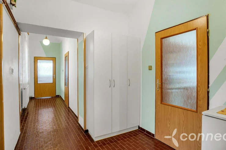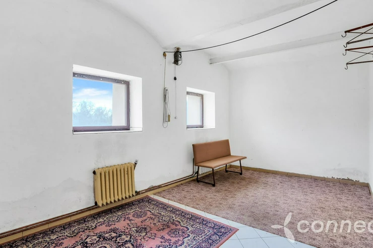 The house has several living and work areas. Entry is through a veranda into a long hallway, from which there is access to the individual rooms. The 3+1 layout includes an exceptionally spacious living room of 60 m2. The room has a window prepared for a future entrance to the garden and could be re-divided into smaller rooms (it originally contained several). There is a chimney for a wood stove and preserved beautiful vaulted ceilings.