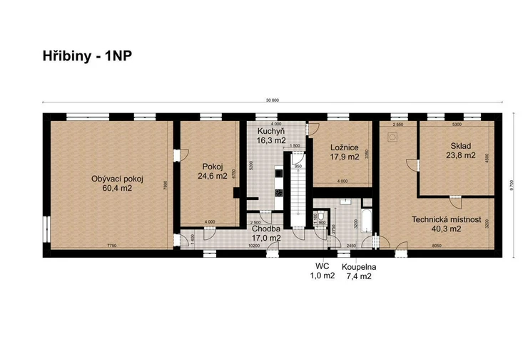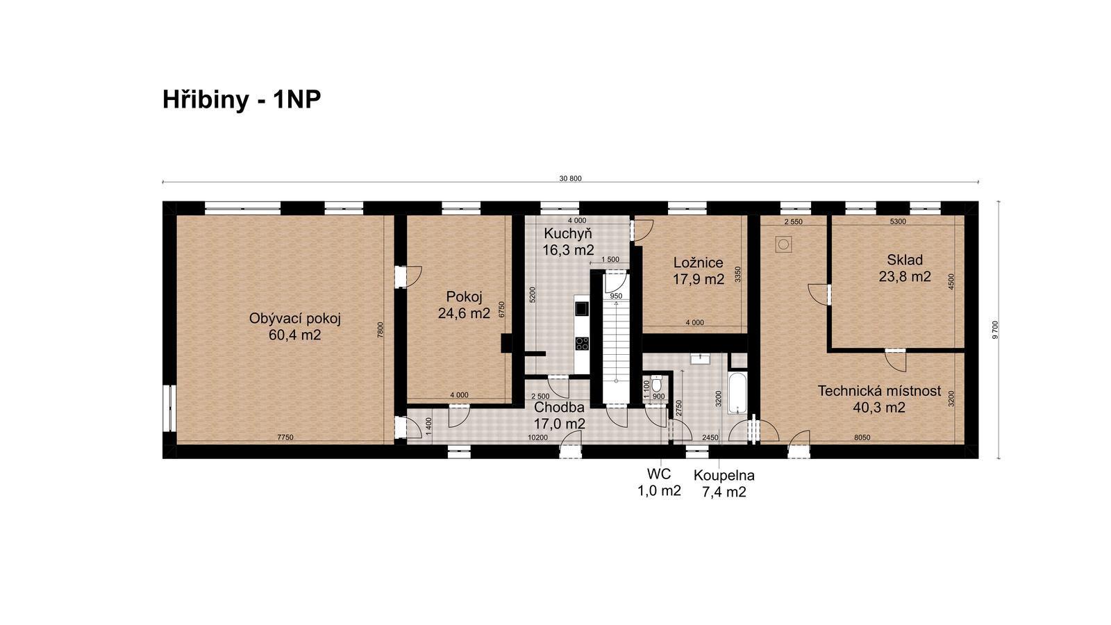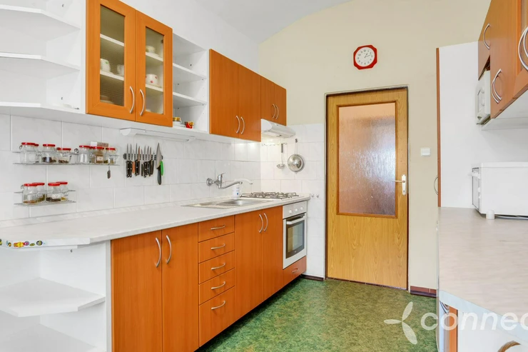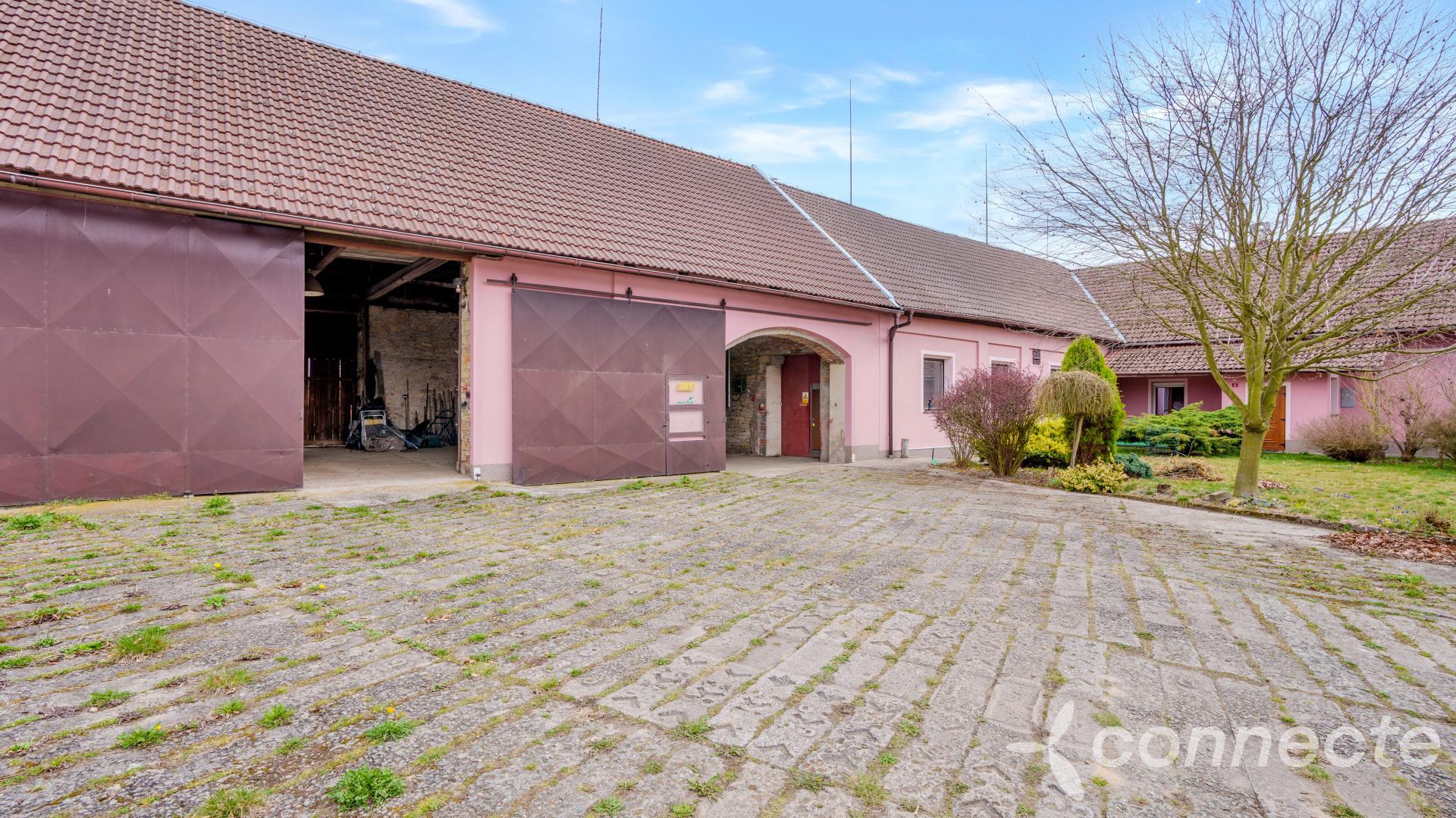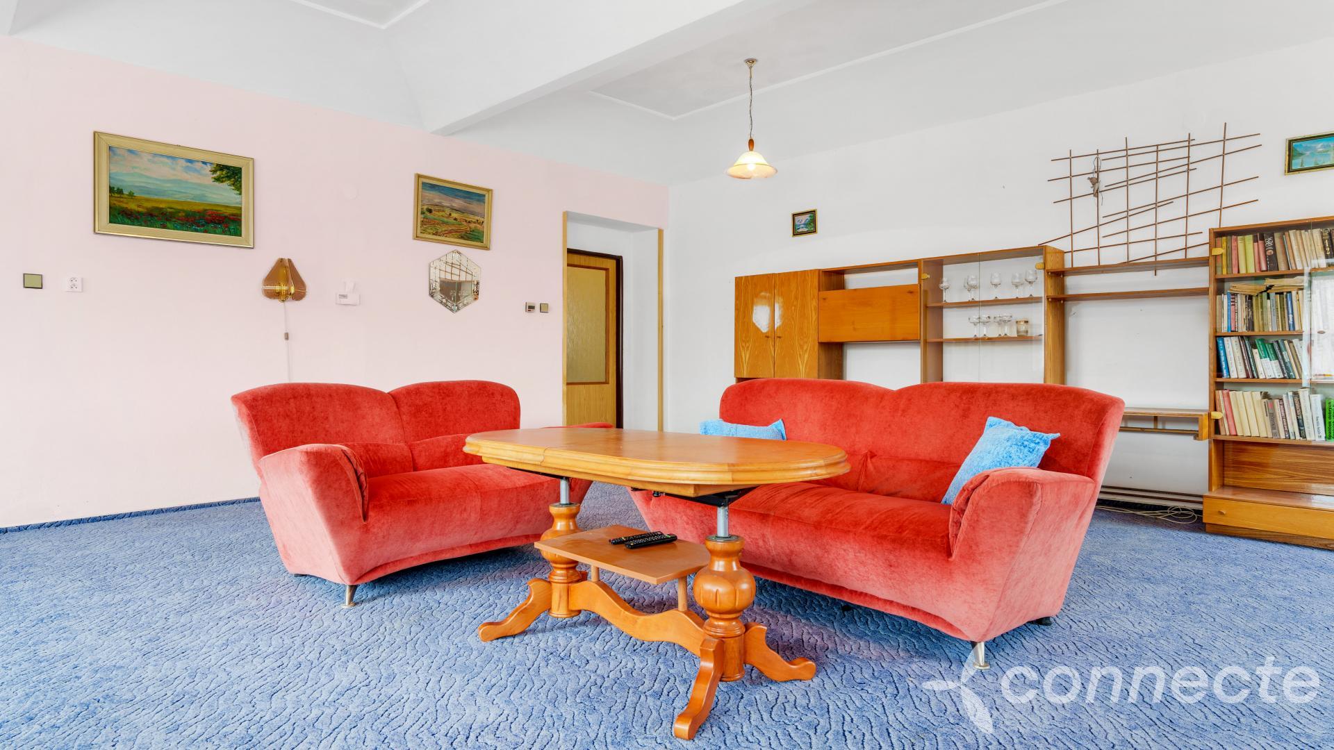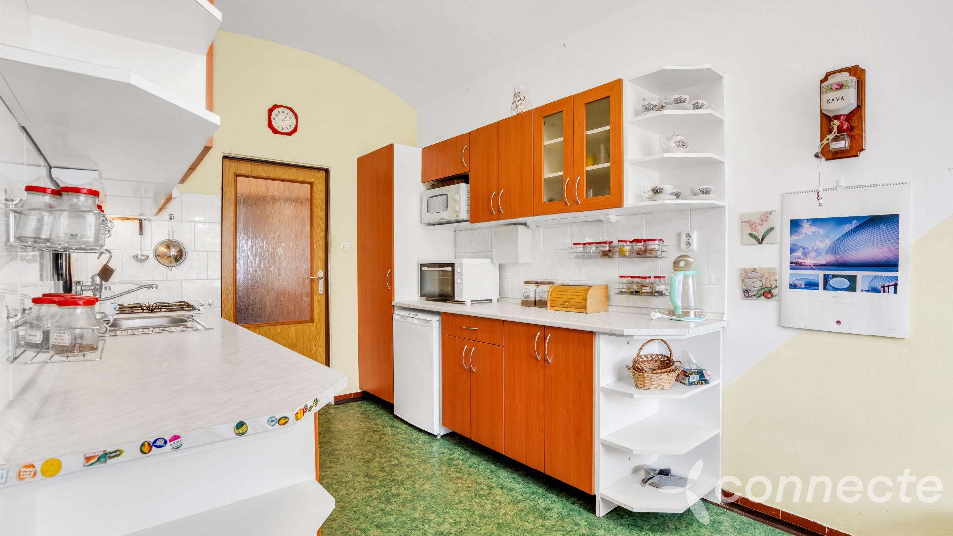 The house has several living and work areas. Entry is through a veranda into a long hallway, from which there is access to the individual rooms. The 3+1 layout includes an exceptionally spacious living room of 60 m2. The room has a window prepared for a future entrance to the garden and could be re-divided into smaller rooms (it originally contained several). There is a chimney for a wood stove and preserved beautiful vaulted ceilings.