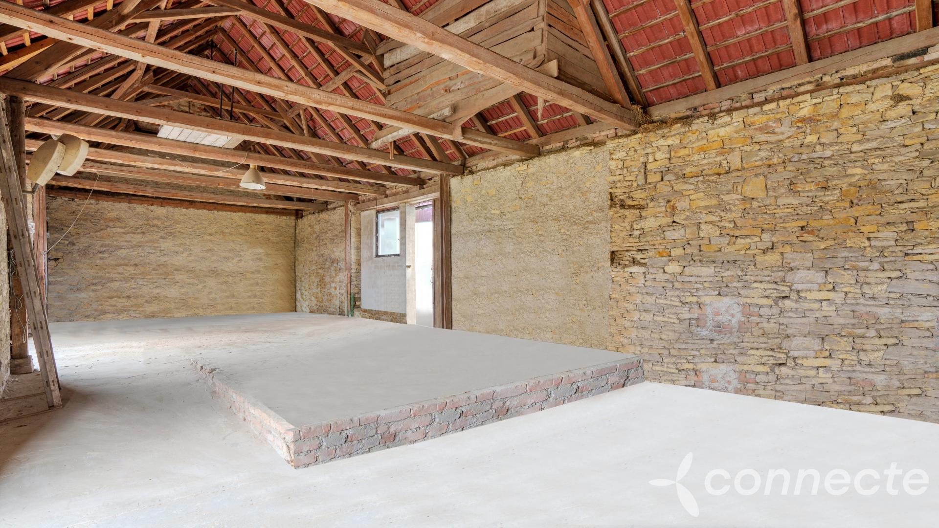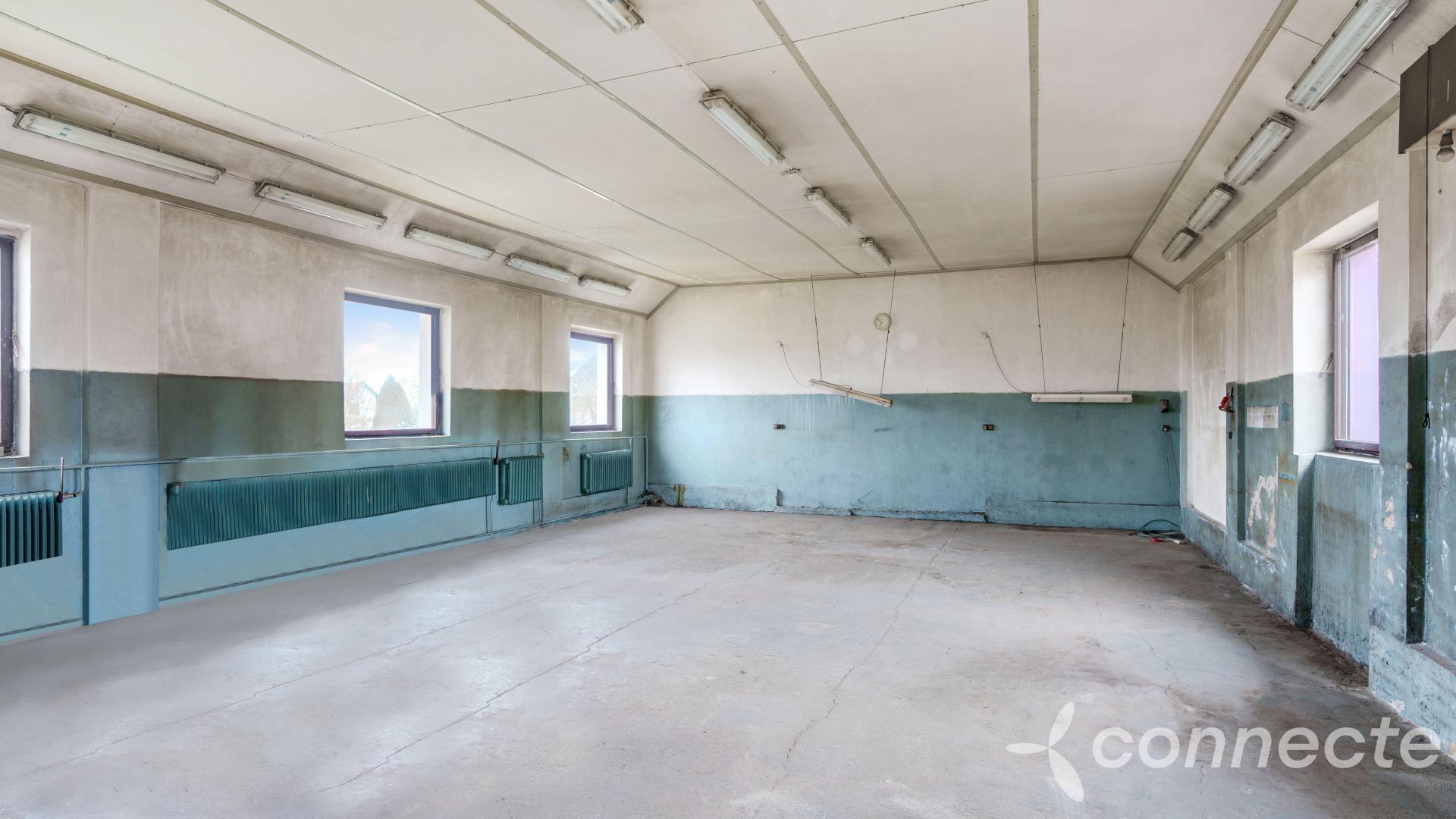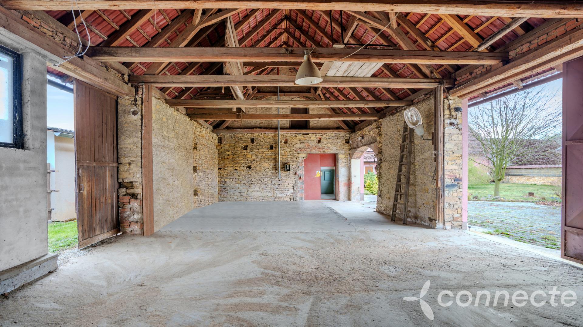 In 1989, a former dance hall was converted into a locksmiths workshop with an adjoining office. The space is now cleared and ready for new use. The workshop has its own gas meter, electricity meter, and water supply. It connects to a barn with large storage space, featuring two large sliding doors for easy vehicle access and material handling. The workshop itself is also secured with gates, allowing direct and convenient drive-in access.