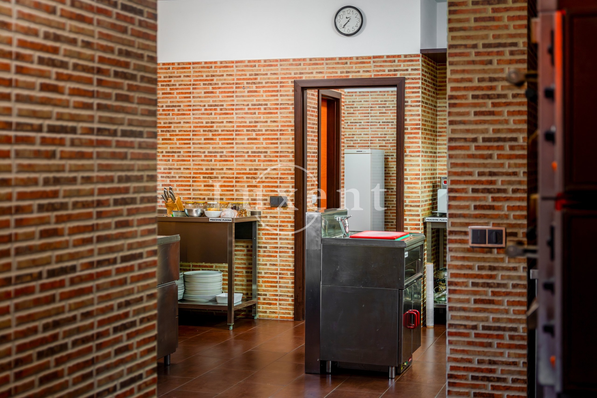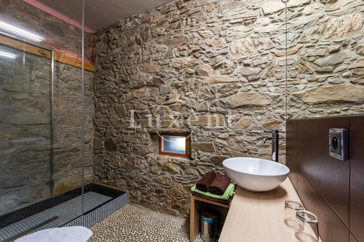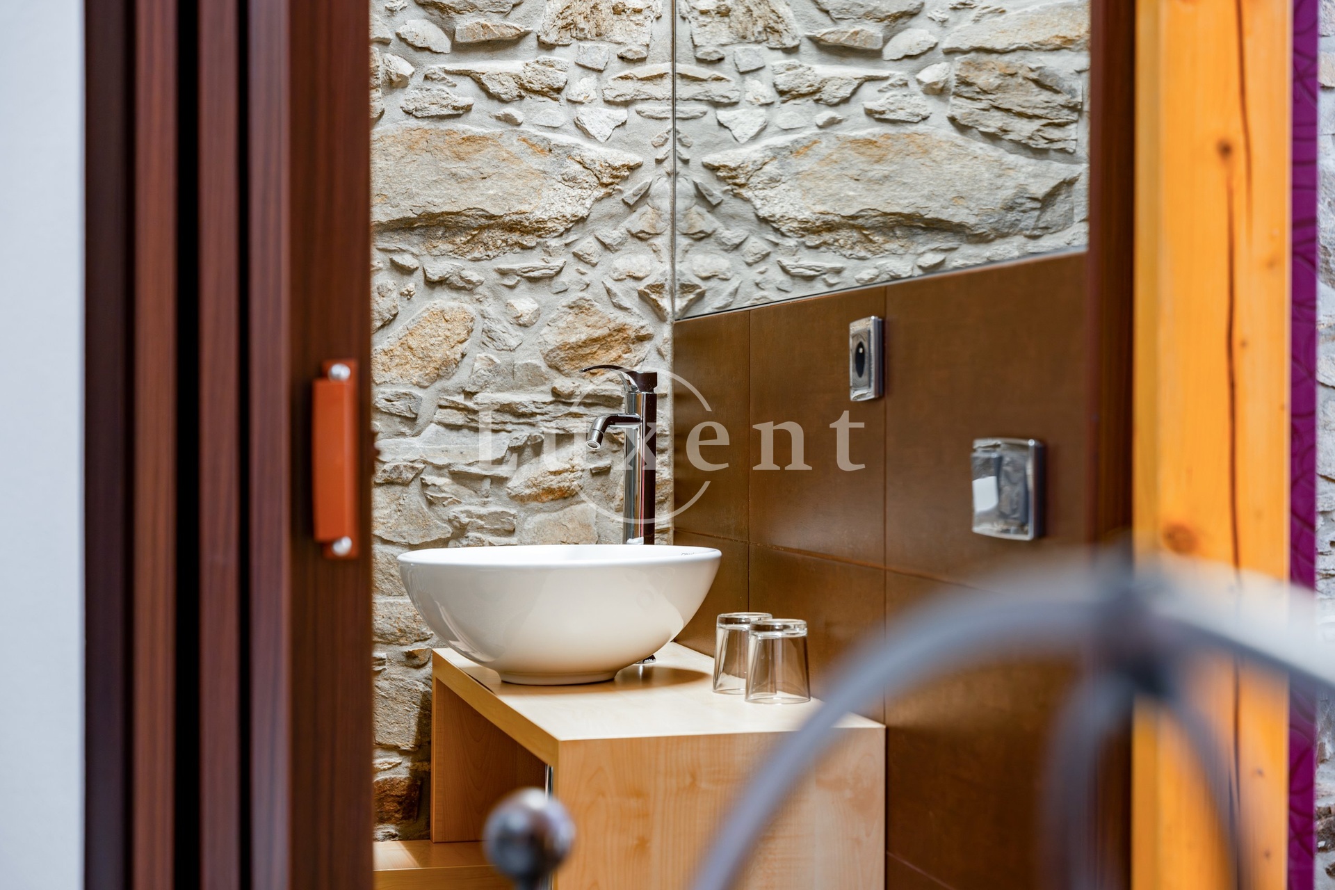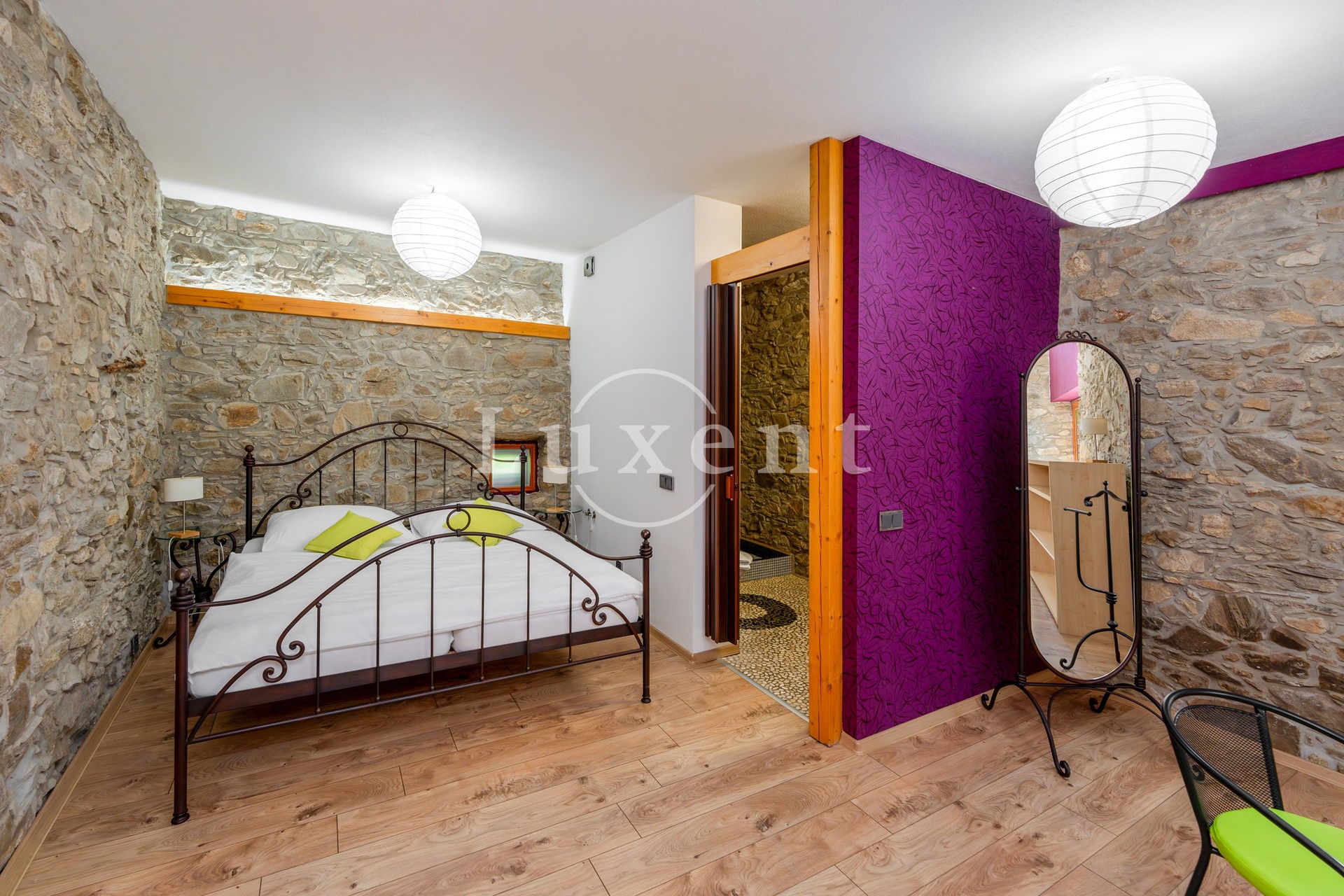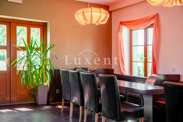 The house has two separate parts. The main part offers on the 1st floor: a spacious living room with a fireplace and 5 rooms with bathrooms. There are also hallways and storage and technical facilities. In the second, closely adjacent part of the property, there are two designer studios with bathrooms, each on its own floor with privacy. The lower studio is prepared for a wellness area with a sauna and a stylish terrace. Both studios can be used or rented separately and can also be connected to form a single maisonette apartment with a terrace. The property has been used as a guesthouse with a restaurant and also for residential purposes. The new owner can customize the interior according to their own ideas.