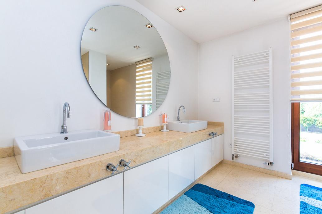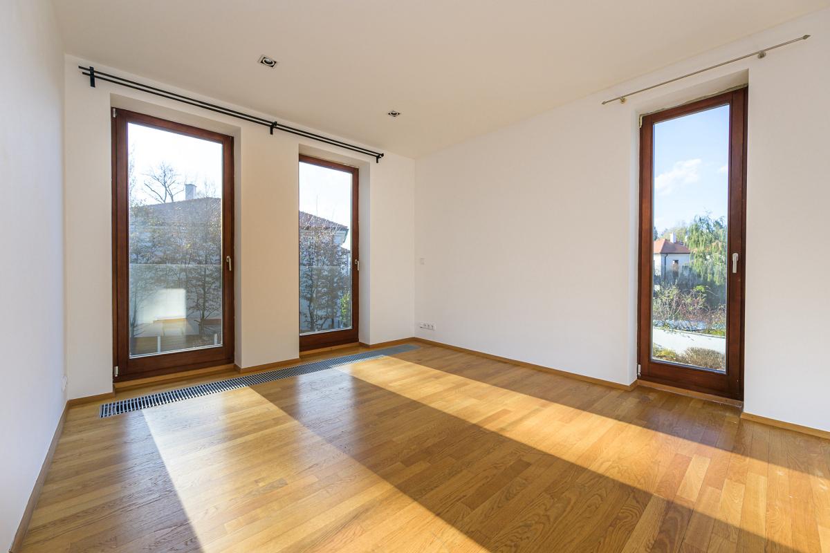 V patře se nacházejí tři ložnice a samostatná prostorná koupelna. Hlavní ložnice má navíc vlastní koupelnu se sprchovým koutem a toaletou. Ze dvou ložnic je přístup na balkon s výhledem do zahrady.