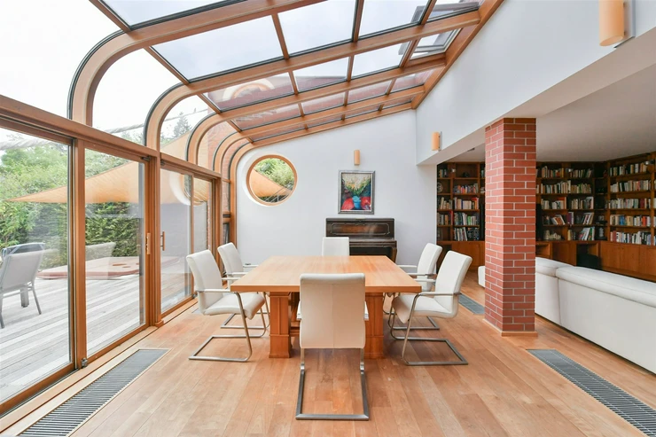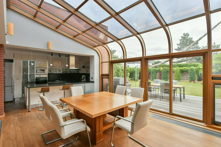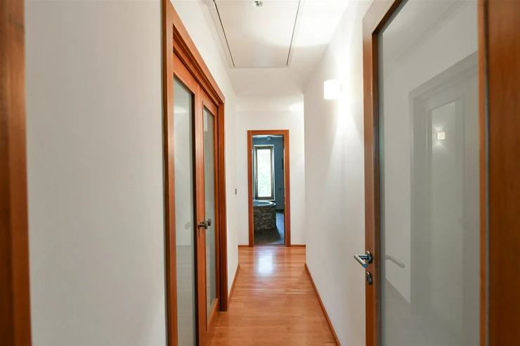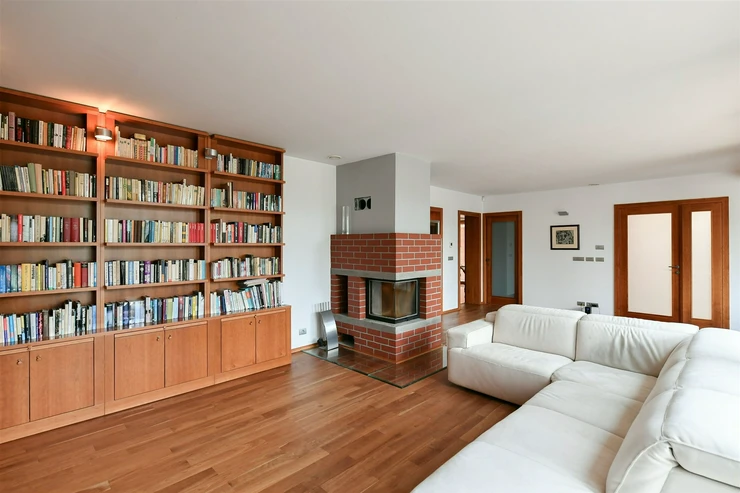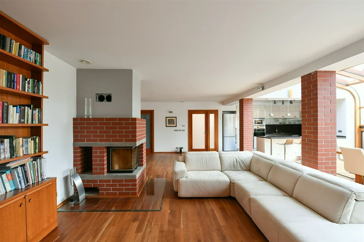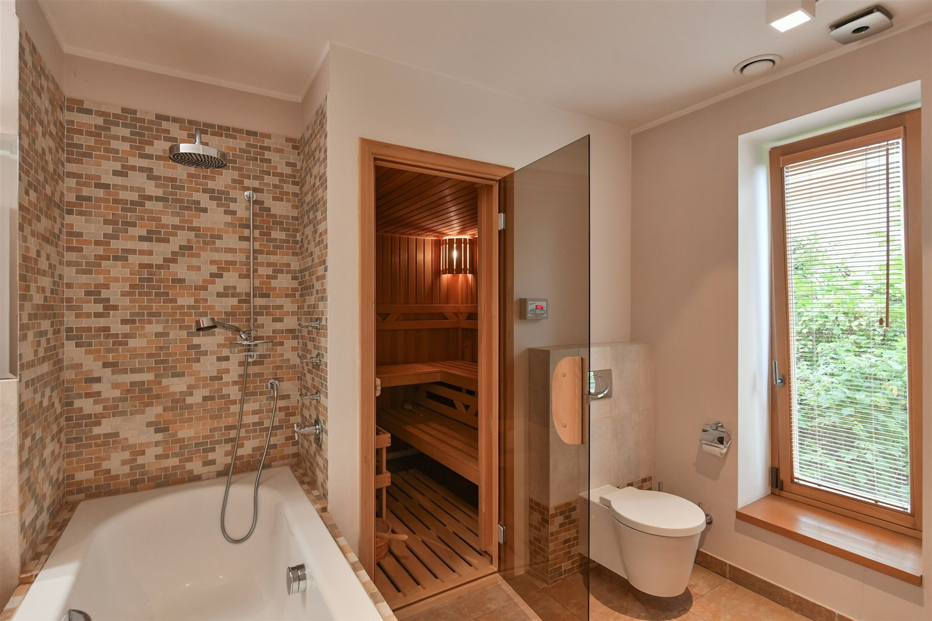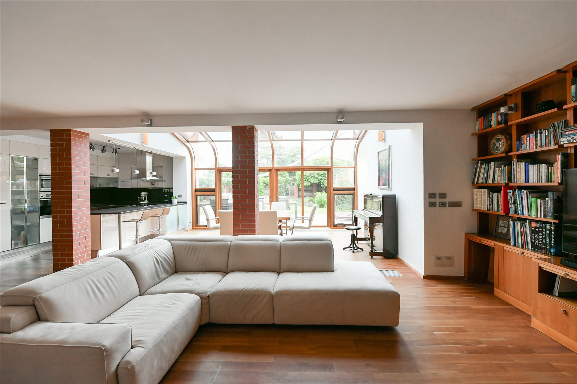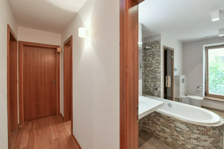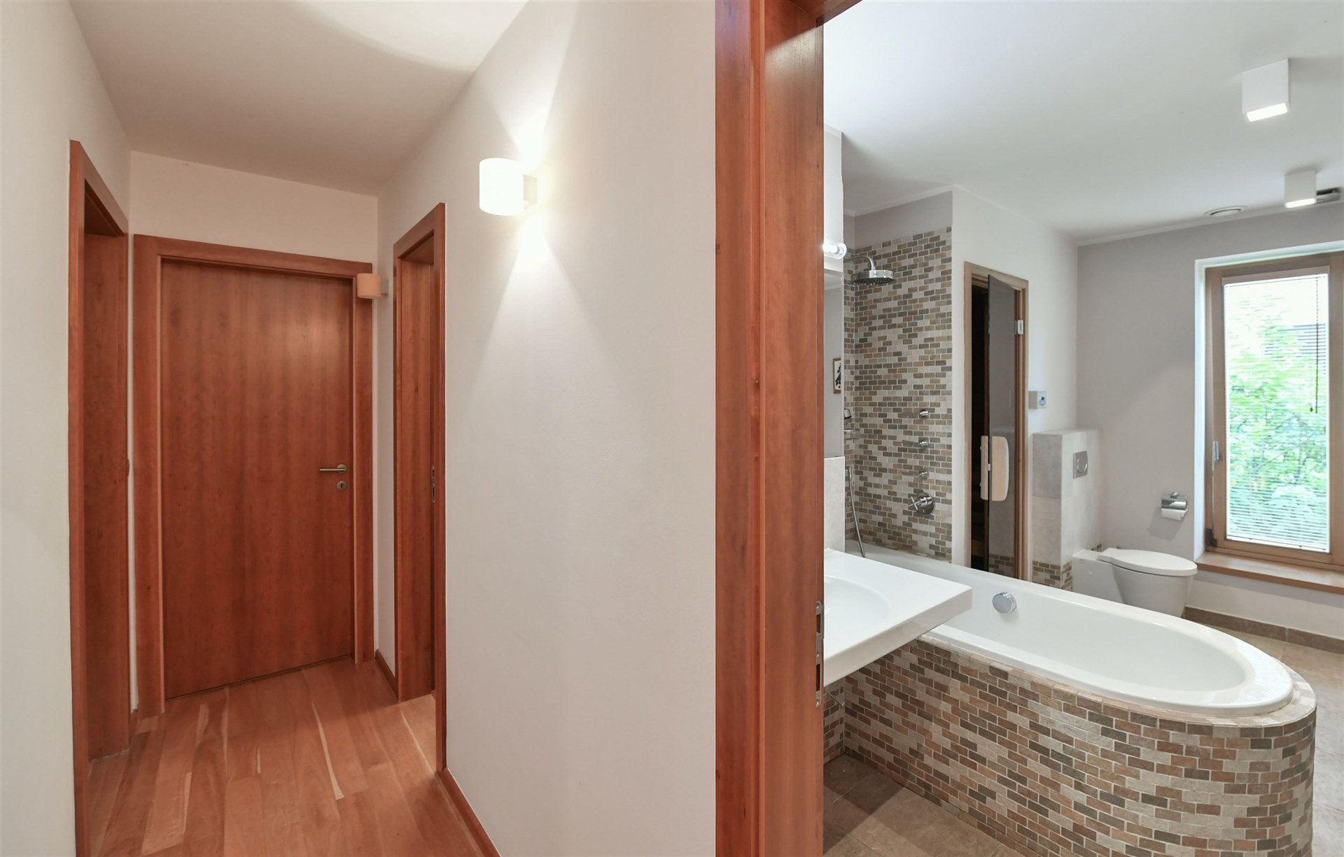 V samotném interiéru vás ihned zaujme nádherná prosvětlená hlavní obytná část domu, ve které najdete zimní zahradu s jídelnou, na kterou navazuje prostor s krbem a moderní otevřená kuchyně a praktická technická místnost. Z hlavní obytné části je přímý přístup do pokoje pro hosty u kterého se nachází samostatná koupelna a WC. Dále projdete chodbou, podél které je vestavěná praktická šatna, do 3 dalších ložnic, koupelny se saunou, WC, vanou a další koupelnou se sprchovým koutem a samostatným WC.