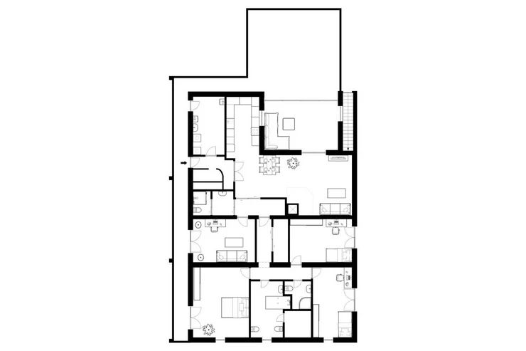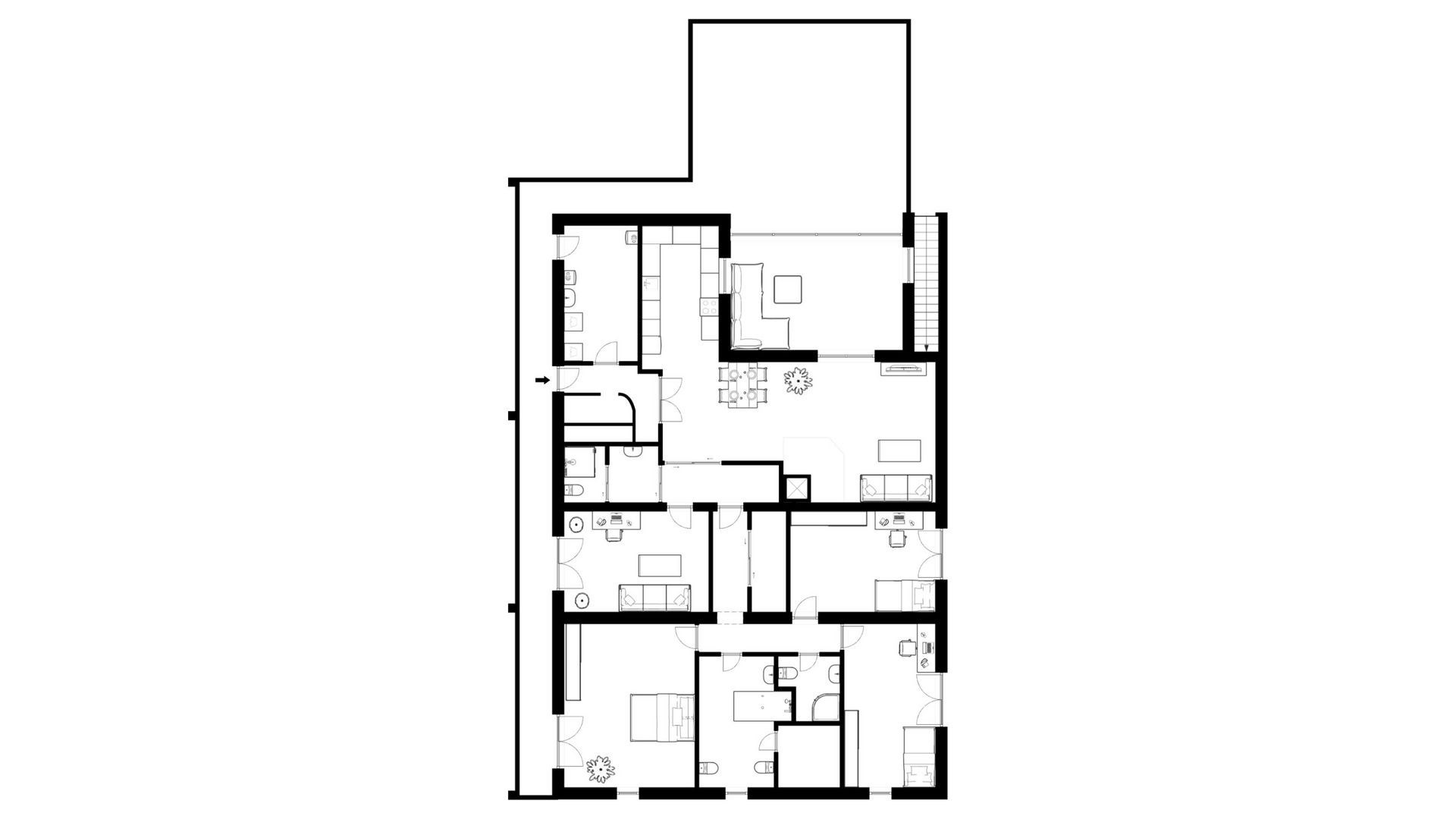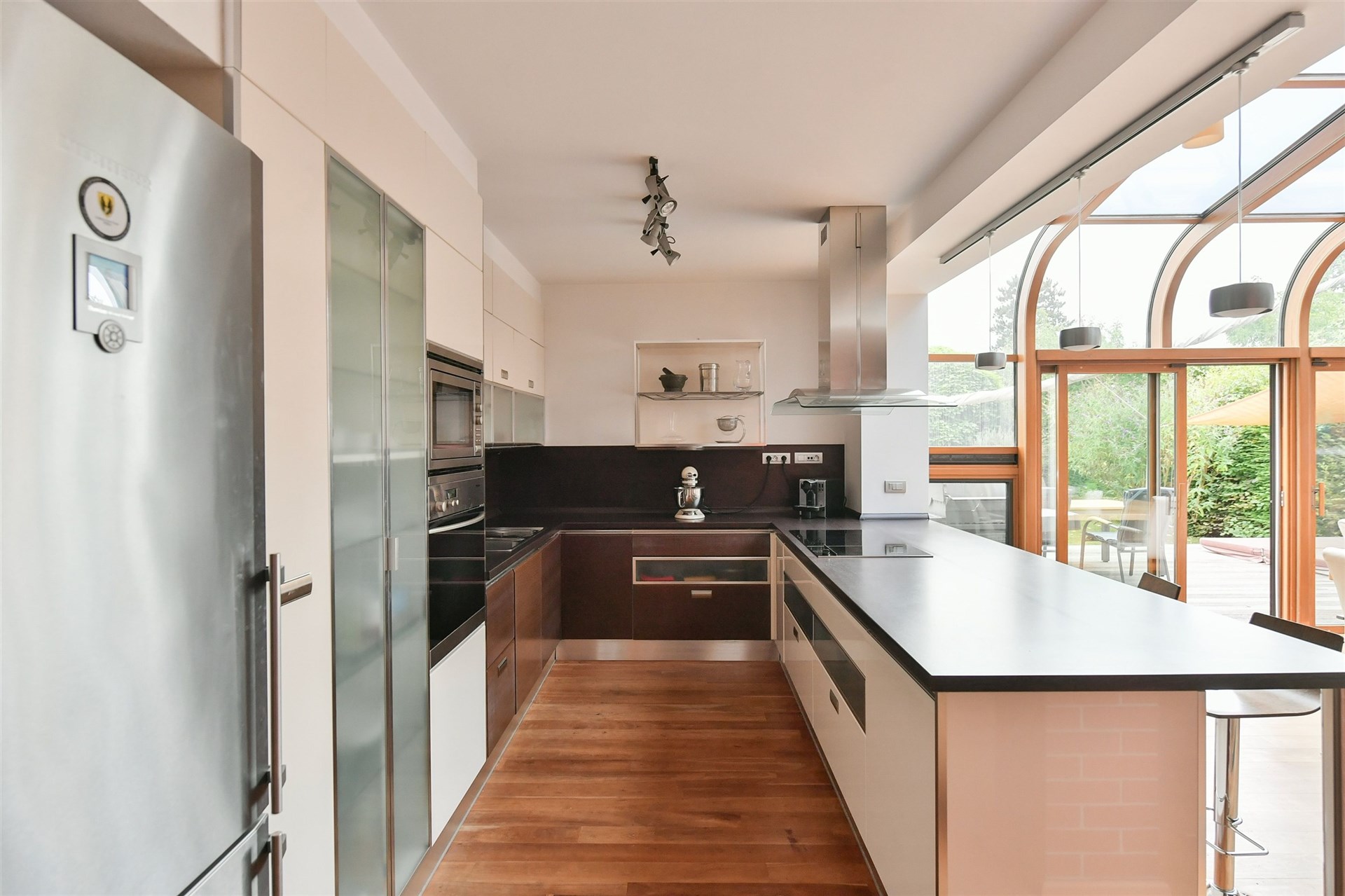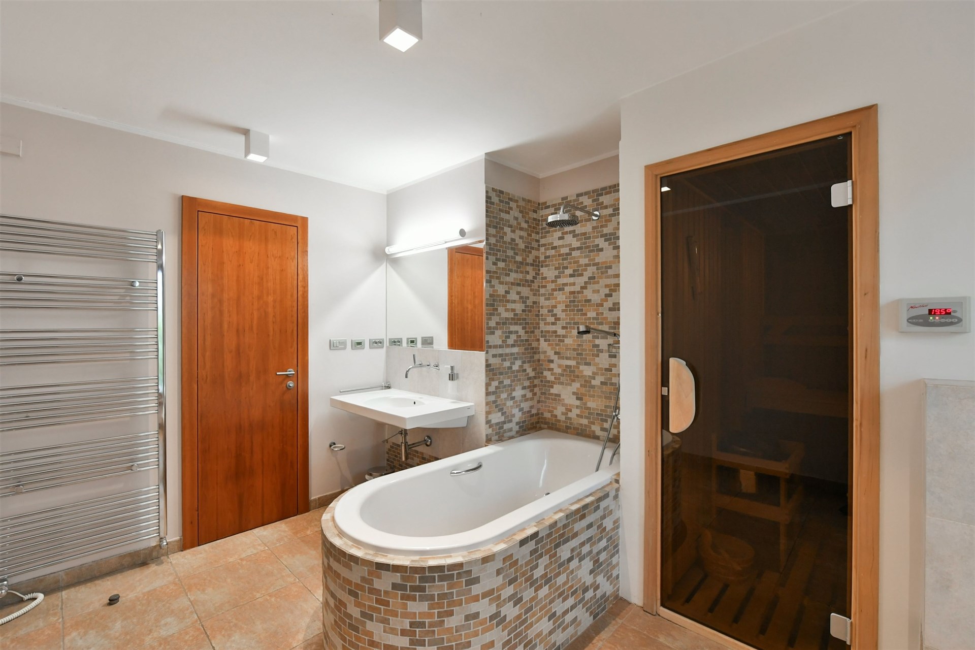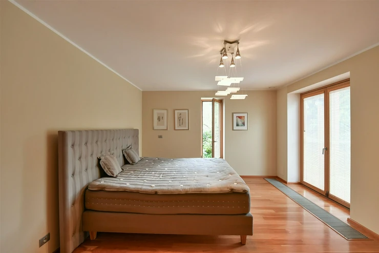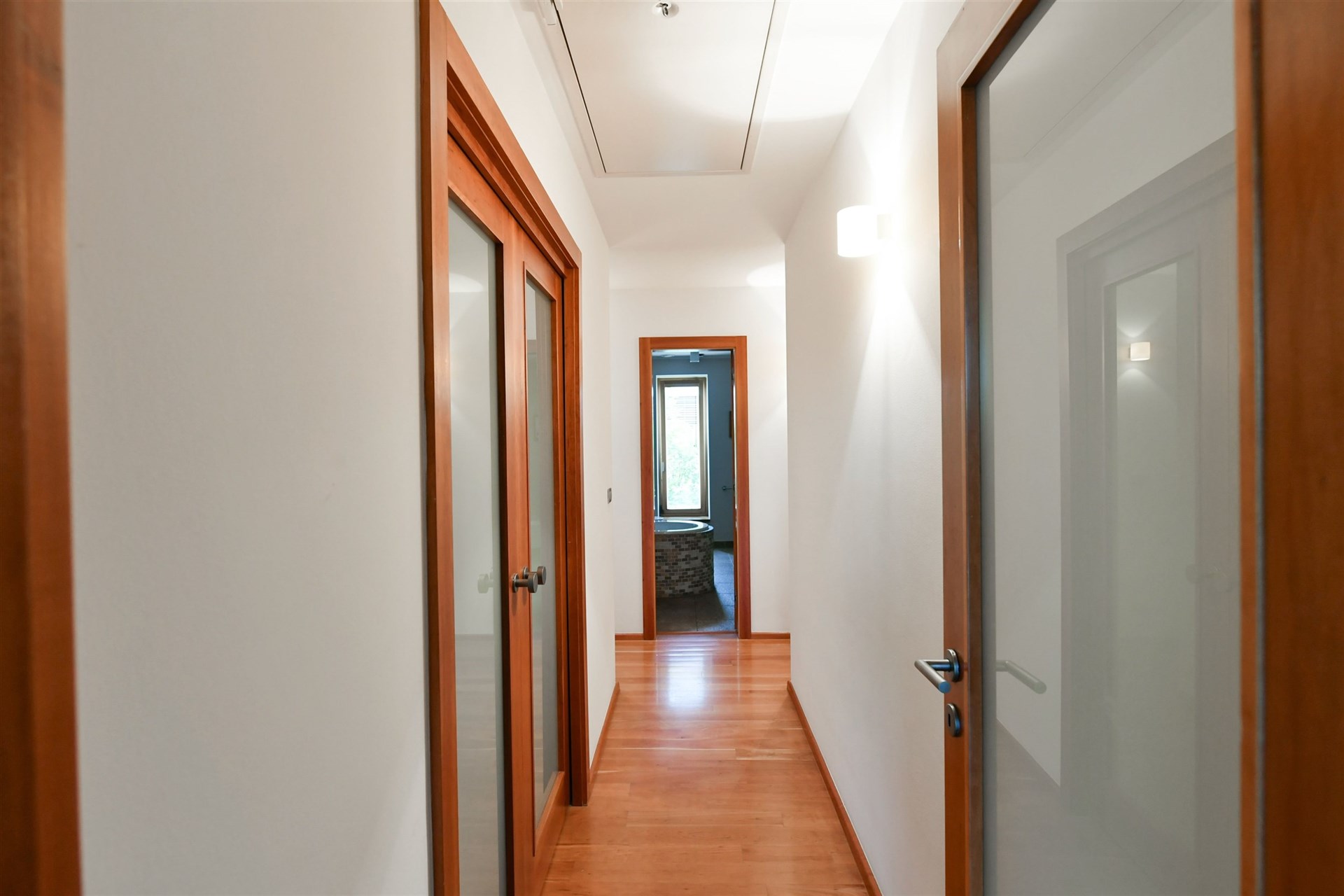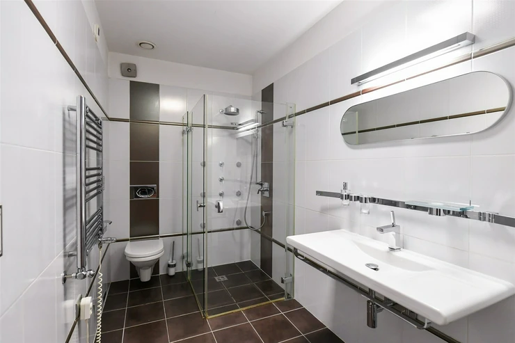 V samotném interiéru vás ihned zaujme nádherná prosvětlená hlavní obytná část domu, ve které najdete zimní zahradu s jídelnou, na kterou navazuje prostor s krbem a moderní otevřená kuchyně a praktická technická místnost. Z hlavní obytné části je přímý přístup do pokoje pro hosty u kterého se nachází samostatná koupelna a WC. Dále projdete chodbou, podél které je vestavěná praktická šatna, do 3 dalších ložnic, koupelny se saunou, WC, vanou a další koupelnou se sprchovým koutem a samostatným WC.