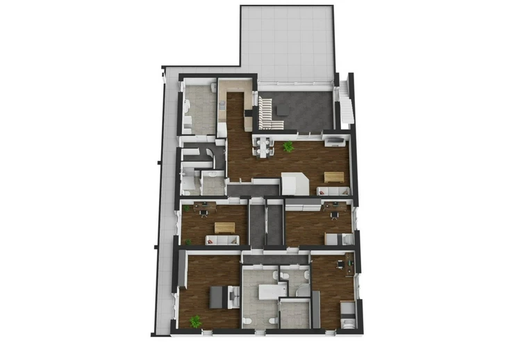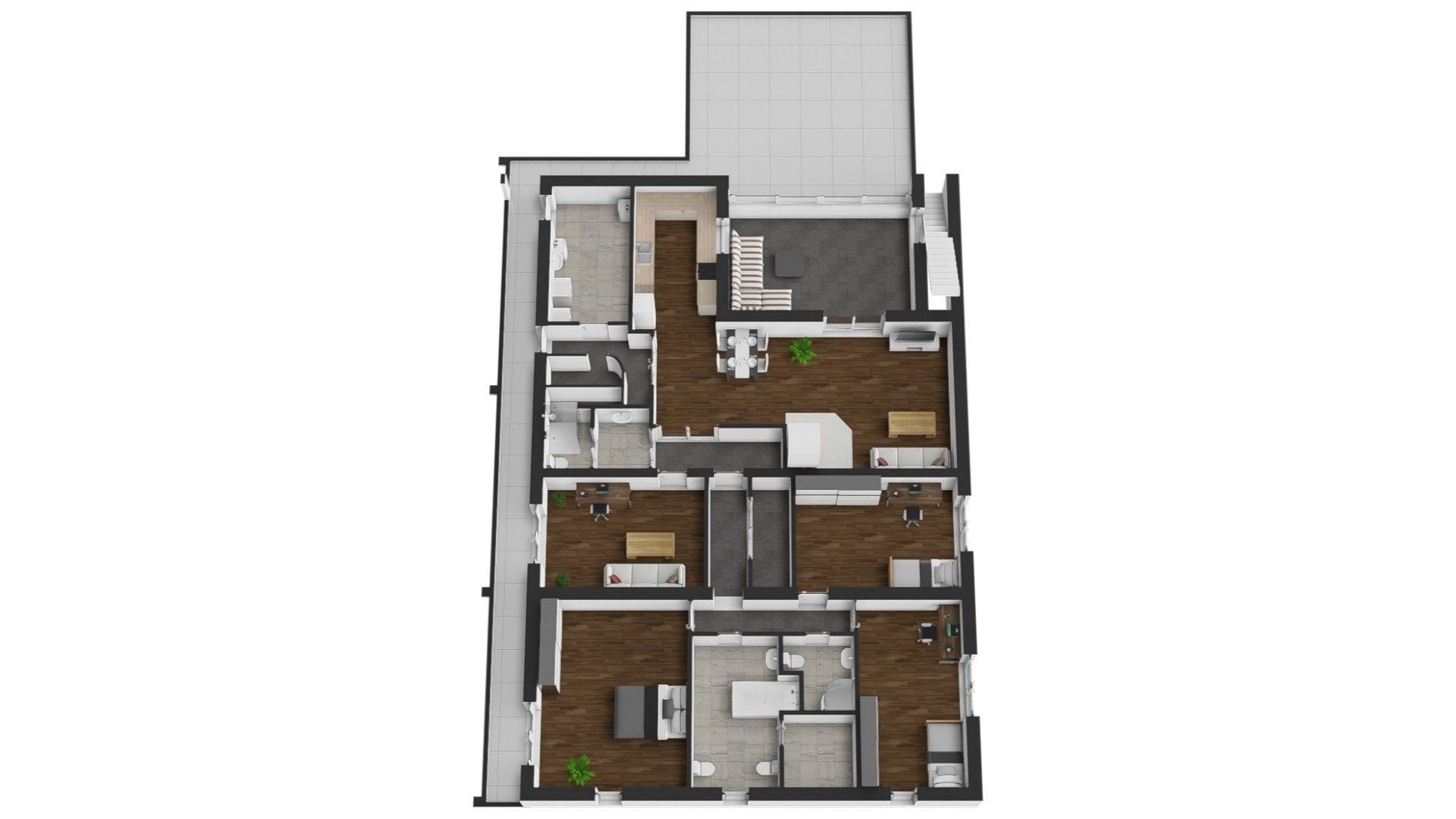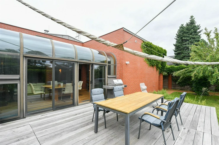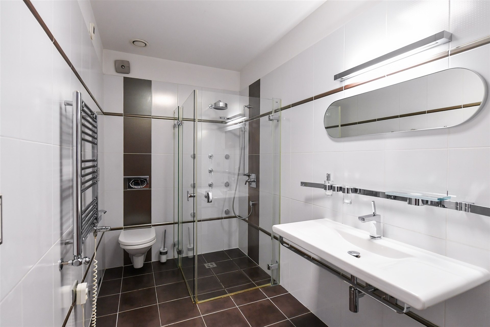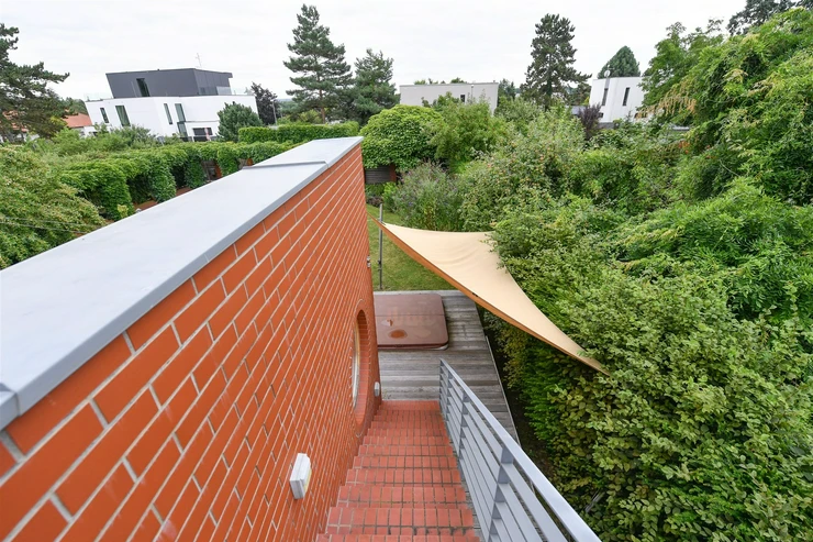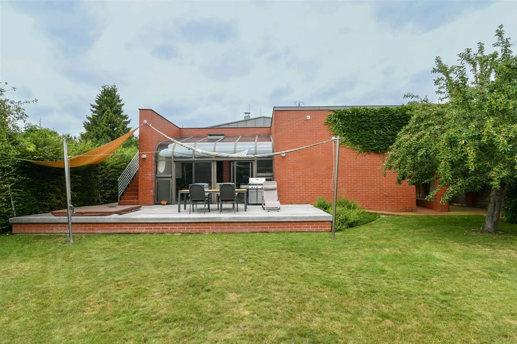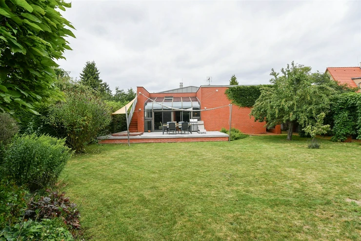 Dům s rekuperací je velice prakticky řešený a především nabízí bezbariérové bydlení. Ze všech ložnic v domě je možný východ na terasu podél obvodu domu, což je velkým bonusem. Před hlavní obytnou částí domu je prostorná terasa se zabudovanou vířivkou a výhledem do klidné zahrady. Odtud je také vstup na střešní terasu domu. Pod střechou je velká půda s prostorným skladovacím prostorem.