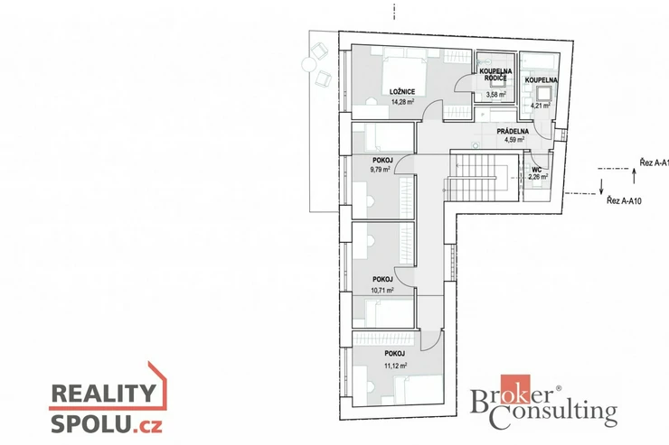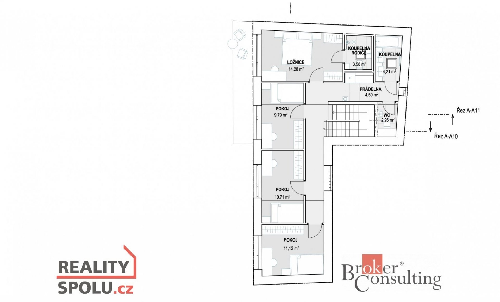 V přízemí najdete prostorný obývací pokoj s kuchyní a vstupem na zahradu, pokoj pro hosty či pracovnu, koupelnu a technické zázemí. V patře čtyři ložnice, dvě koupelny a prádelna – dostatek prostoru pro pohodlný rodinný život.