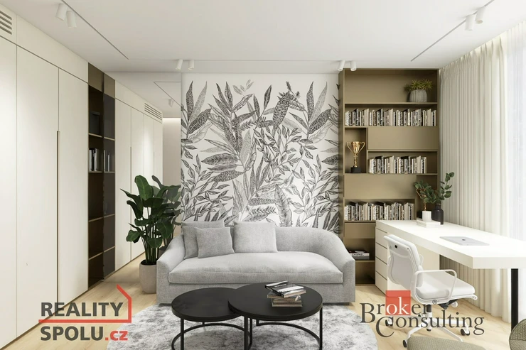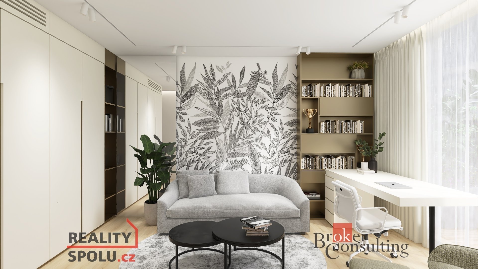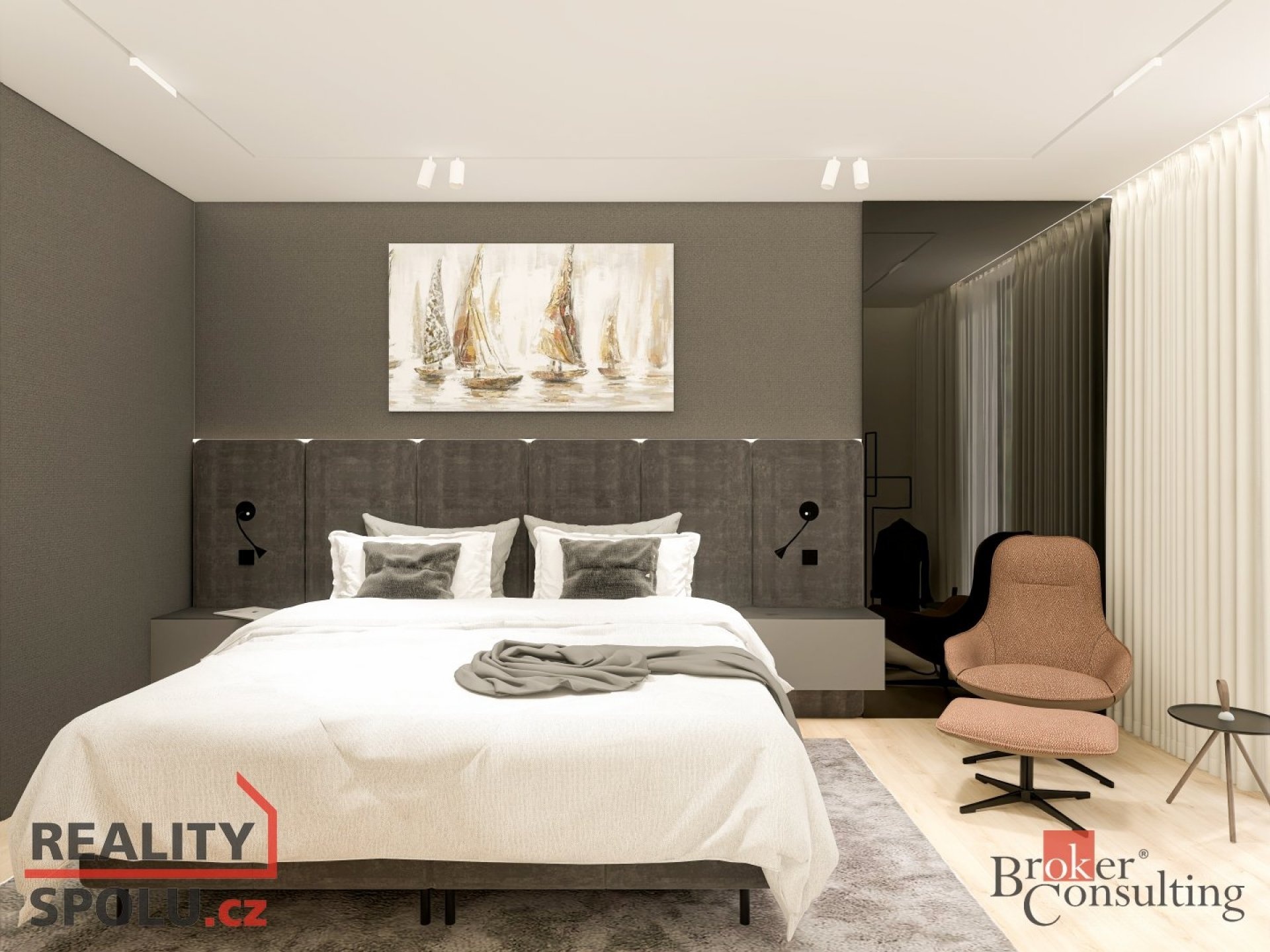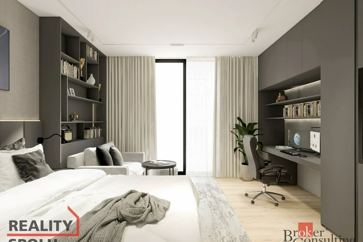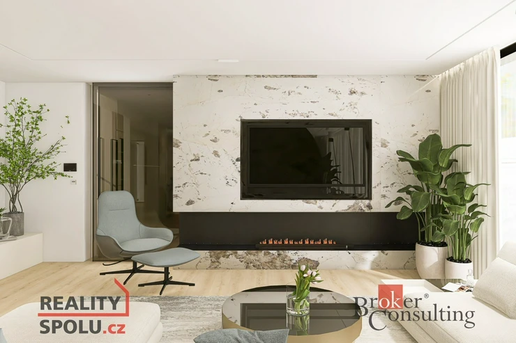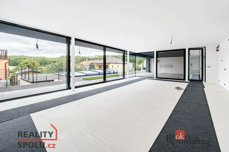 Dispozice domu je promyšlená a nabízí dostatek prostoru pro pohodlné rodinné bydlení. V suterénu se nachází technické zázemí, pracovna, wellness zóna a vstup do venkovního SPA. Přízemí tvoří prostorný obývací pokoj s přípravou pro kuchyňskou linku a krb, s přímým vstupem na terasu a zahradu s bazénem, dále dvě ložnice, koupelna, šatna a průchod do garáže pro dva automobily. Ve druhém patře se nachází ložnice se samostatnou koupelnou a přístupem na prostornou terasu s pergolou, dva pokoje s balkóny a další koupelna.