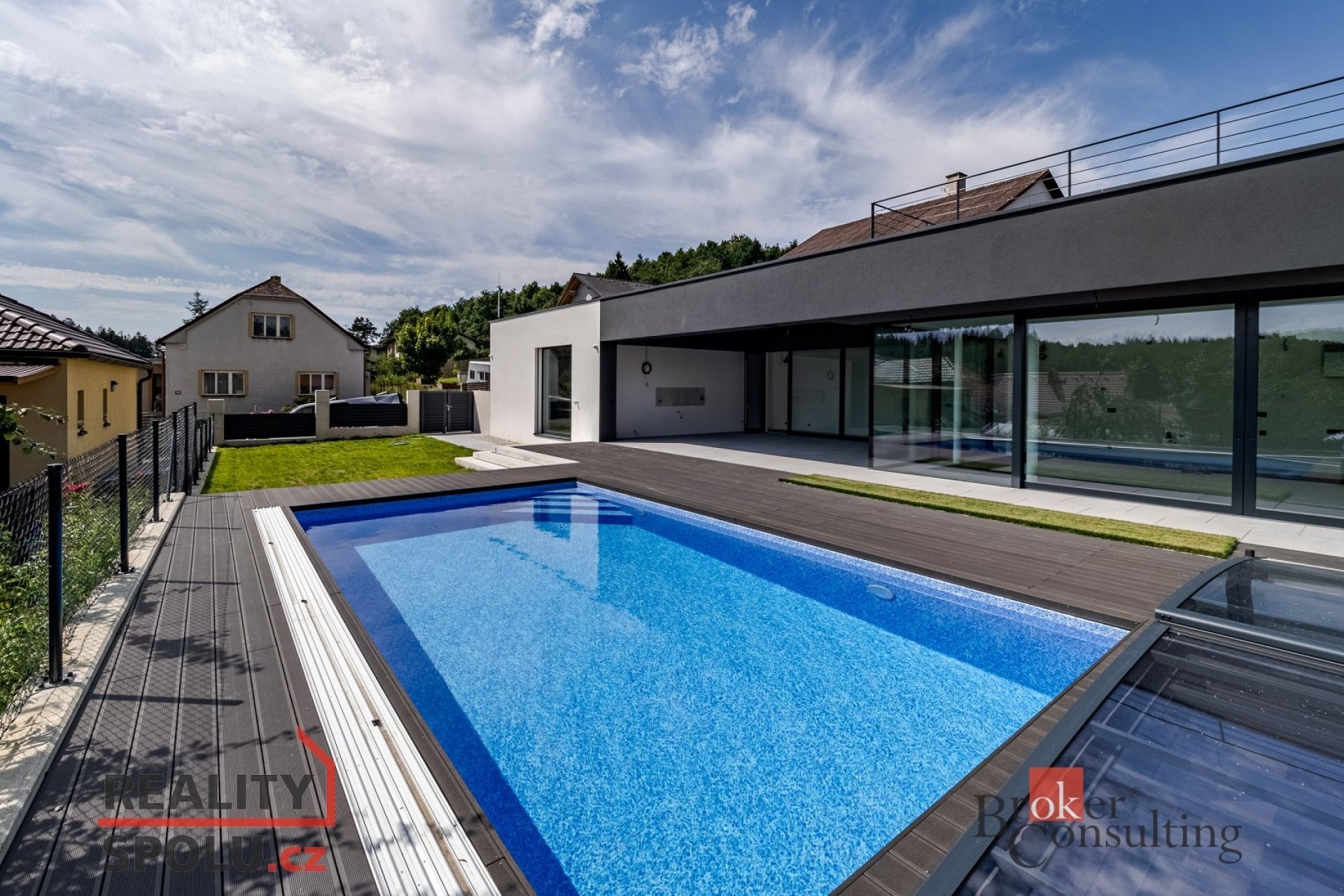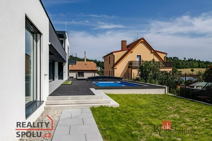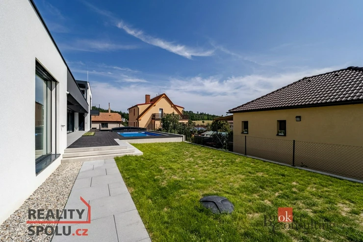 K odpočinku slouží zahrada s vyhřívaným bazénem o rozměrech 8×4 metry a třemi bioklimatickými pergolami s elektrickým ovládáním. Dešťová voda je svedena do akumulační nádrže, která umožňuje její využití na zalévání.