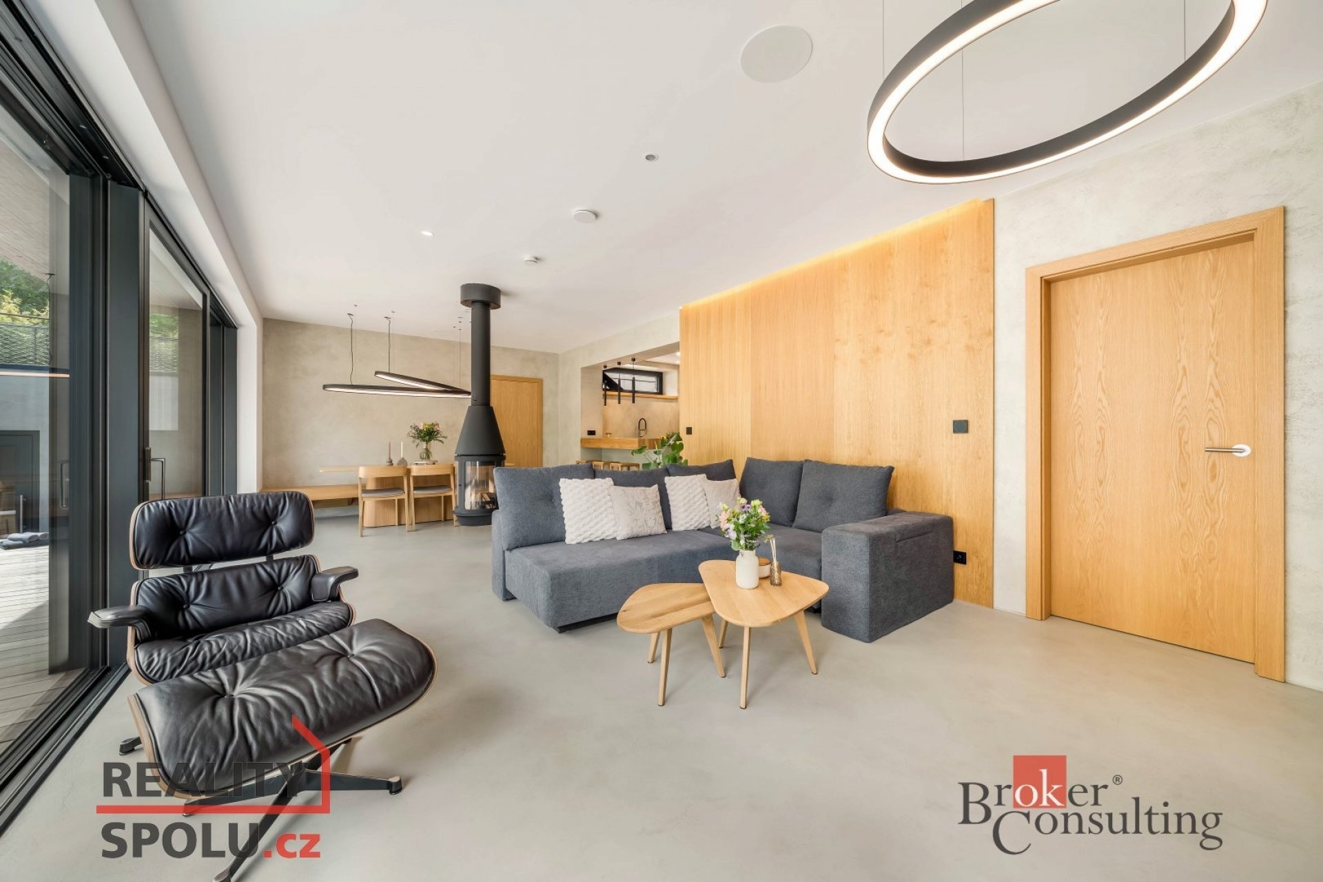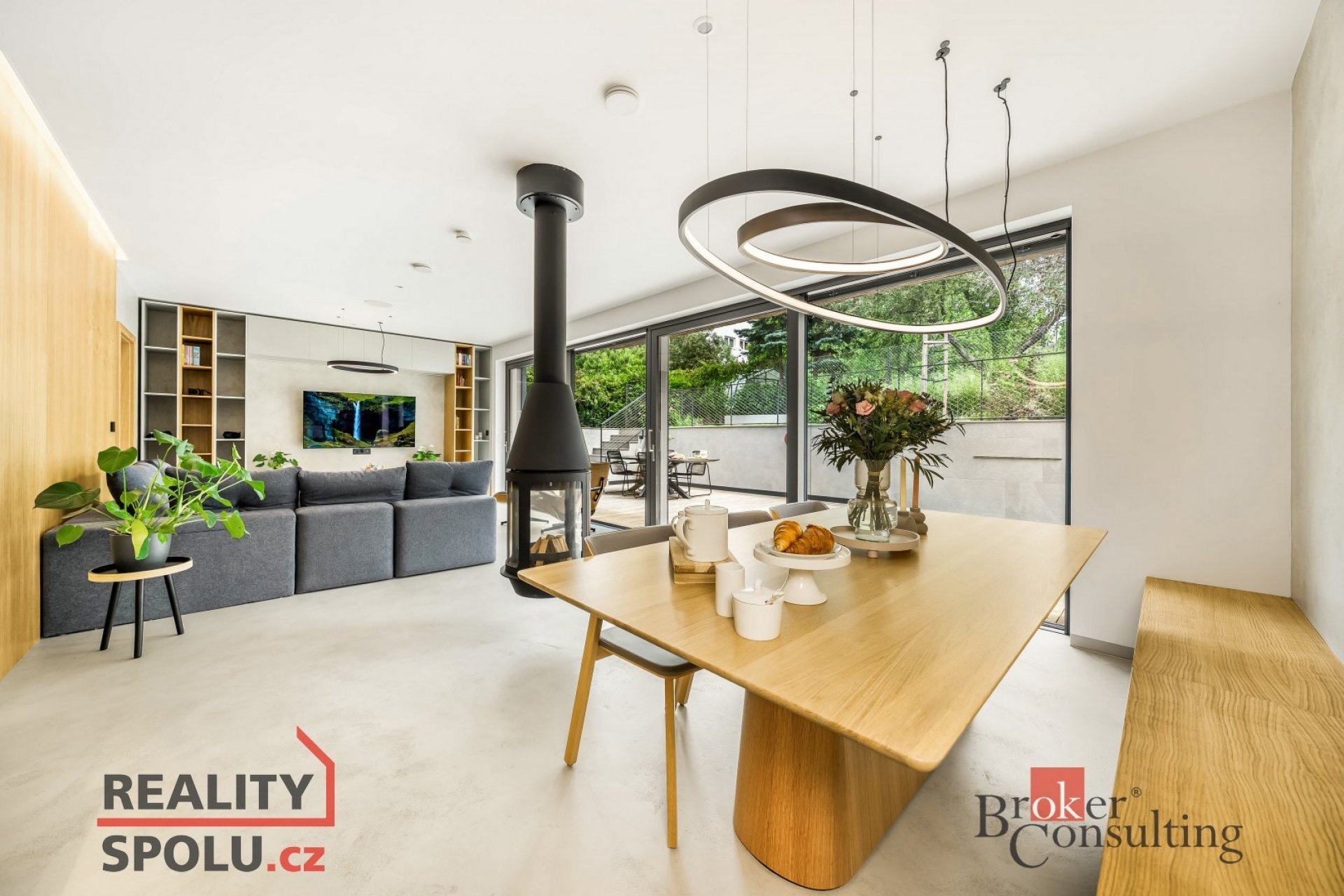 Moderní dispozice, otevřený prostor s důrazem na světlo a funkčnost.