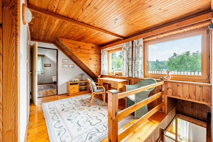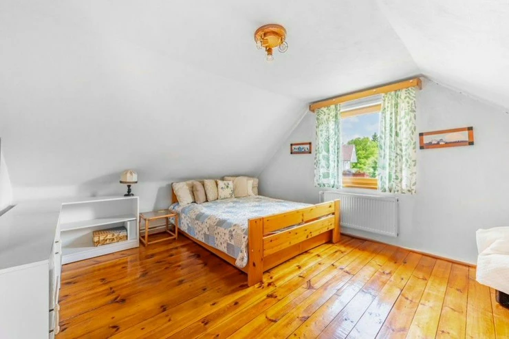 The layout of the house includes two floors (195m2). The ground floor includes an entrance hall, a largekitchen with dining room, two rooms, bathroom with toilet, entrance to the cellar. On the first floor there are 3 bedrooms and a bathroom with a dressing room. The house has a partial basement, the basement is used for technical facilities. There is also a separate building on the land intended for parking and storage. The storage is suitable for storing garden furniture, as a workshop or for other uses.