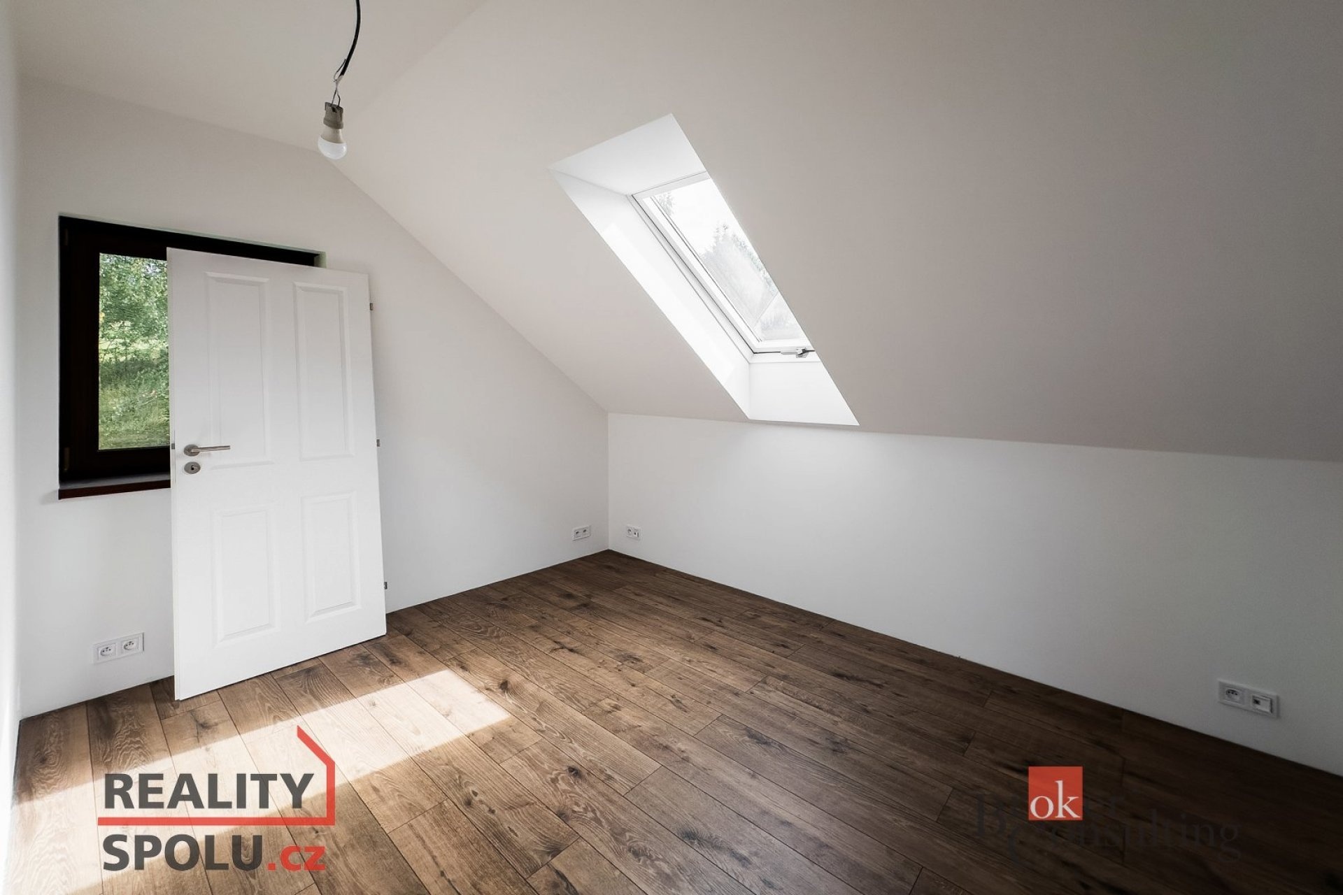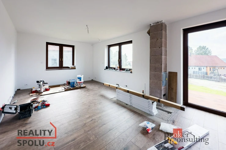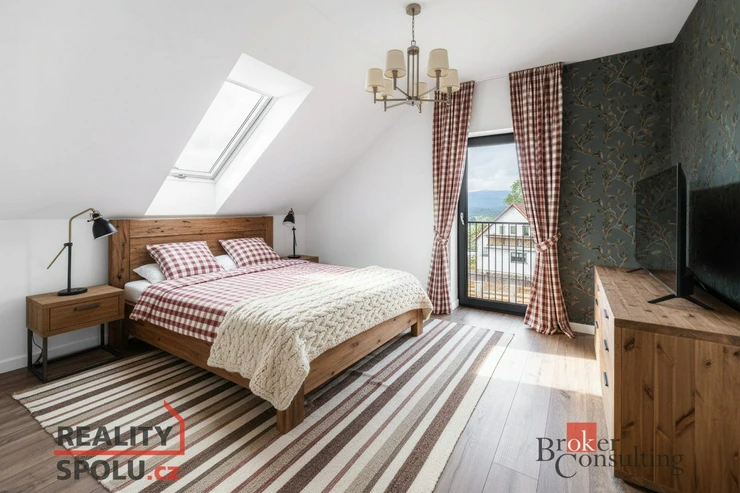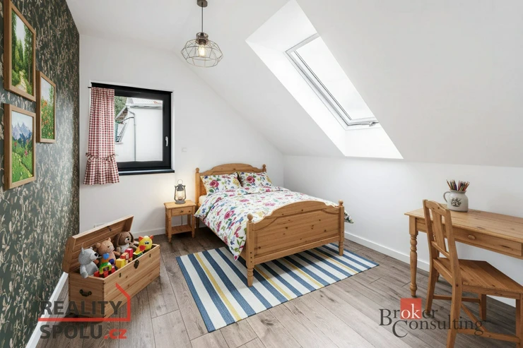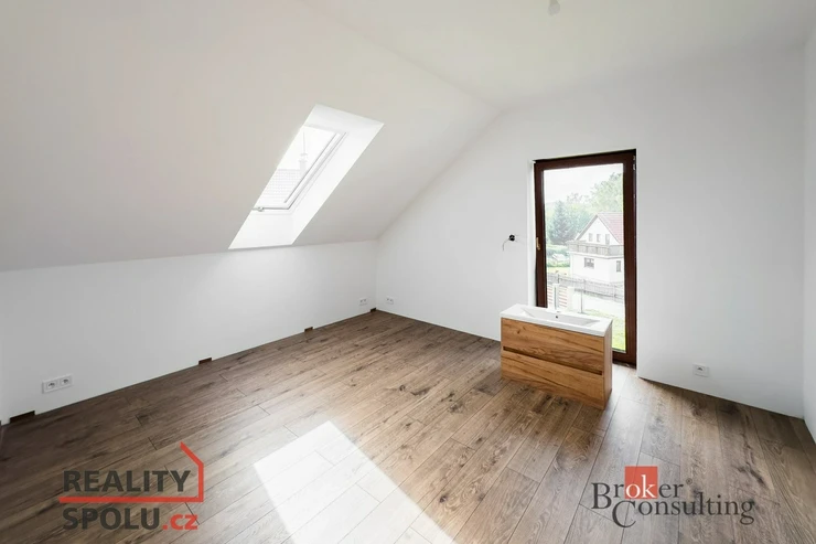 - Vybavení: Kvalitní PVC okna s trojsklem a venkovními roletami na dálkové ovládání, střešní okna, vinylové podlahy a dlažba v koupelnách.