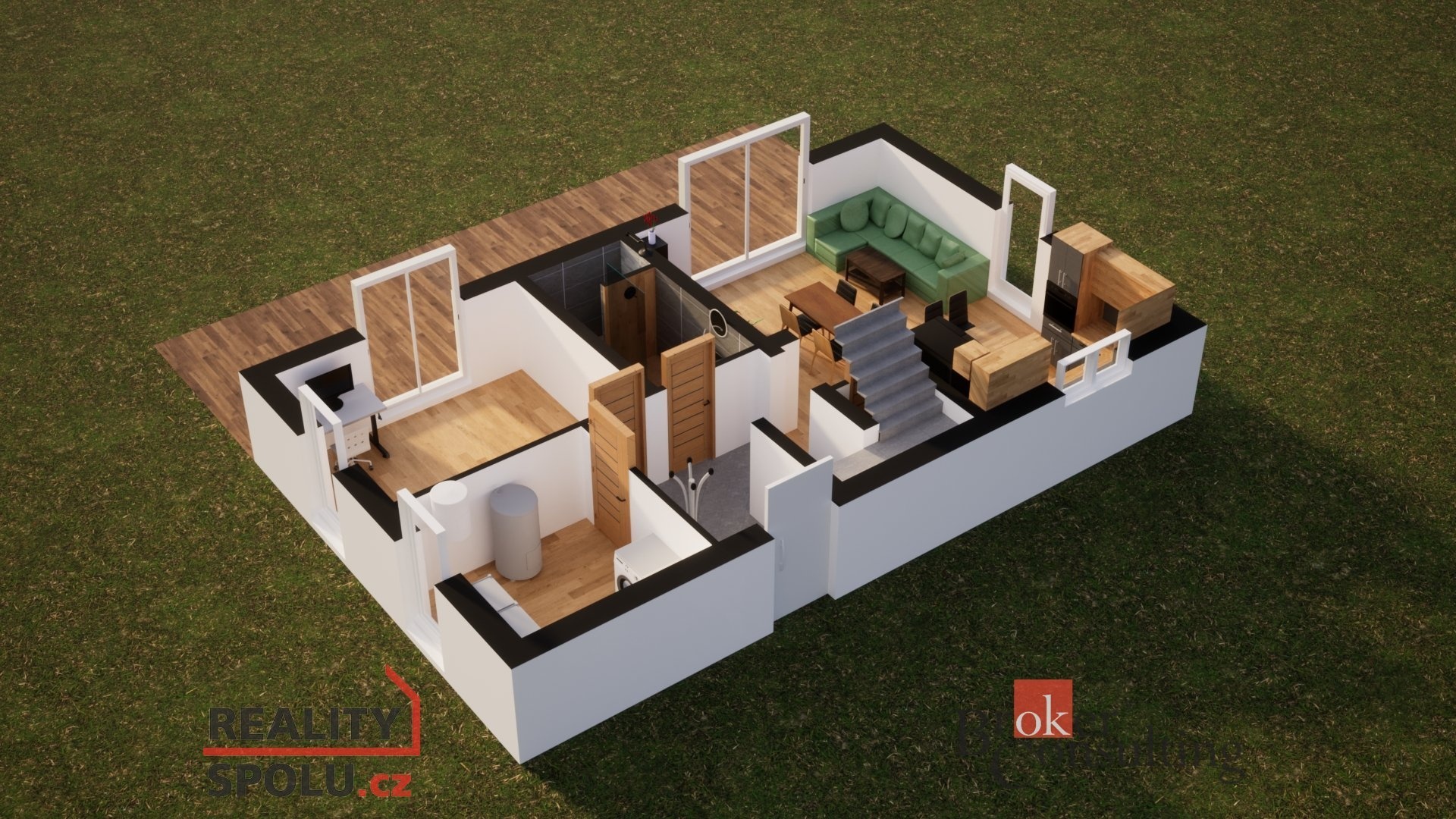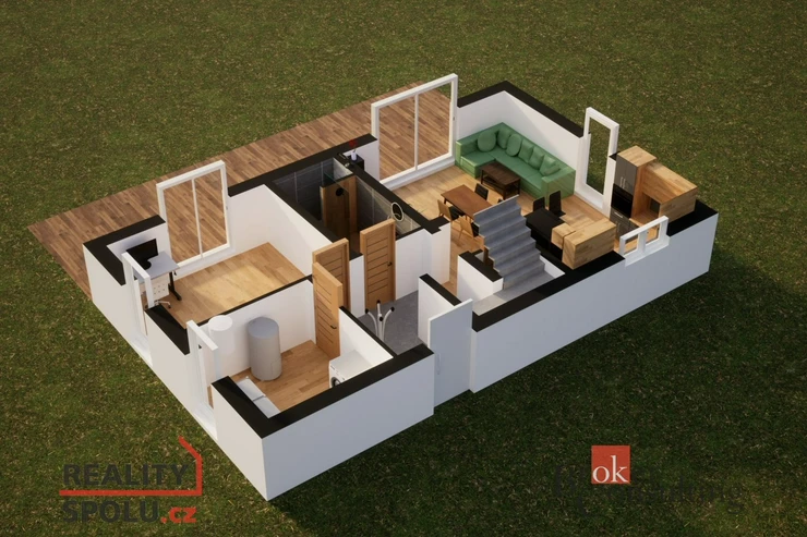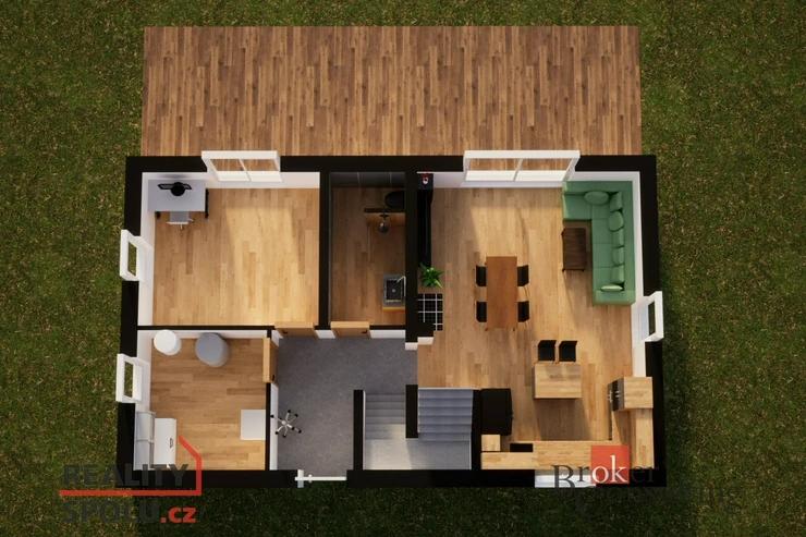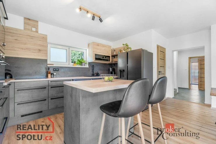 V přízemí se ukrývá velkorysý obývací pokoj spojený s kuchyňským koutem a jídelní částí.