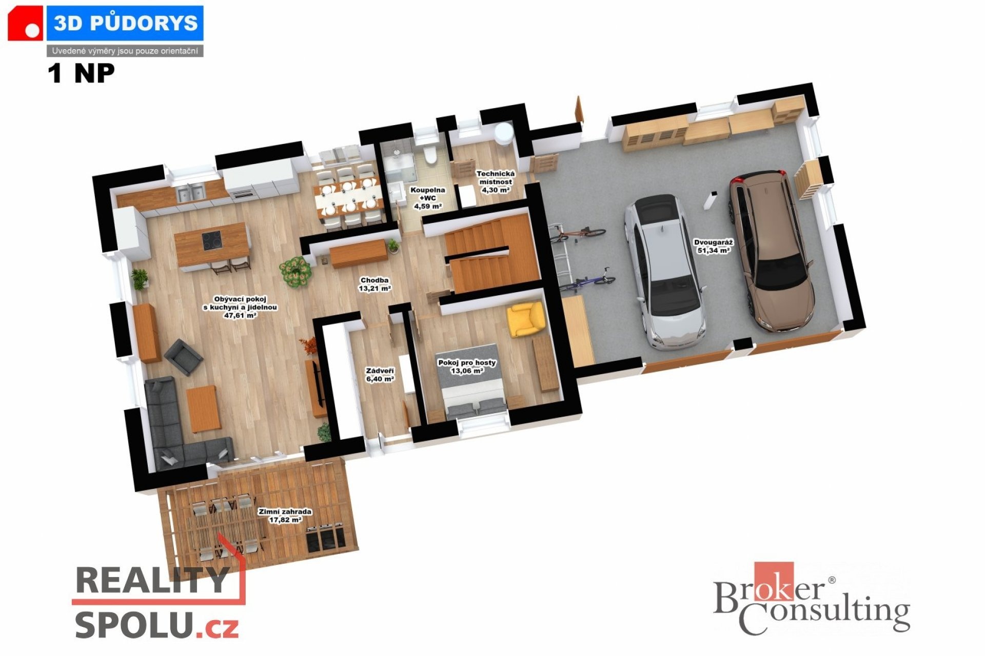 Do patra se dostanete dřevěným schodištěm. V patře domu se nacházejí ložnice, obývací pokoj, kuchyňská linka s vestavnou troubou a varnou deskou. Dál pokoj pro hosty či herní místnost a koupelna s vanou, sprchovým koutem a WC.