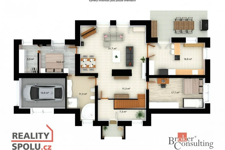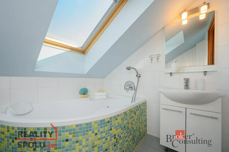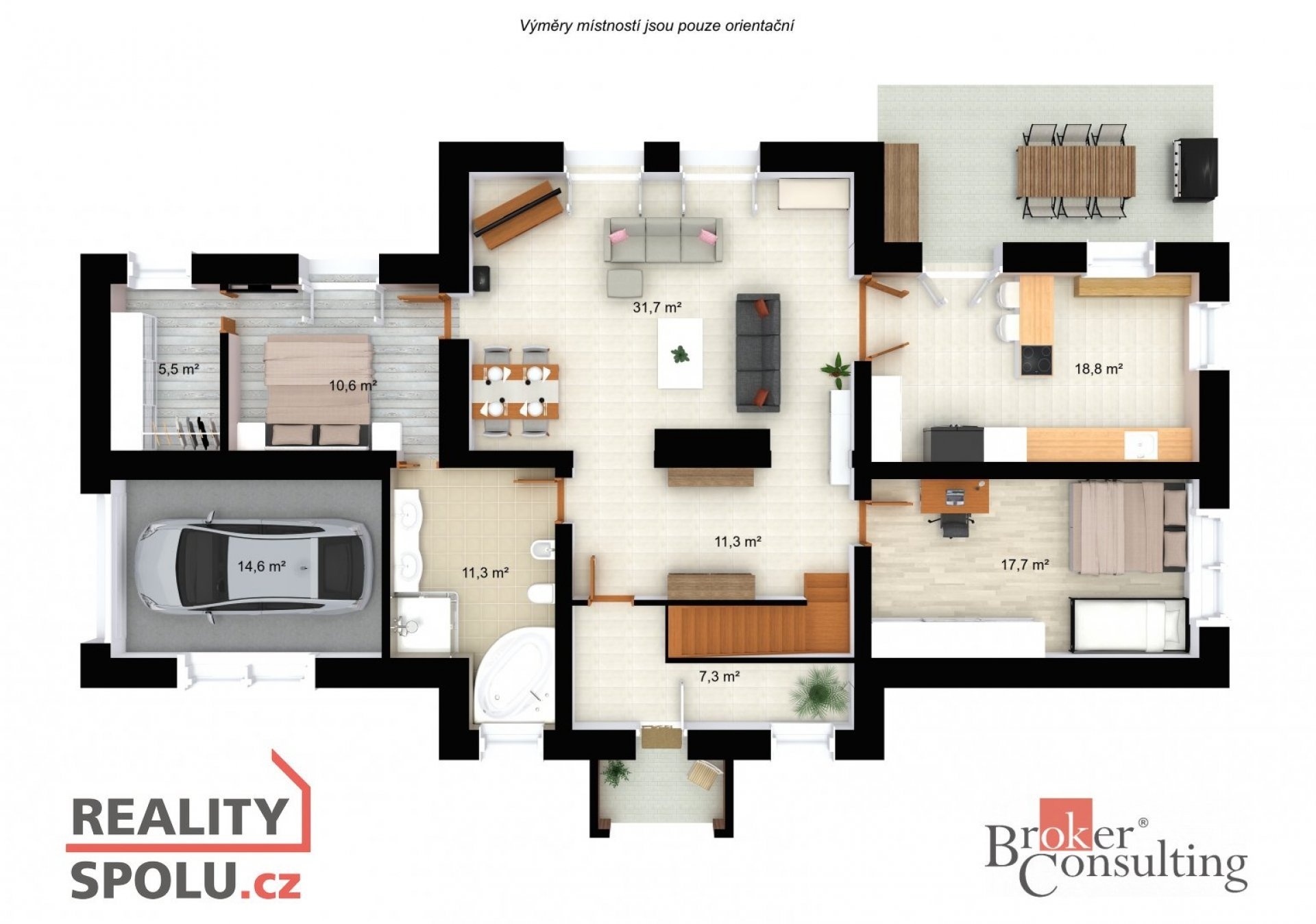 Přízemí se skládá z velkorysého obytného prostoru s krbovými kamny, kuchyně s navazující zahradní krytou terasou, prostorné ložnice s šatnou, dětského pokoje, koupelny včetně toalety a bidetu, zádveří, dvou technických místností a schodišťového prostoru. V podkroví jsou dvě samostatné ložnice otevřené do krovu a druhá koupelna s toaletou.