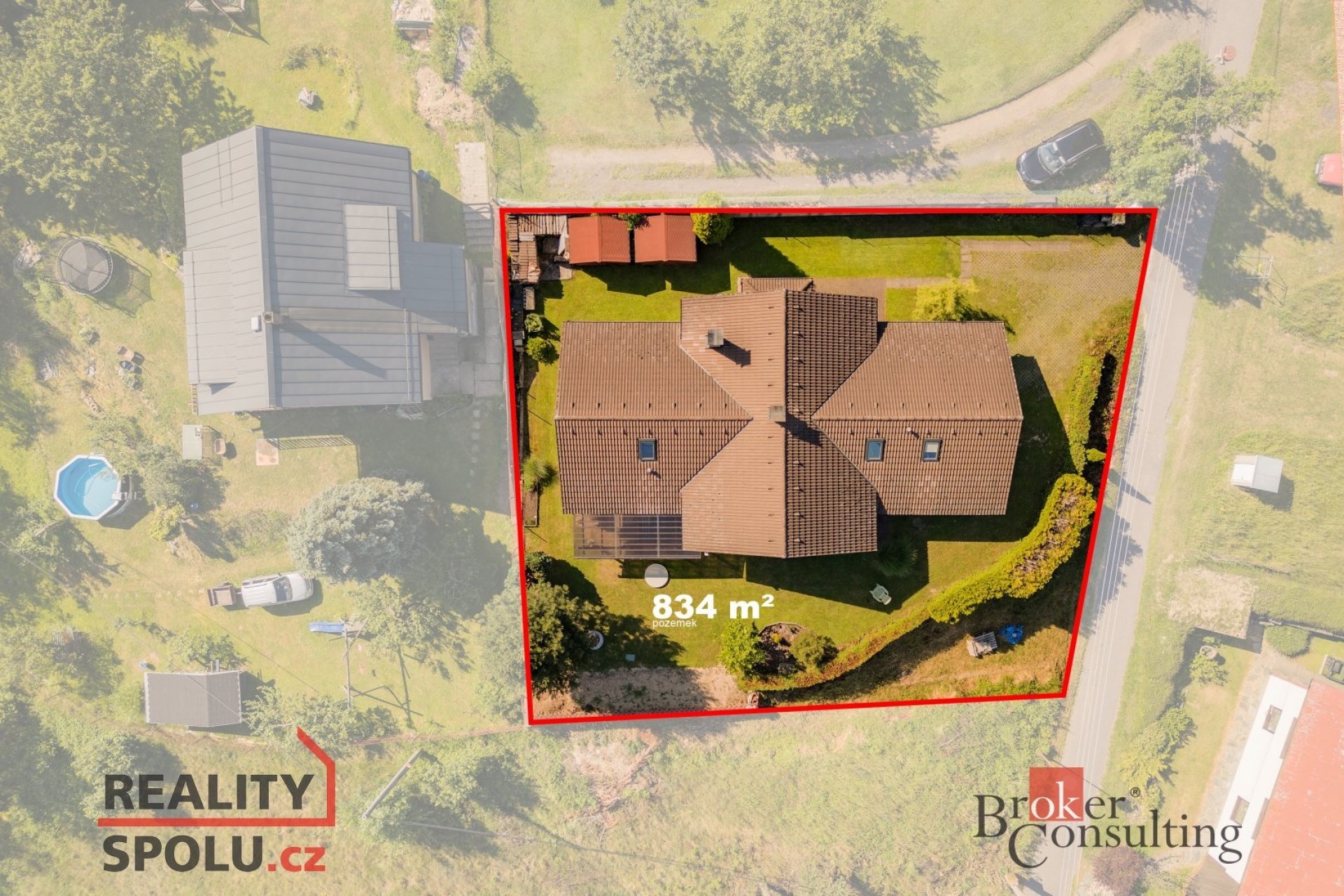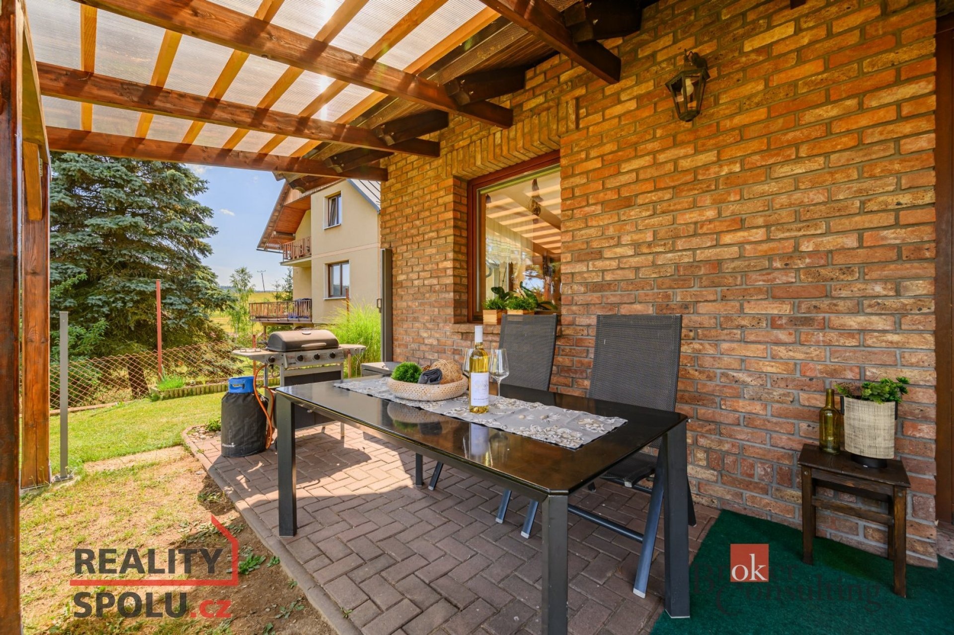 Energeticky úsporný zděný dům byl dokončen v roce 2006. Vytápění je řešeno kombinací tepelného čerpadla LG vzduch – voda a krbovou vložkou Bodart Gonay opatřenou horkovzdušnou ventilací s proměnlivými otáčkami a regulací teploty. V celém přízemí je rozvedeno teplovodní podlahové vytápění. V podkroví jsou nainstalovány radiátory. K dispozici máte vlastní 45 m hlubokou vrtanou studnu s artéskou vodou. Exteriér zdobí ručně pálené lícové cihly, které domu propůjčují nezaměnitelný originální vzhled. Samotná stavba je vyzděna z pórobetonových tvárnic Ytong opatřené parotěsnou zábranou. Na střeše byly použity tašky Bramac. K dispozici je garáž s dálkově ovládanými sekčními vraty. Na pozemku jsou dvě zpevněná parkovací stání. Zahrada okolo domu s několika vzrostlými stromy je z části oplocená. Na celém pozemku je instalován automatický zavlažovací systém Hunter.