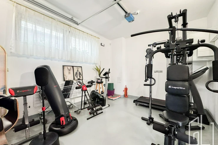 Dále se zde nachází hostinský pokoj s vlastní koupelnou, toaleta a plně vybavený soukromý fitness.