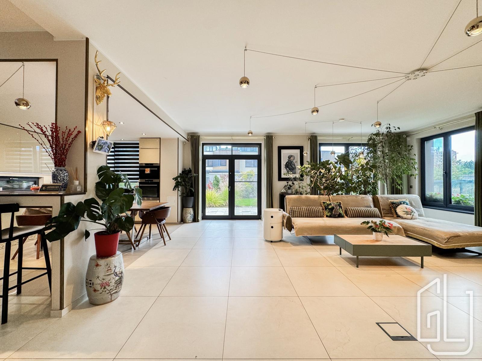 Reprezentativní vstupní hala plynule přechází do prostorného obývacího pokoje s designovou kuchyní, vybavenou nejmodernějšími vestavěnými spotřebiči.