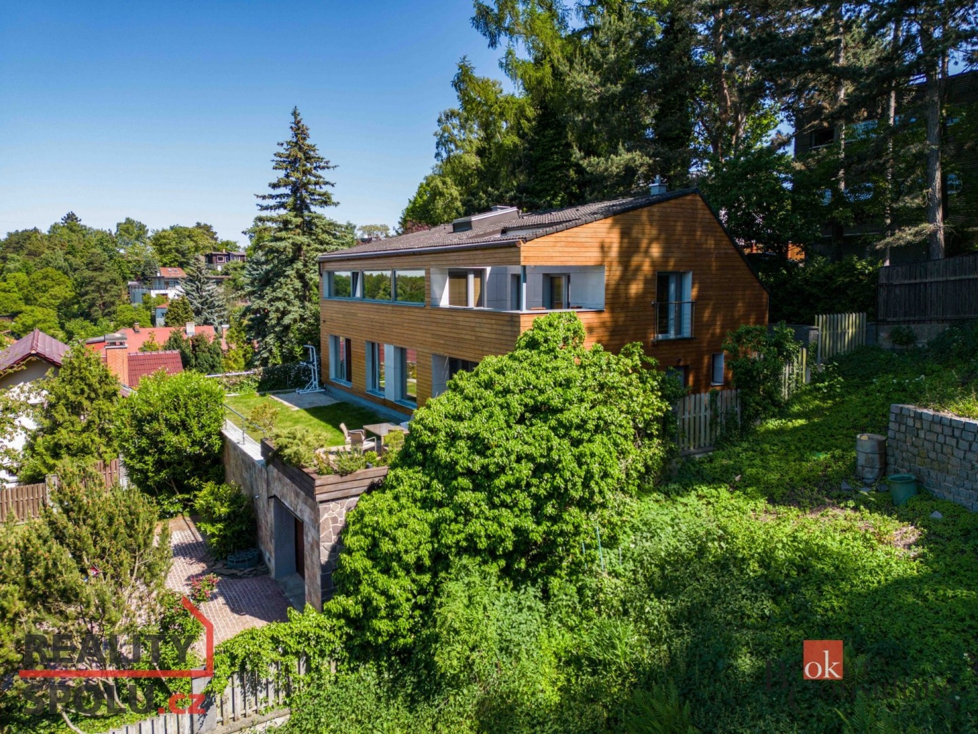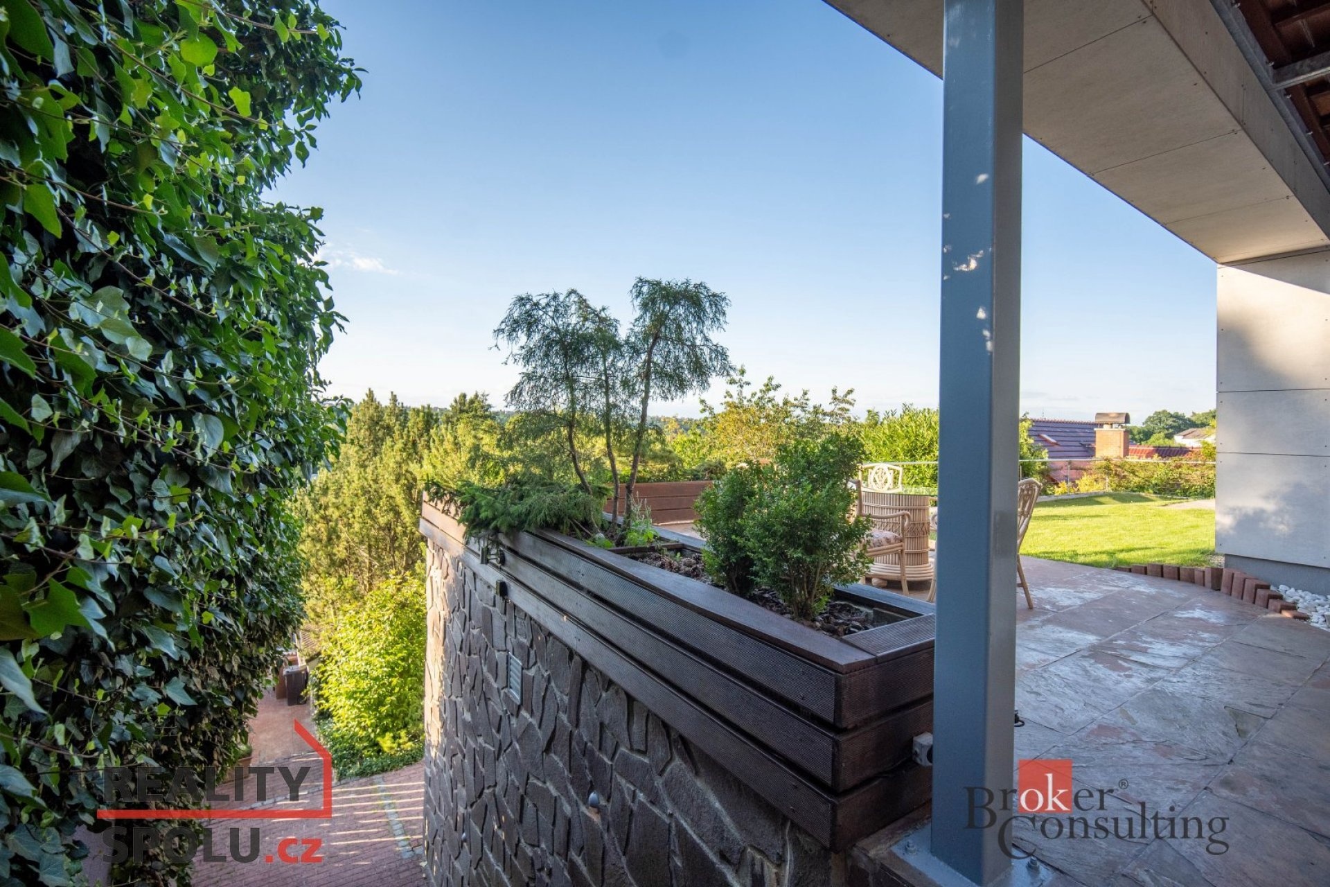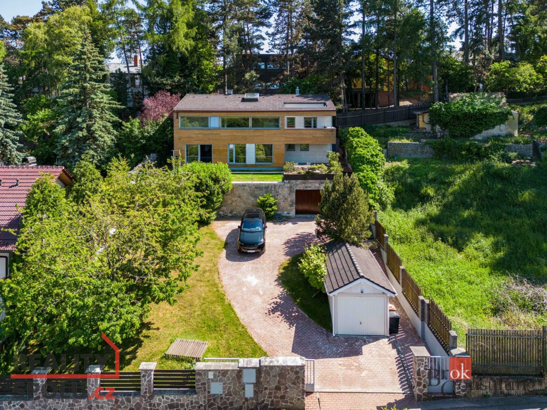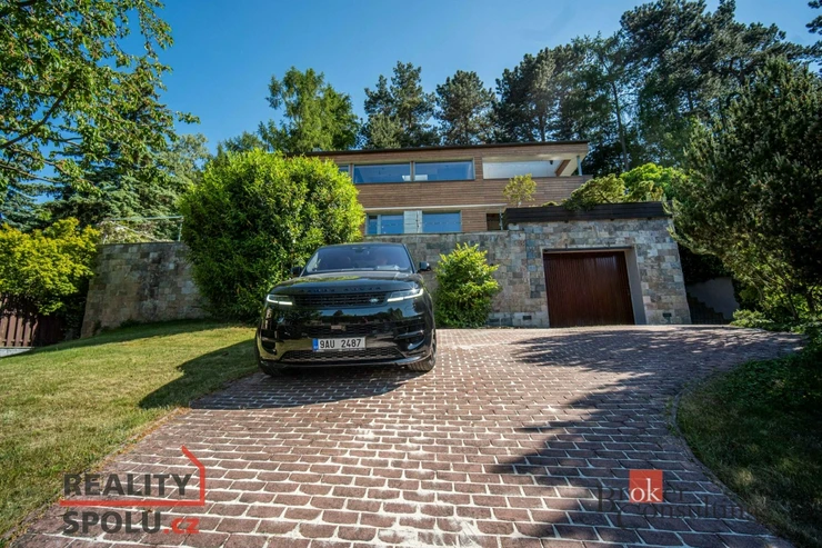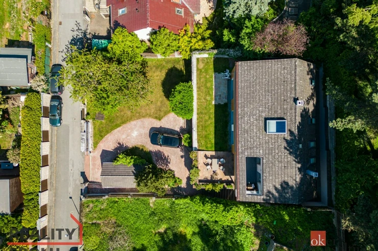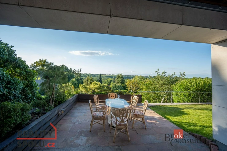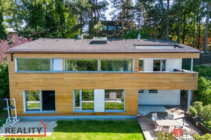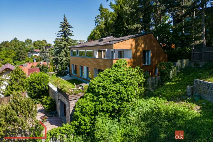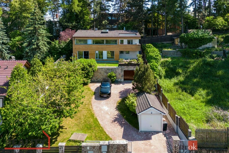 The house has a floor area of almost 200m2 and 2 garages. It stands on a sloping, landscaped plot (723 m²) with mature trees and at the end of street Za Mototechnou. Due to the fact that the house stands on the upper part of the plot (above the garage), you have amazing views both from the ground floor, where there is a large terrace and part of the garden, and of course also from the first floor of the house.