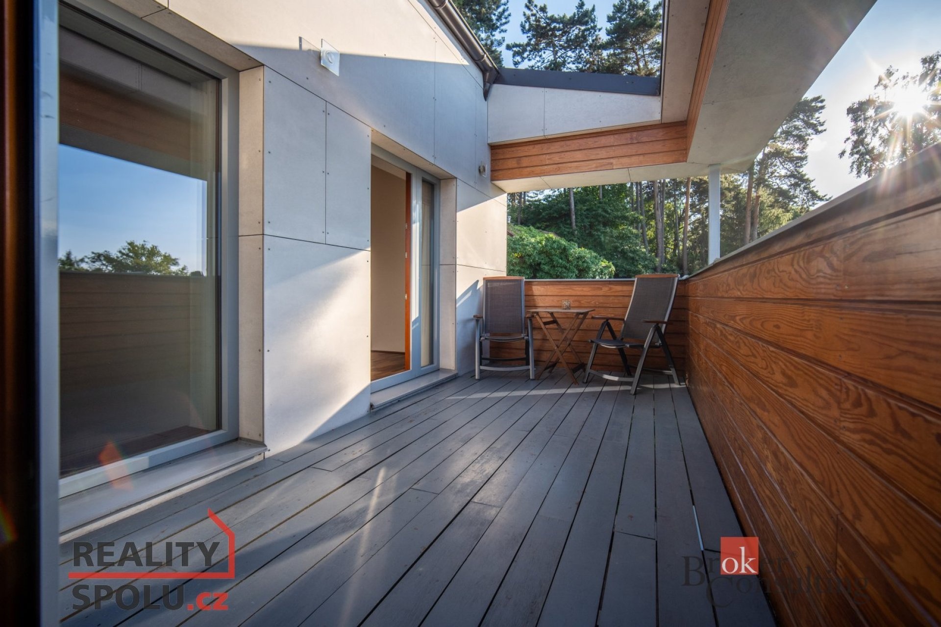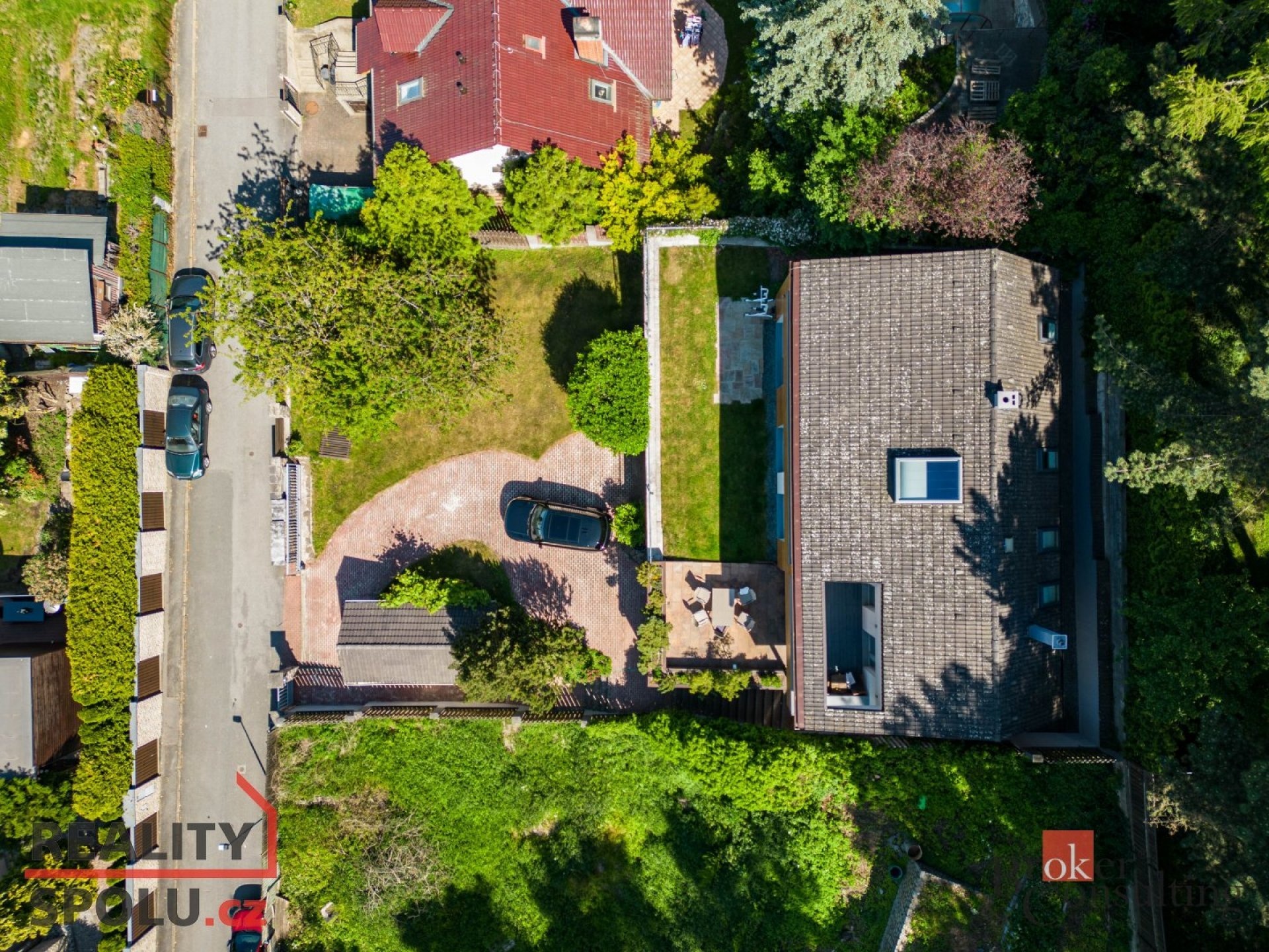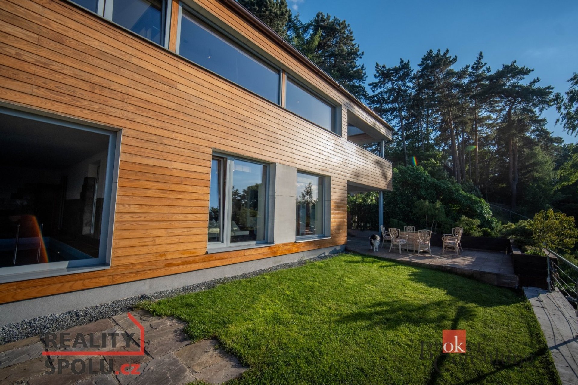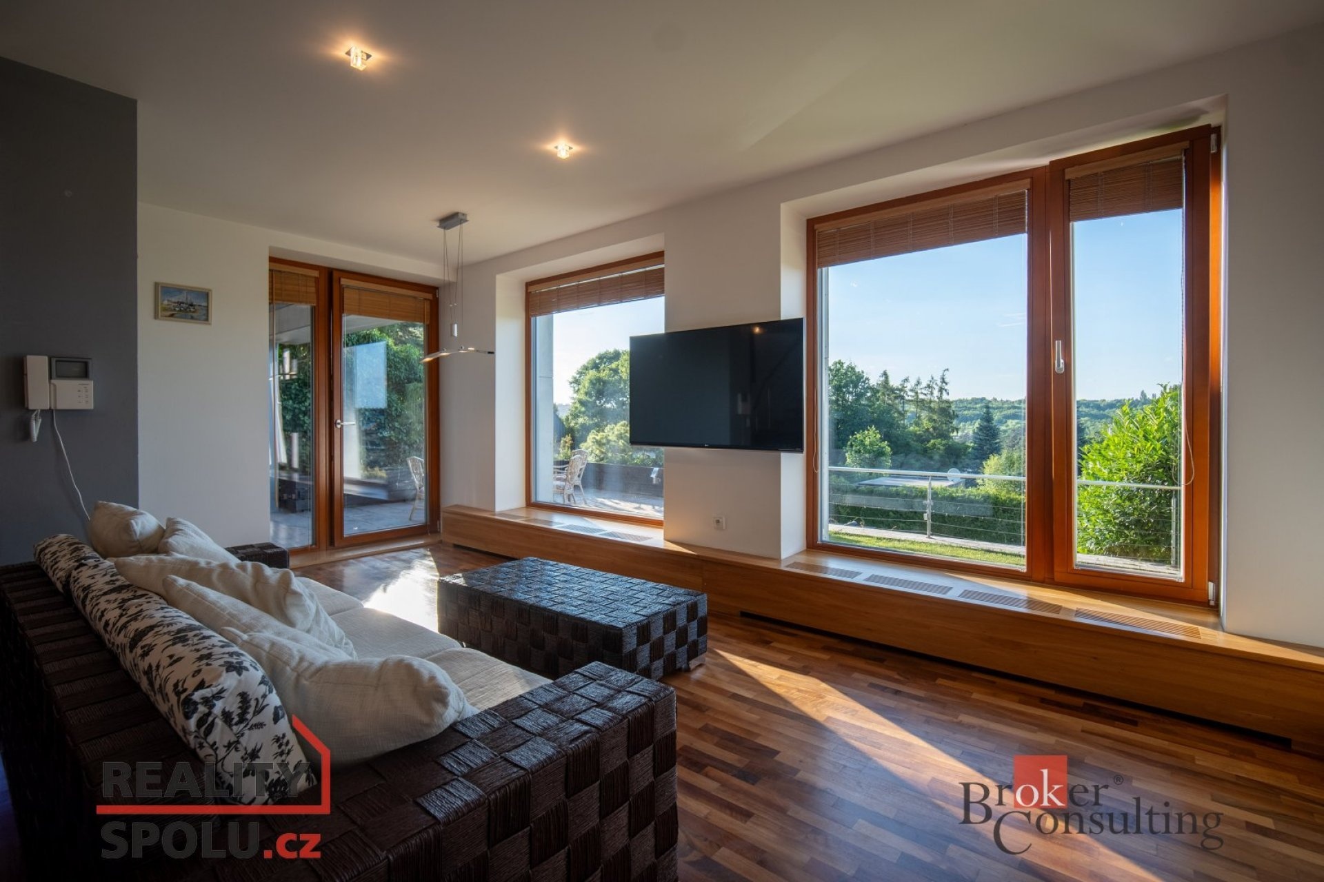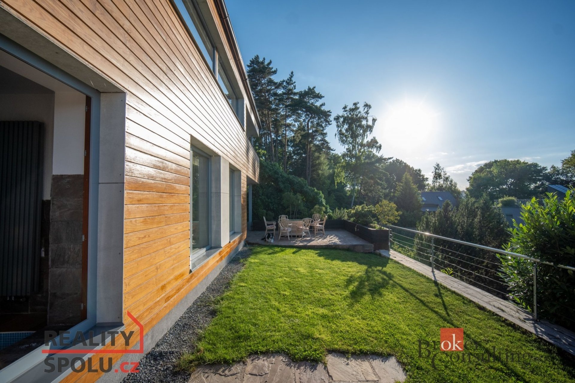 The house has a floor area of almost 200m2 and 2 garages. It stands on a sloping, landscaped plot (723 m²) with mature trees and at the end of street Za Mototechnou. Due to the fact that the house stands on the upper part of the plot (above the garage), you have amazing views both from the ground floor, where there is a large terrace and part of the garden, and of course also from the first floor of the house.