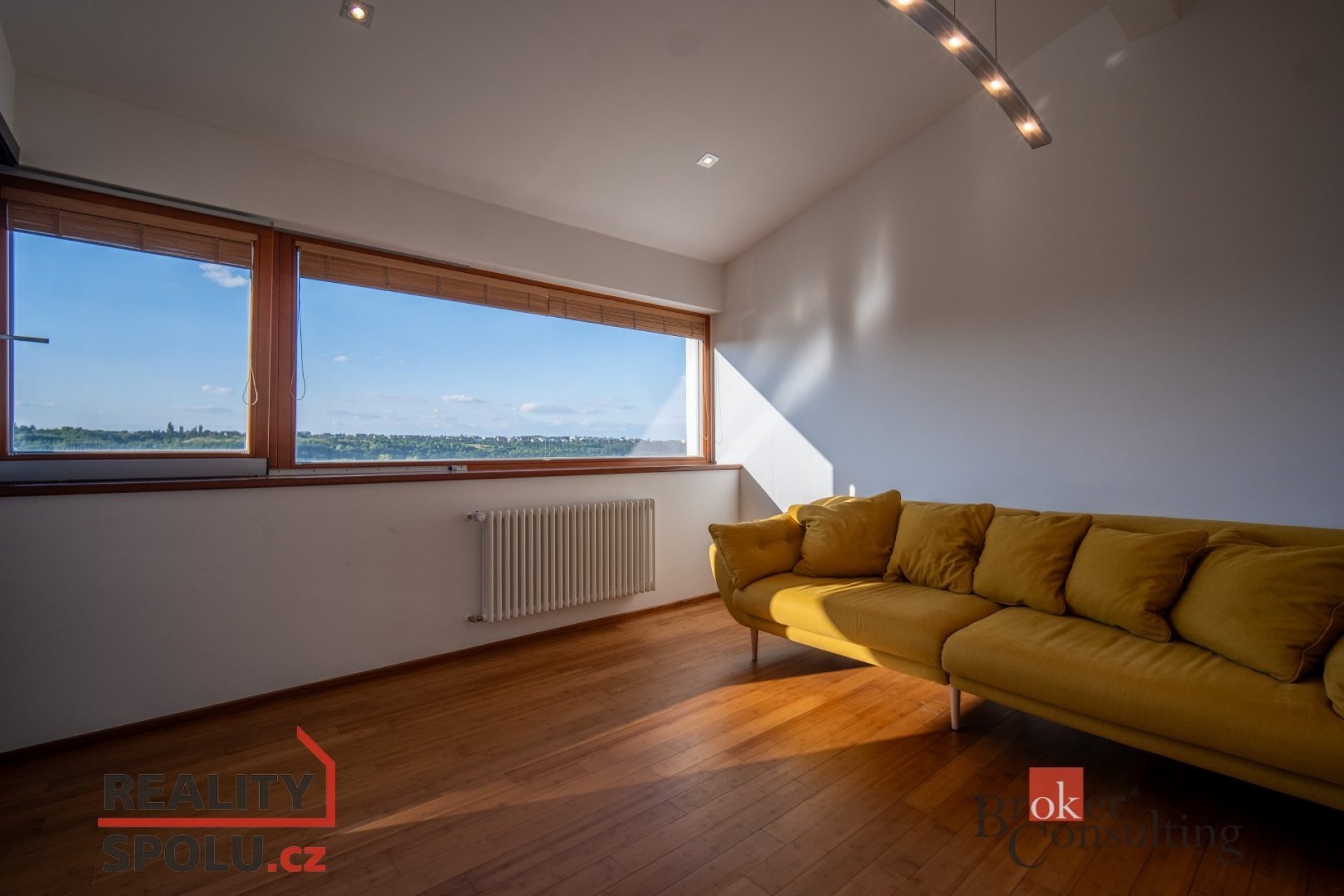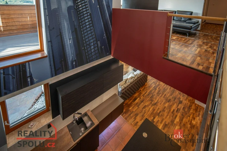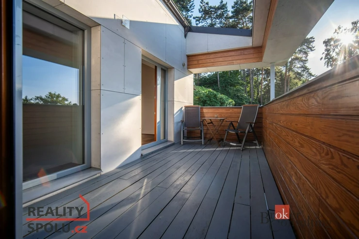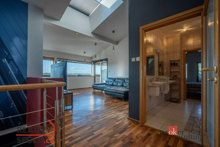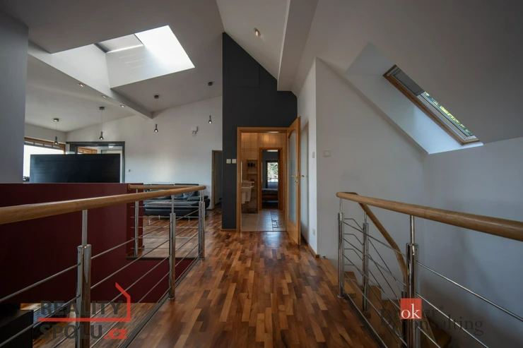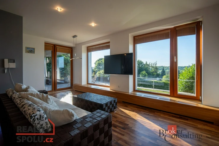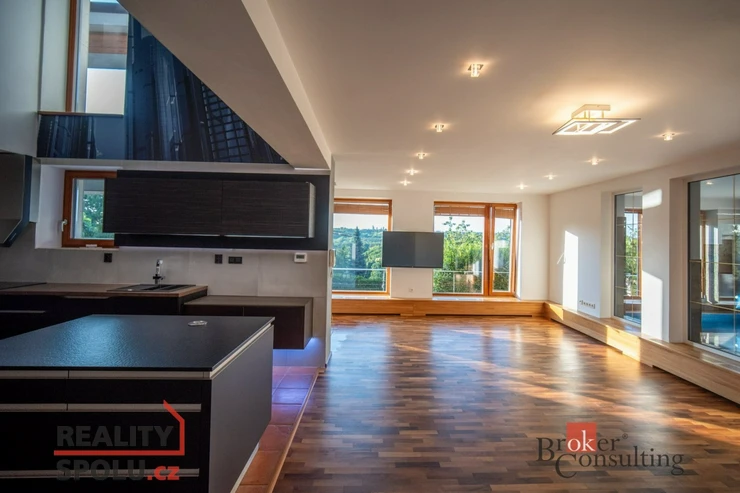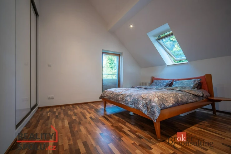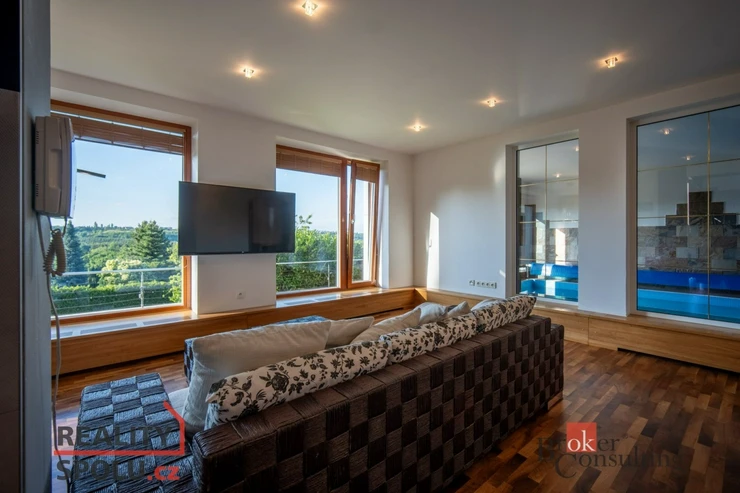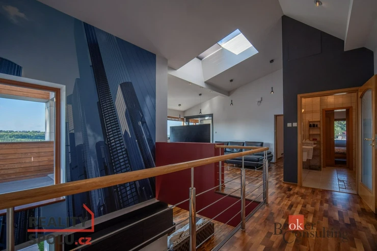 On the ground floor of the house there is a large living room with a kitchen, a bathroom and an entrance to another part of the house where there is an indoor pool and an infrared sauna. This part of the house has 100 m2. On the second floor there is an atrium, entrance to three rooms, a terrace and a bathroom. The master bedroom has a separate entrance to the bathroom. The floors are wooden and the rooms have built-in wardrobes. The glazing along the entire length of the northwest wall with a view of part of Prague 5 and beyond – Motol, Ladronka and all the way to Břevnov is amazing.