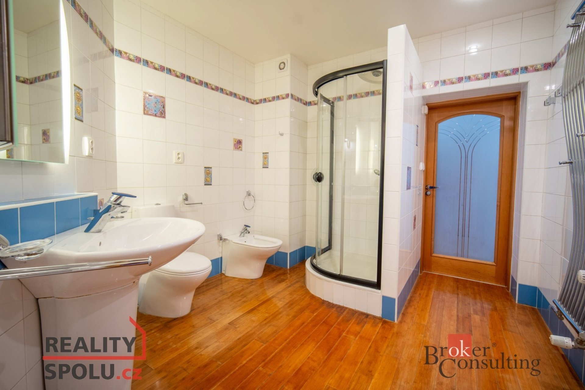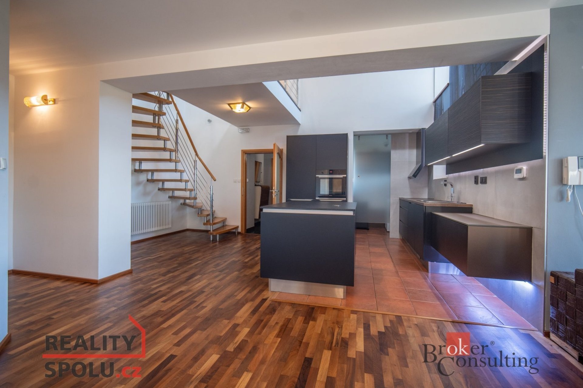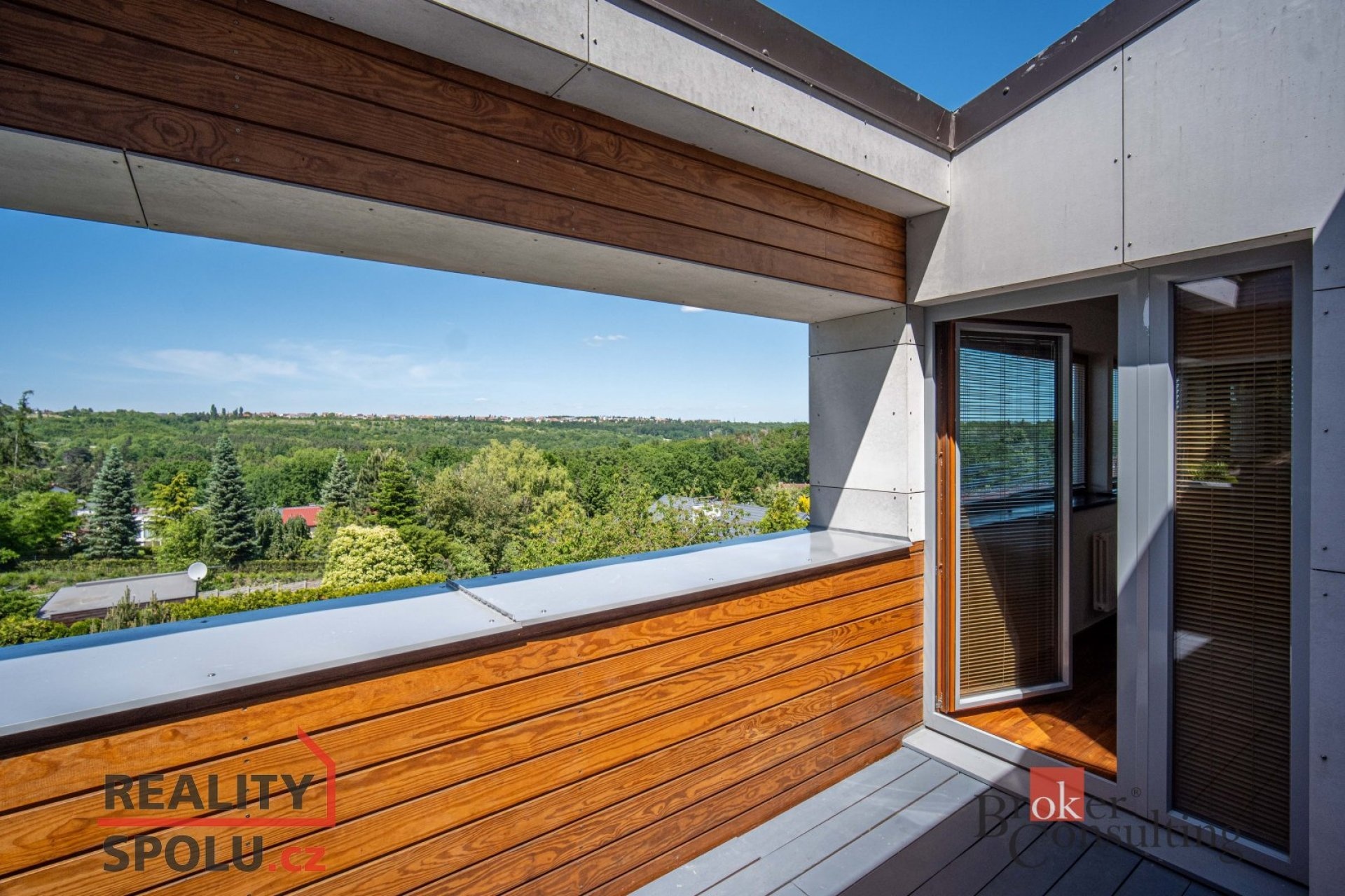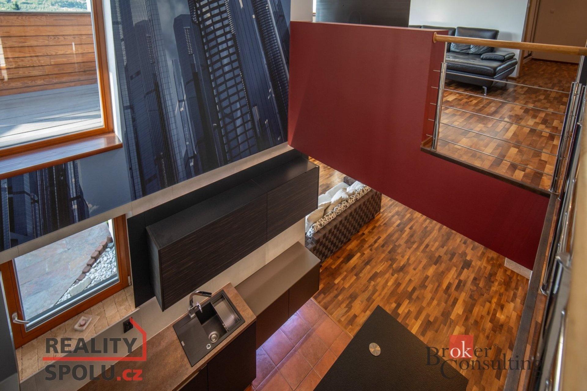 On the ground floor of the house there is a large living room with a kitchen, a bathroom and an entrance to another part of the house where there is an indoor pool and an infrared sauna. This part of the house has 100 m2. On the second floor there is an atrium, entrance to three rooms, a terrace and a bathroom. The master bedroom has a separate entrance to the bathroom. The floors are wooden and the rooms have built-in wardrobes. The glazing along the entire length of the northwest wall with a view of part of Prague 5 and beyond – Motol, Ladronka and all the way to Břevnov is amazing.