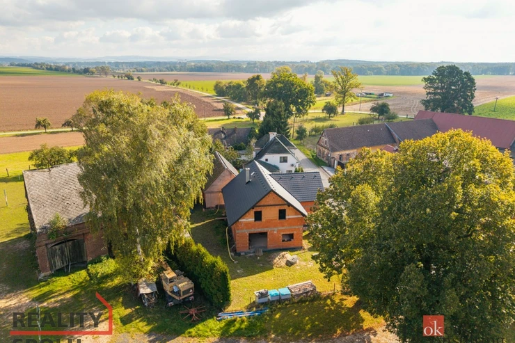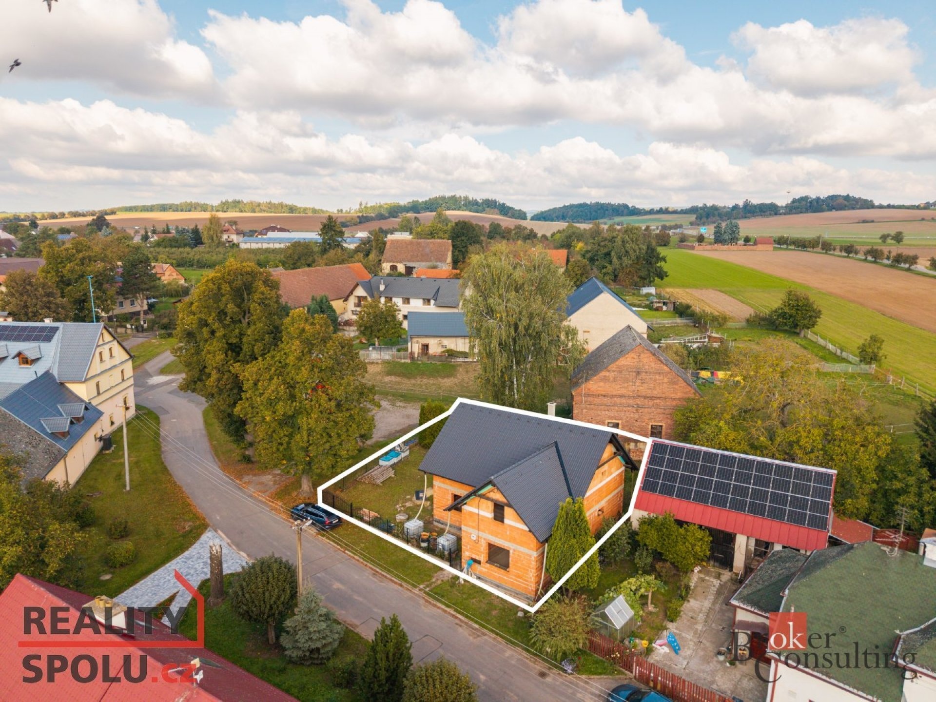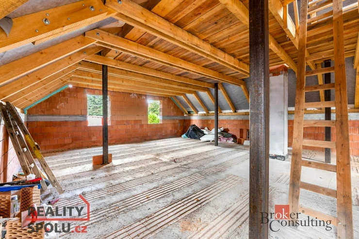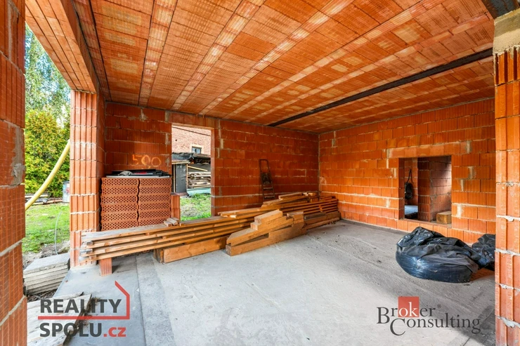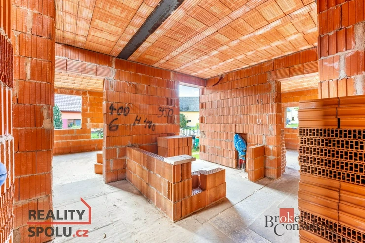 Dvoupodlažní cihlový dům o celkové ploše přibližně 204 m² stojí na pozemku o velikosti 546 m² a je ve fázi hrubé stavby – má vyzděné obvodové i vnitřní zdi a dokončenou střechu. Na pozemku jsou kompletní inženýrské sítě – vodovod, kanalizace, elektřina i plyn – a k dispozici je kompletní projektová dokumentace, která umožňuje dokončit dům podle původního návrhu nebo upravit detaily dle vlastních představ.