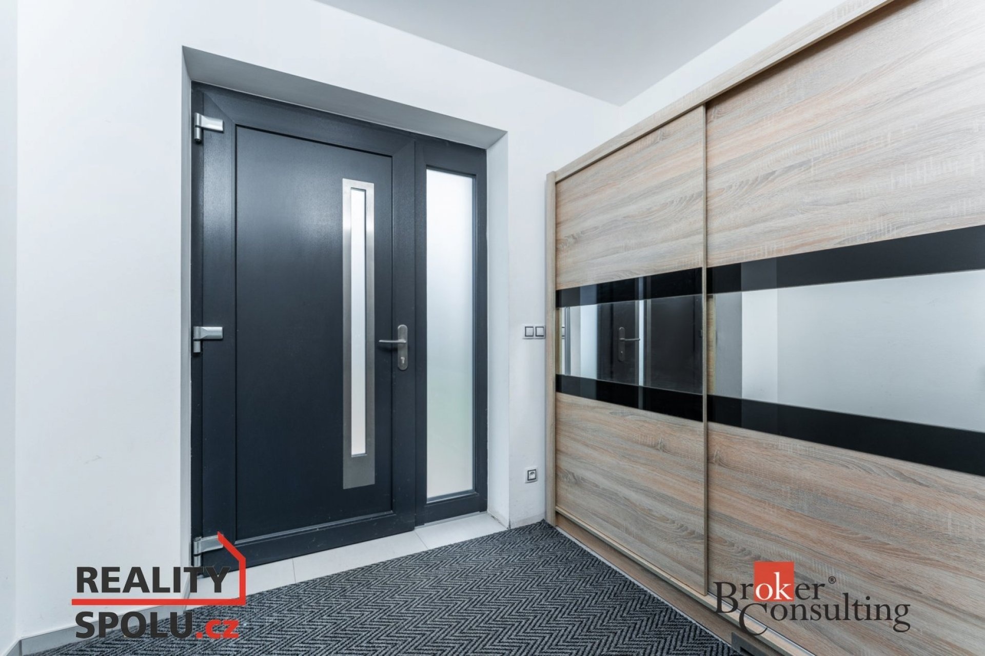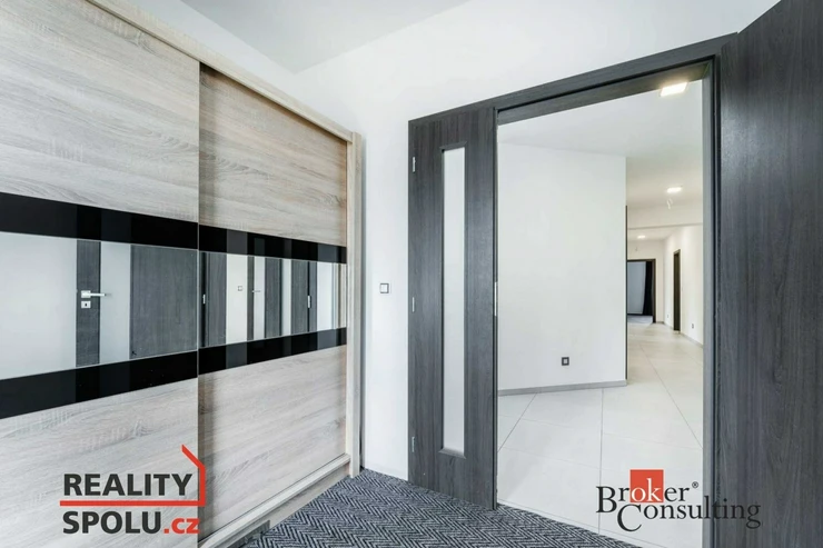 Dům je promyšleně rozdělen do denní a noční zóny. Z prostorné vstupní haly se dostanete do hlavní obytné části – světlého obývacího pokoje s krbem, navazujícího na moderní kuchyň s jídelním koutem. Z obývacího pokoje je přímý vstup na hlavní terasu a do zahrady.
