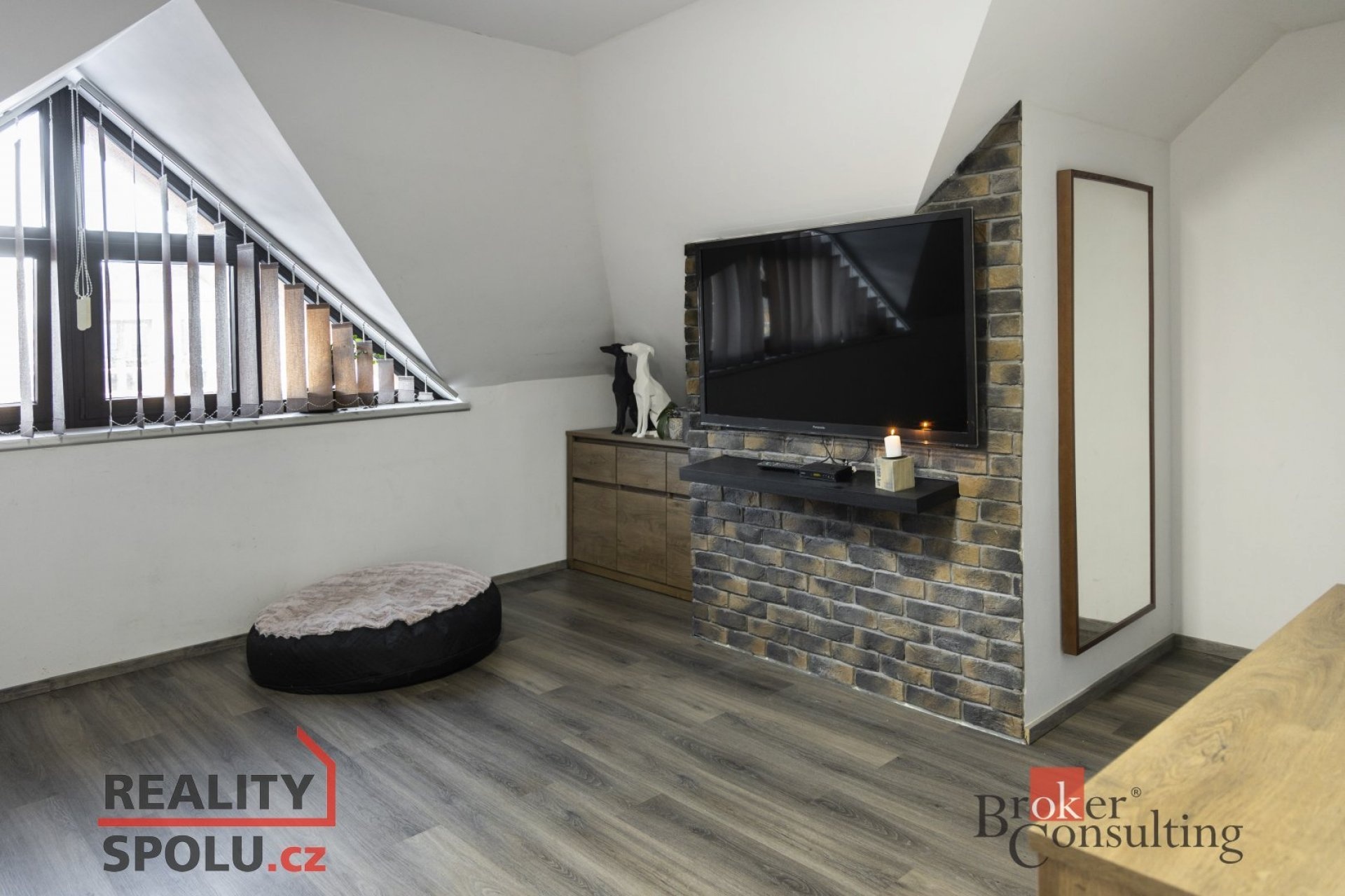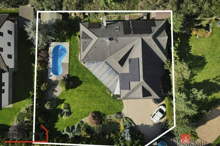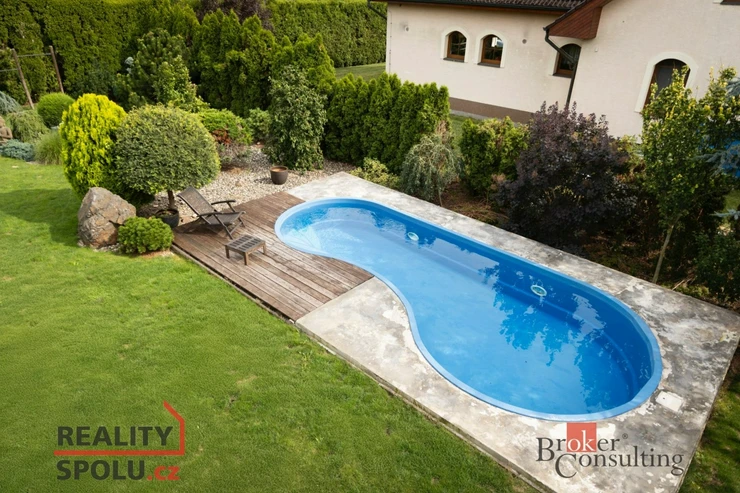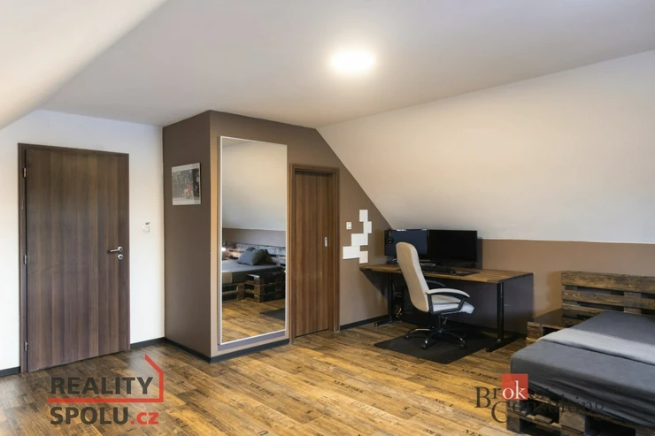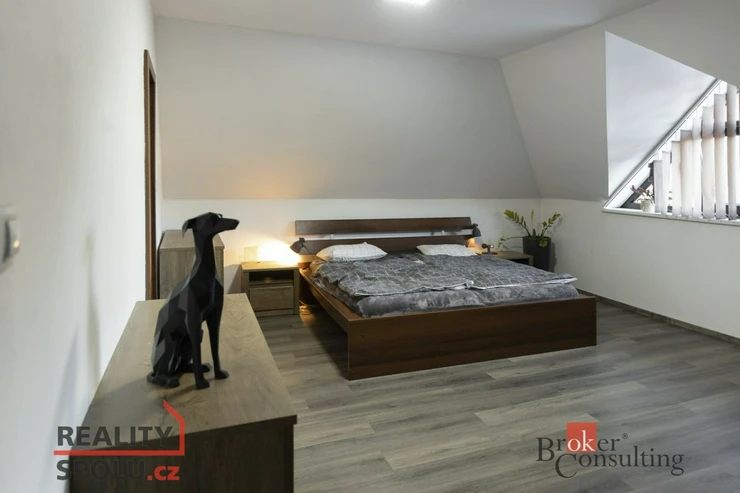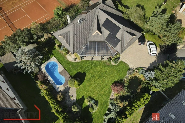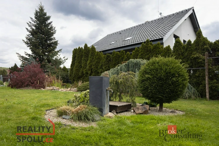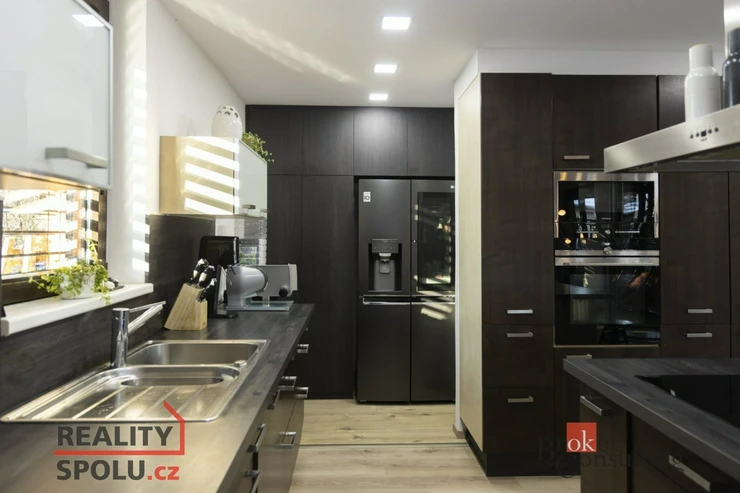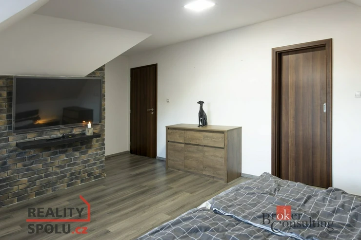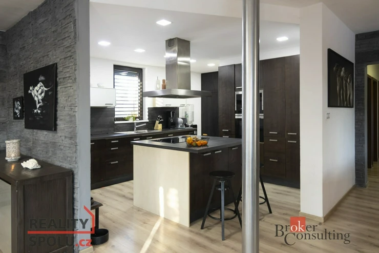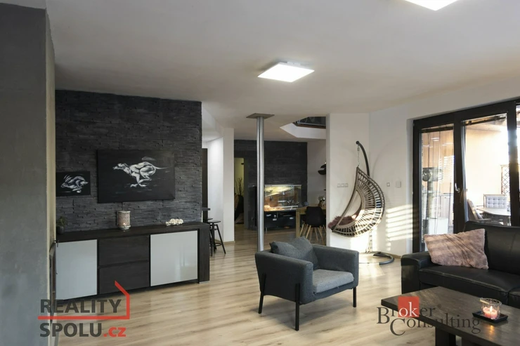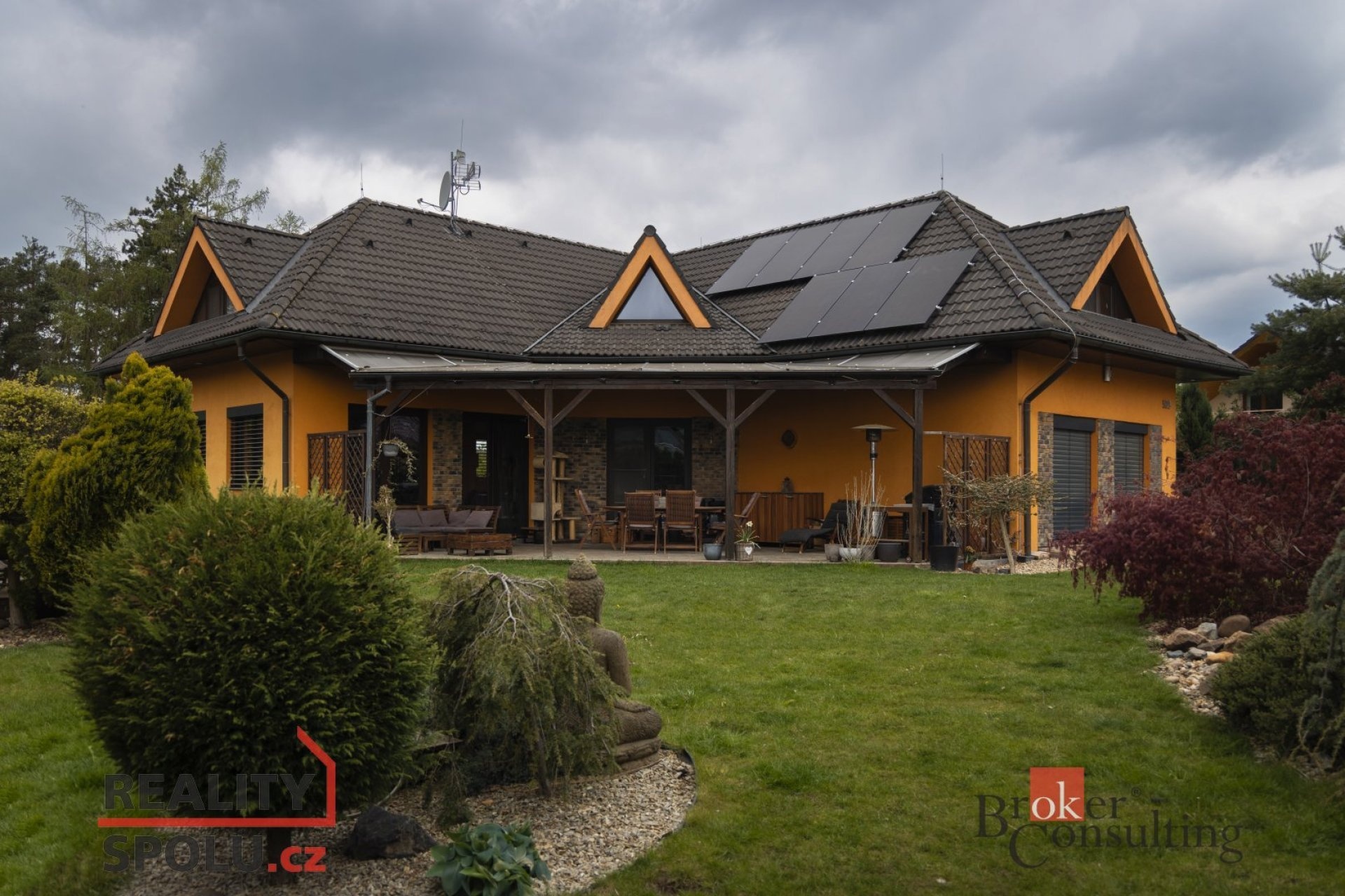 We offer for sale a spacious and modern two-story family house with a 6+1 layout, usable area of 280 m², and built-up area of 162 m². The house is located in a quiet part of the village Hýskov, on a nice plot of 981 m² with an extensive covered terrace of 45 m².