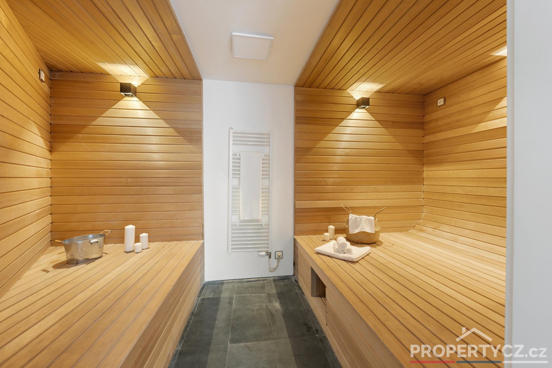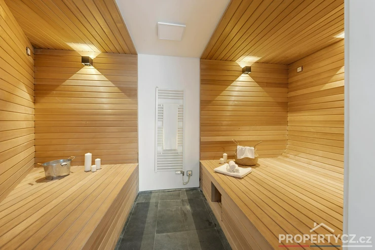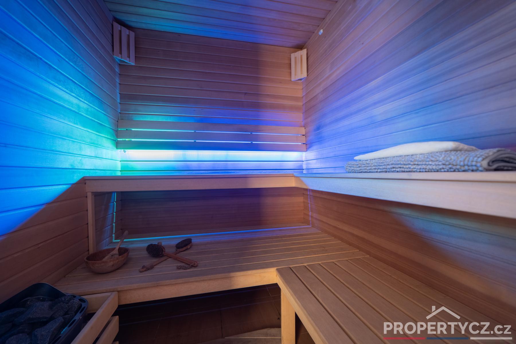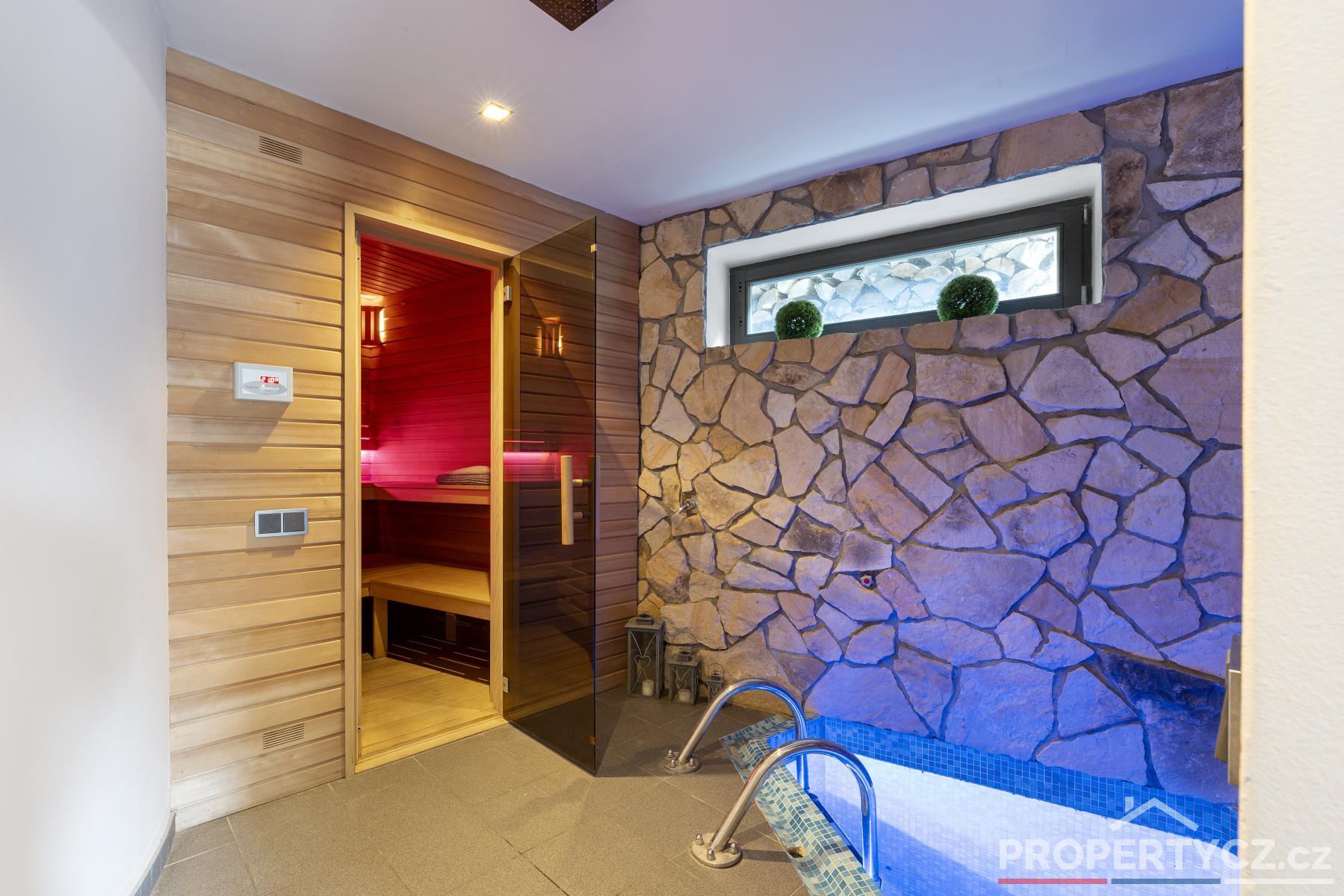 V dalších prostorách přízemí domu naleznete saunu s ochlazovacím jezírkem a sprchou, toaletu, relaxační místnost, vinný sklípek, sklad pro uchovávání věcí a potravin a menší technická místnost na nářadí. Ze zázemí tohoto přízemí můžete rovnou vstoupit na zahradu.